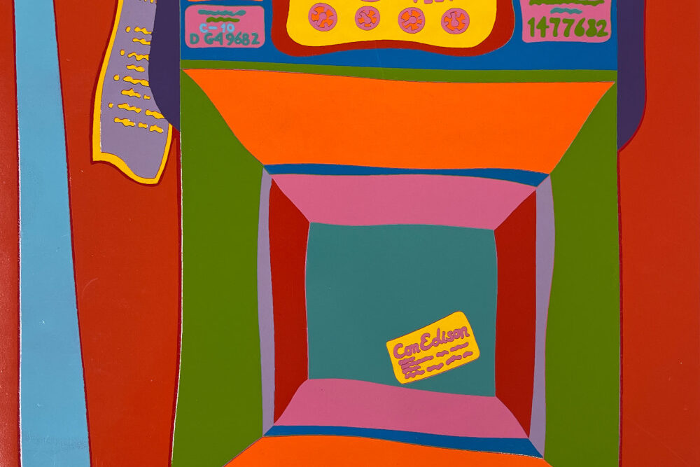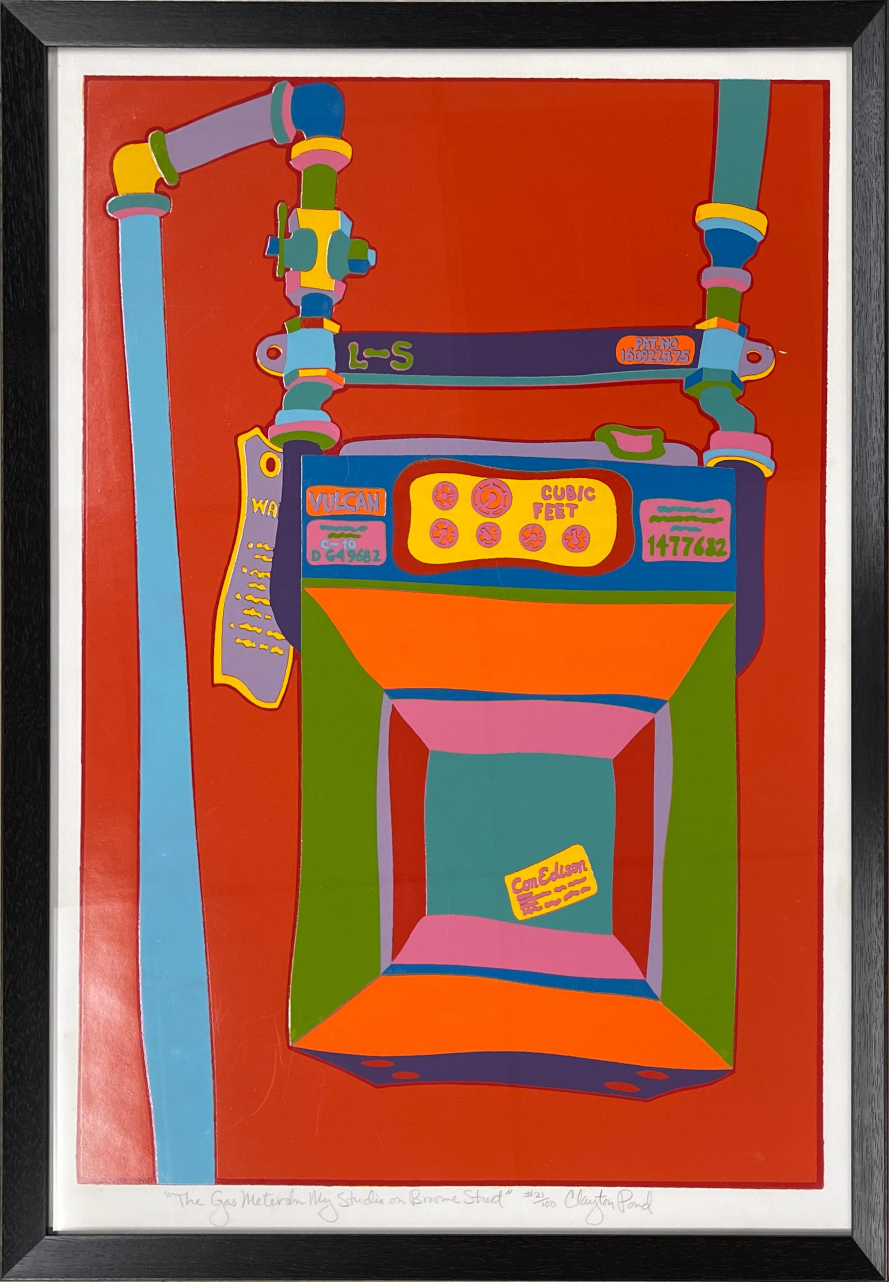 As a second-generation Pop artist, Pond uses a great deal of high-energy color, often outlining his objects in contrasting colors.  He is interested in recording the obsessions and possessions of Americans.  His early prints were close-up depictions of domestic objects such as toasters, telephones, and toilet seats, and, in this case, the gas meter in his apartment.  As Pond put it, “This print of a gas meter exemplifies the artist’s interest in monumentalizing every day man-made objects.”