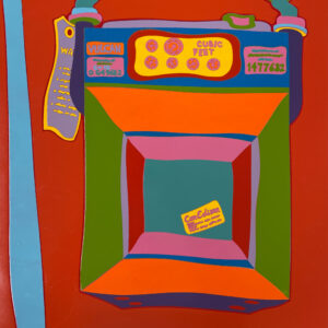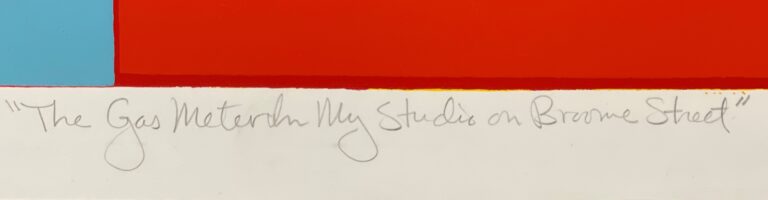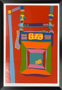 As a second-generation Pop artist, Pond uses a great deal of high-energy color, often outlining his objects in contrasting colors. He is interested in recording the obsessions and possessions of Americans. His early prints were close-up depictions of domestic objects such as toasters, telephones, and toilet seats, and, in this case, the gas meter in his apartment. As Pond put it, “This print of a gas meter exemplifies the artist’s interest in monumentalizing every day man-made objects.”