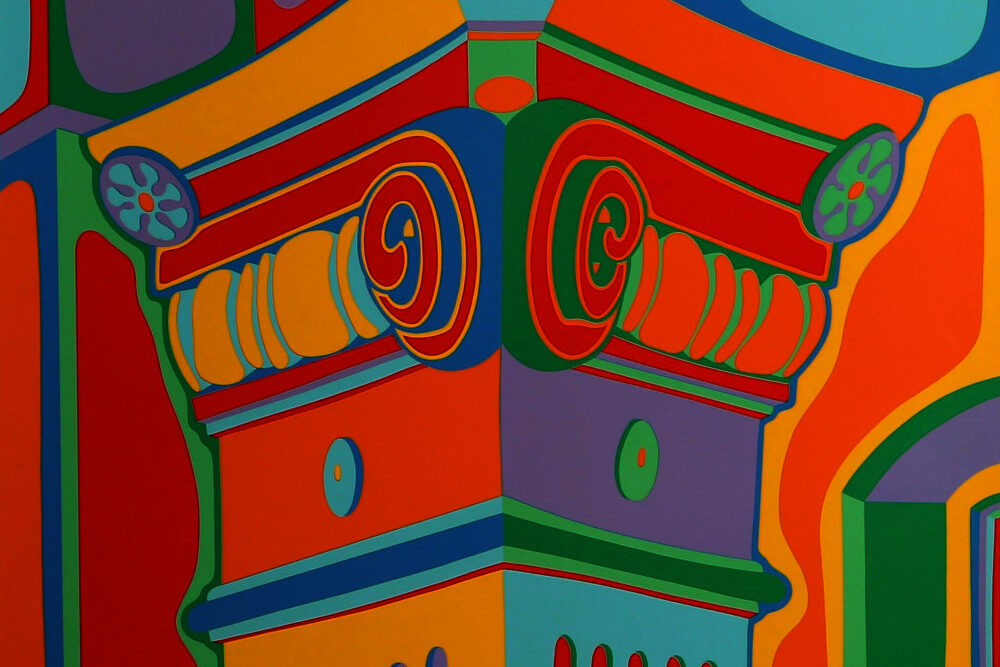 Clayton Pond’s “Capital Ideas” suite is a collection of seven serigraphs that Pond created during the spring, summer, and fall of 1974. Pond was one of the early artists to settle in the SoHo area of New York City, living in his Greene Street studio from 1969 to 1995. He watched as the area changed from a low-rent warehouse district to a dynamic center of the arts. What remained unchanged over those decades was the 100-year-old architecture of SoHo’s cast iron facades. Pond commemorated the beauty of the cast iron architectural details—enhancing them in his colorful way, of course. Every one of the images in the suite is from what Pond could see from the front windows and fire escape of his studio.