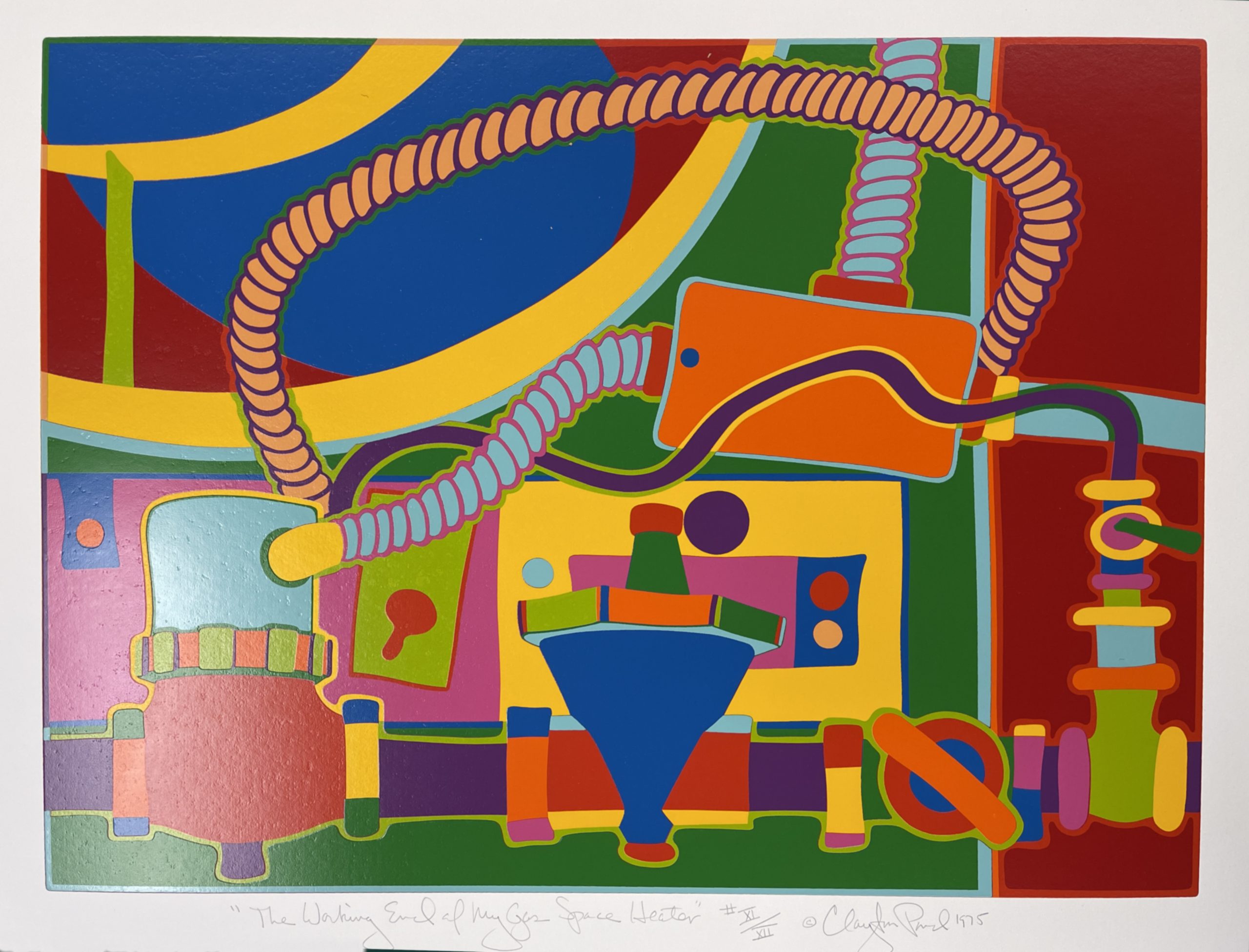 “Lofts in the SoHo section of Manhattan were primarily commercially zoned, and heated by the landlords only during working hours. At night and on weekends the radiators were cold. In the 1960s and 1970s artists began moving into these lofts and were living in them illegally with the tacit approval of landlords who were happy to get whatever rent they could in a soft rental market. Artists had to improvise, installing make-shift kitchens, showers—and heaters. Overhead gas space heaters were commonly used to provide heat. They were loud, vibrated, heated unevenly, and sometimes made a loud popping sound or spewed black carbon. Improperly vented exhaust systems were subject to leaking back into the loft. The artist came to have an intimate relationship with his heater, in terms of the effort put into keeping it working, and in this image he portrays its operational parts.