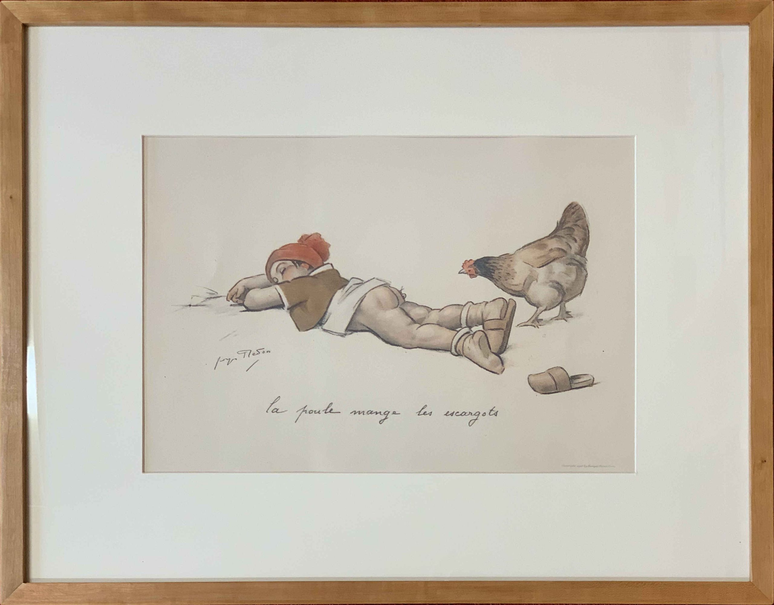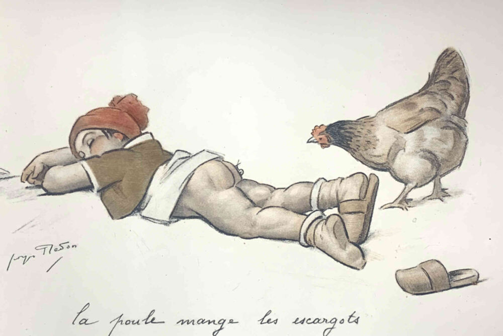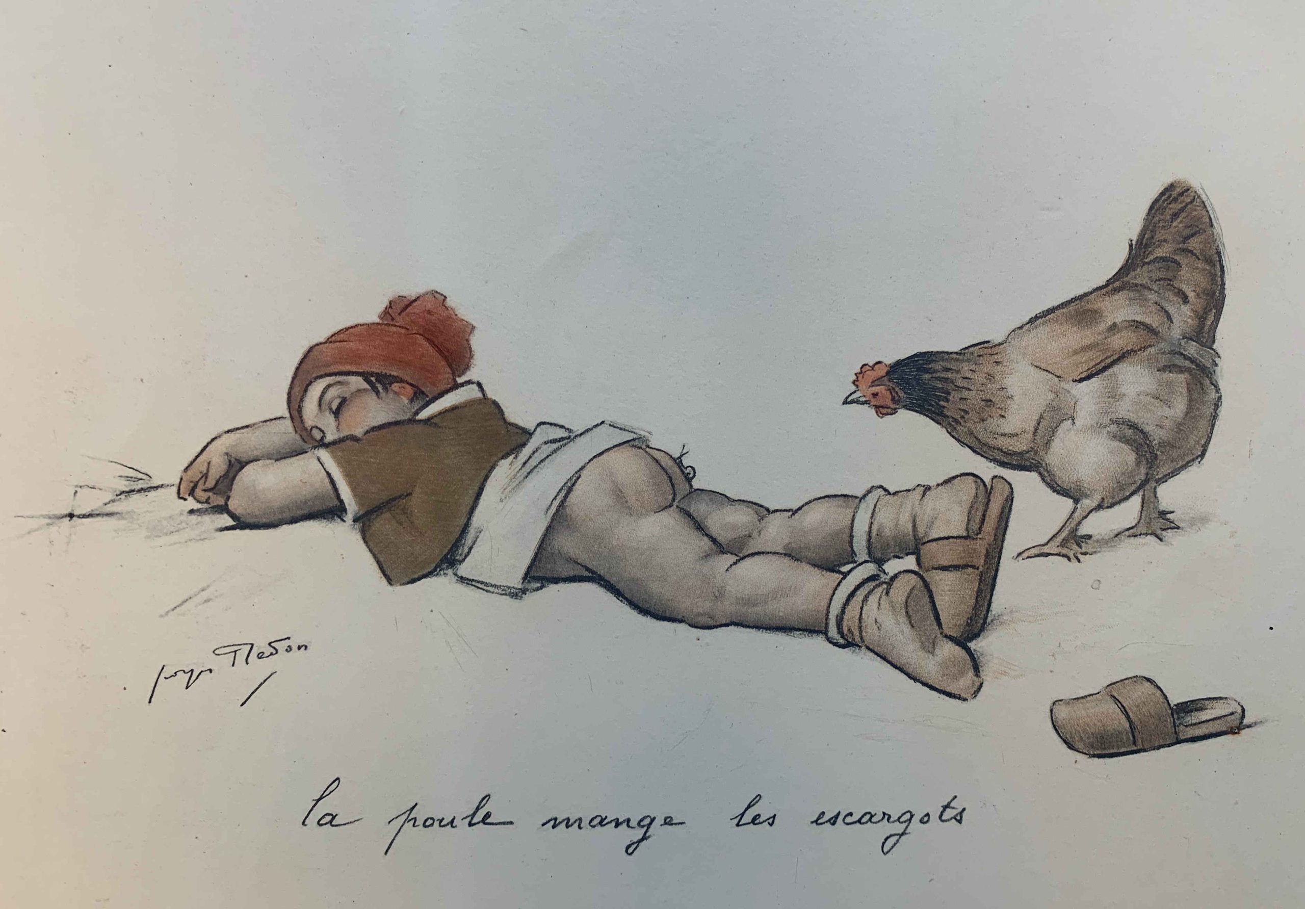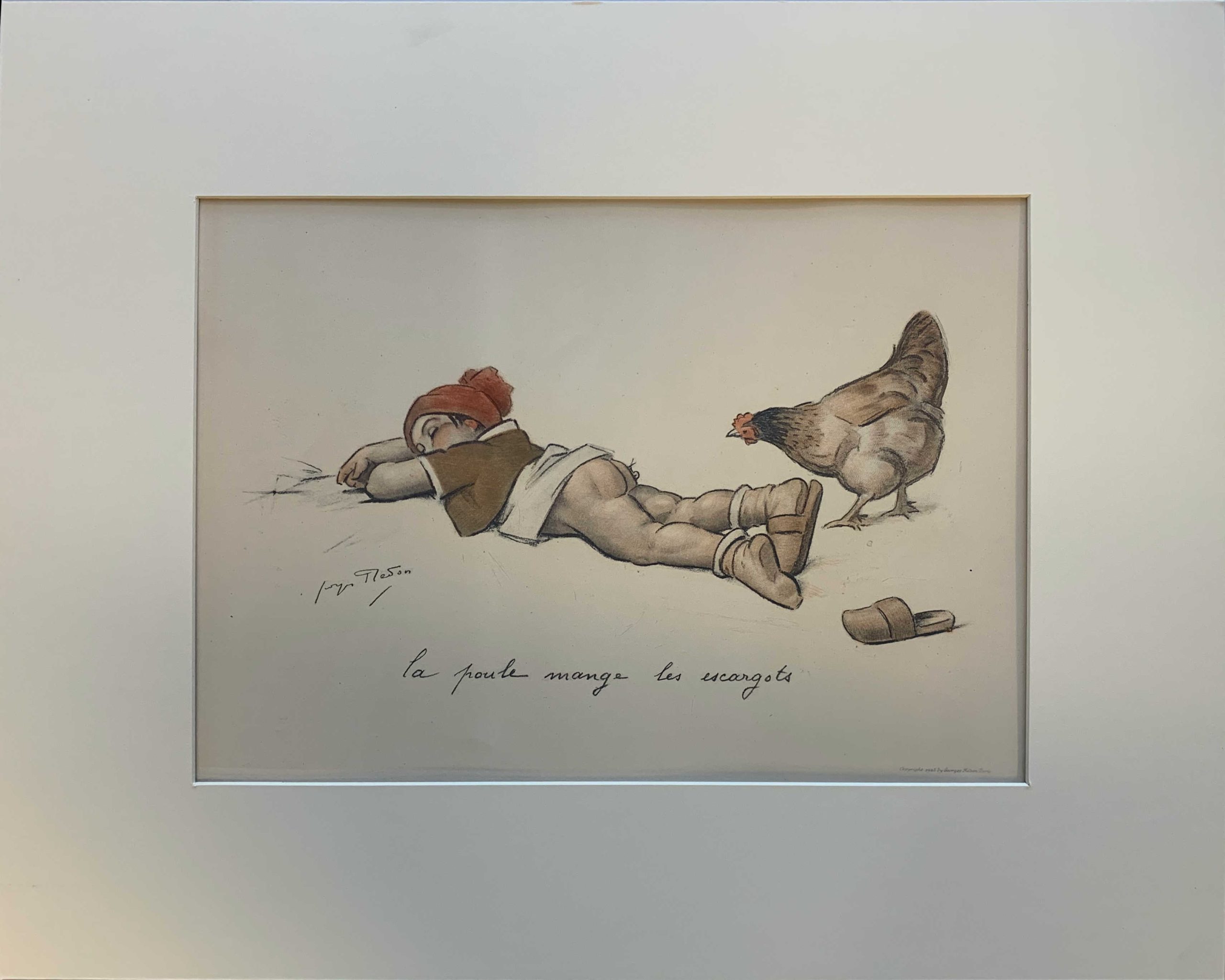 The text to the lower margin reads “la poule mange les escargots” [“The Hen Eats the Snails”].