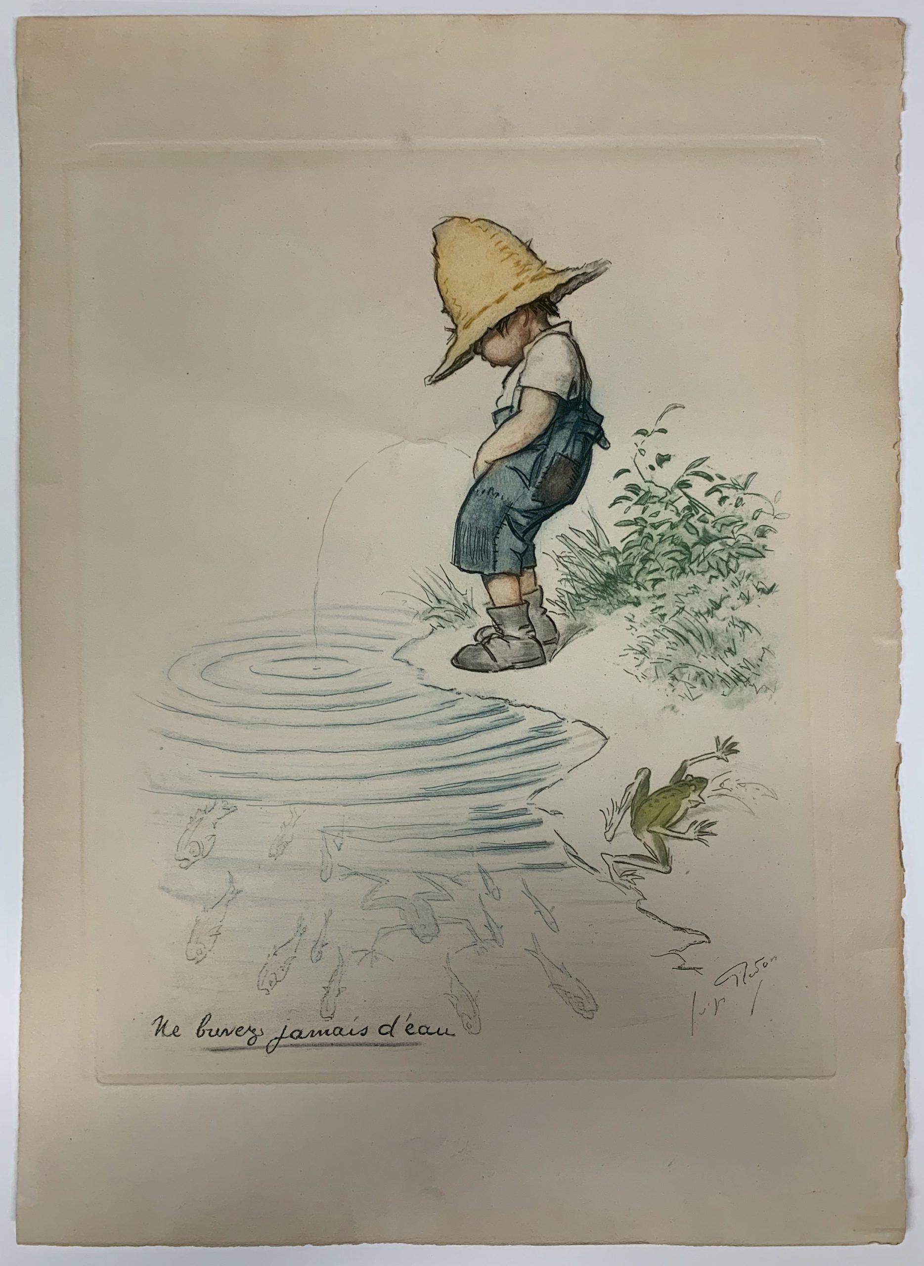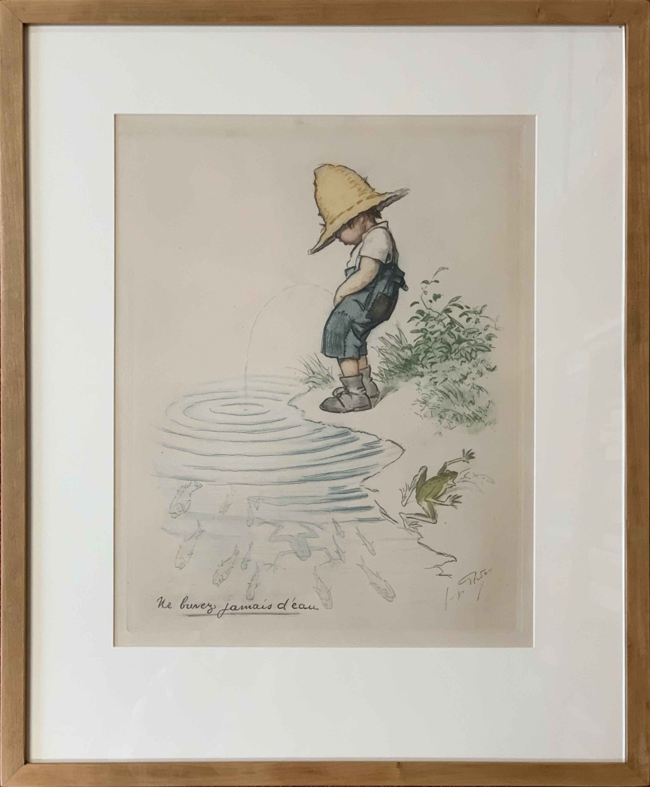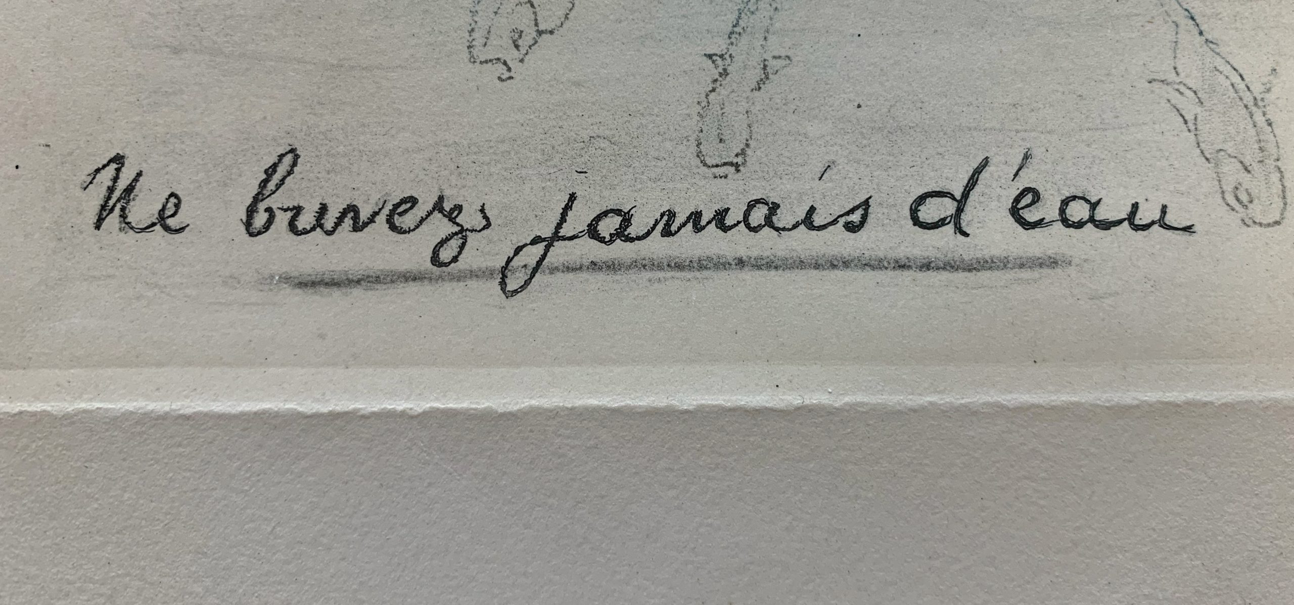 The text to the lower margin reads “Ne buvez jamais d’eau” [“Never drink the water”].