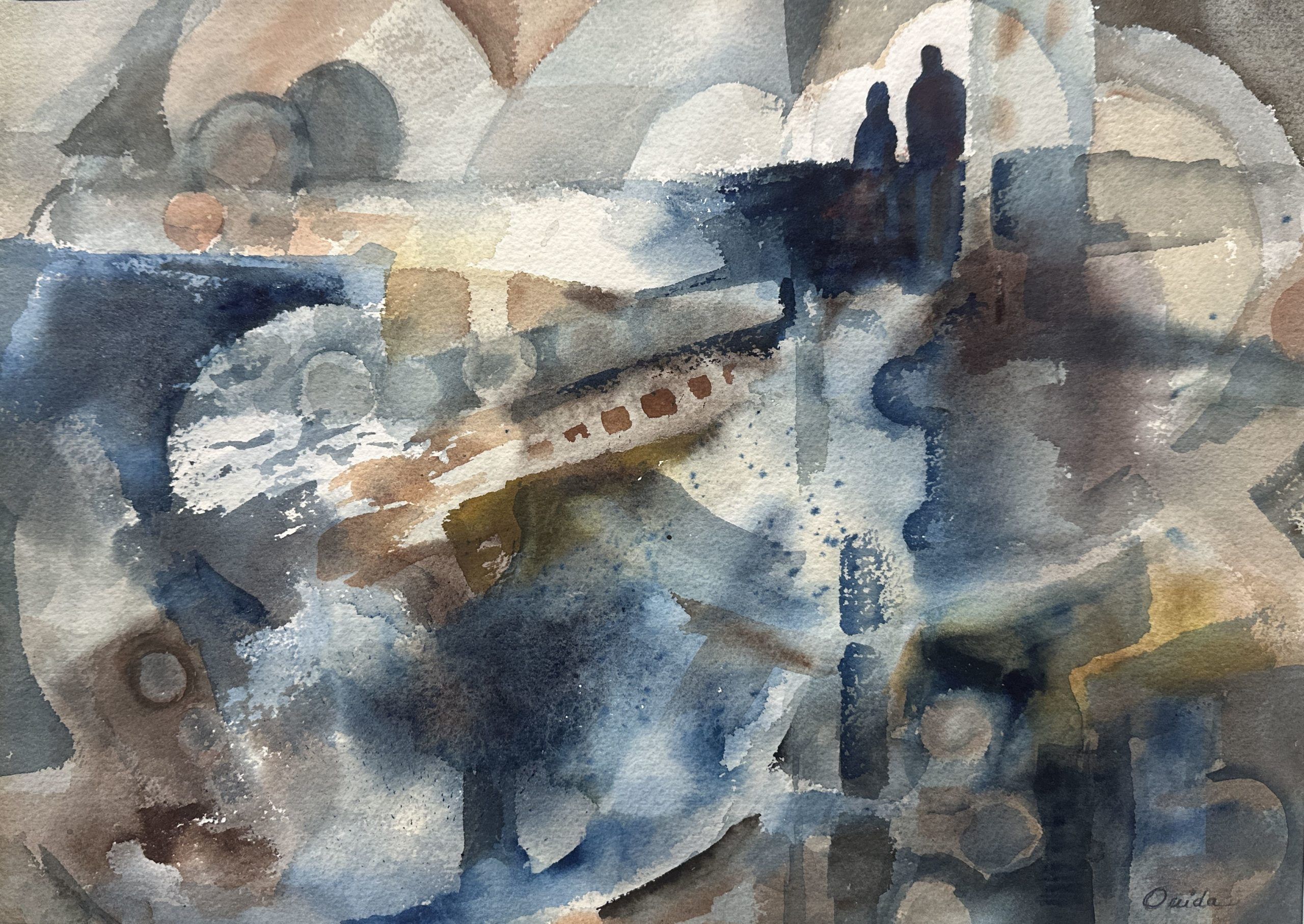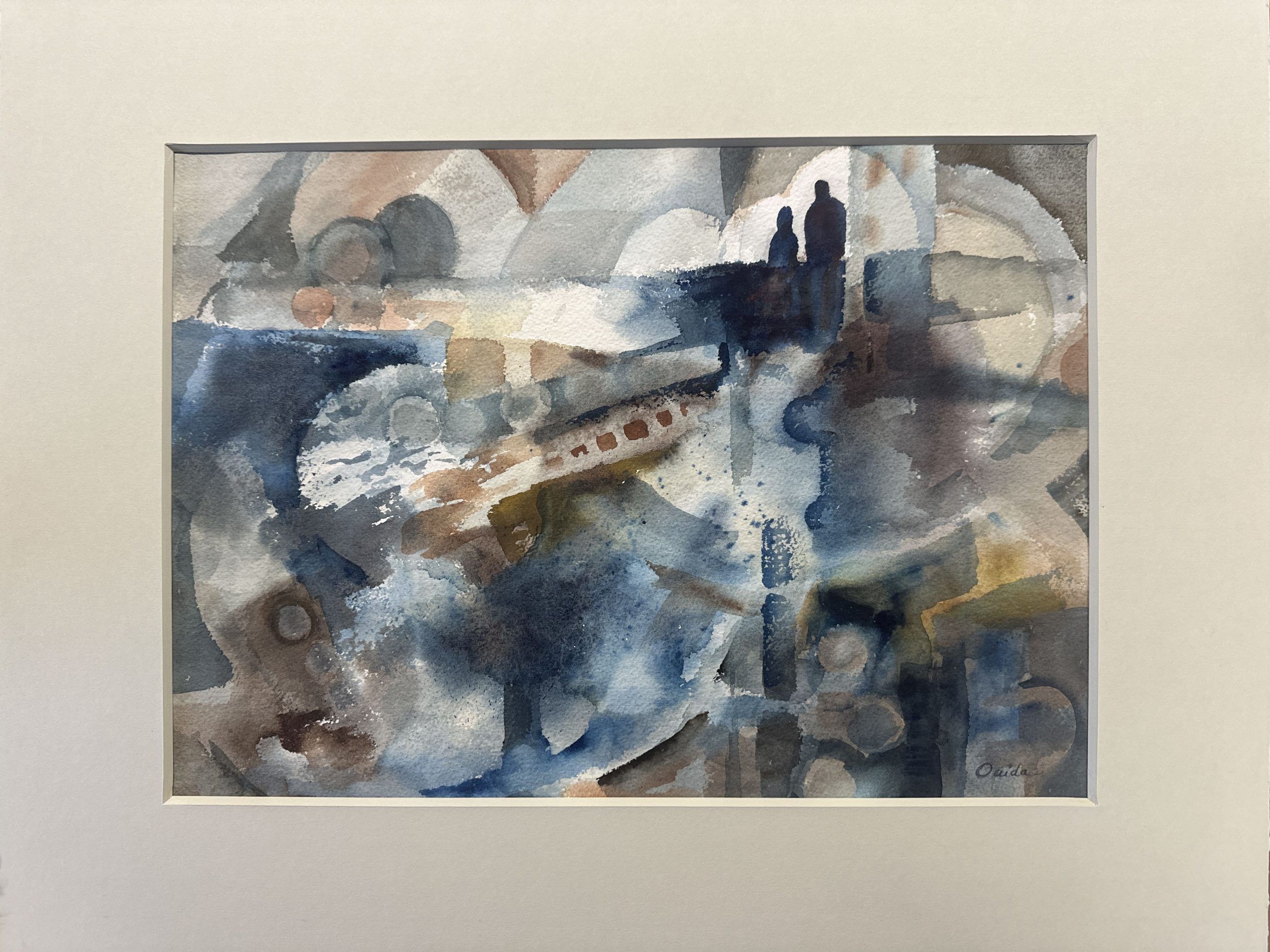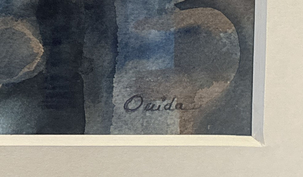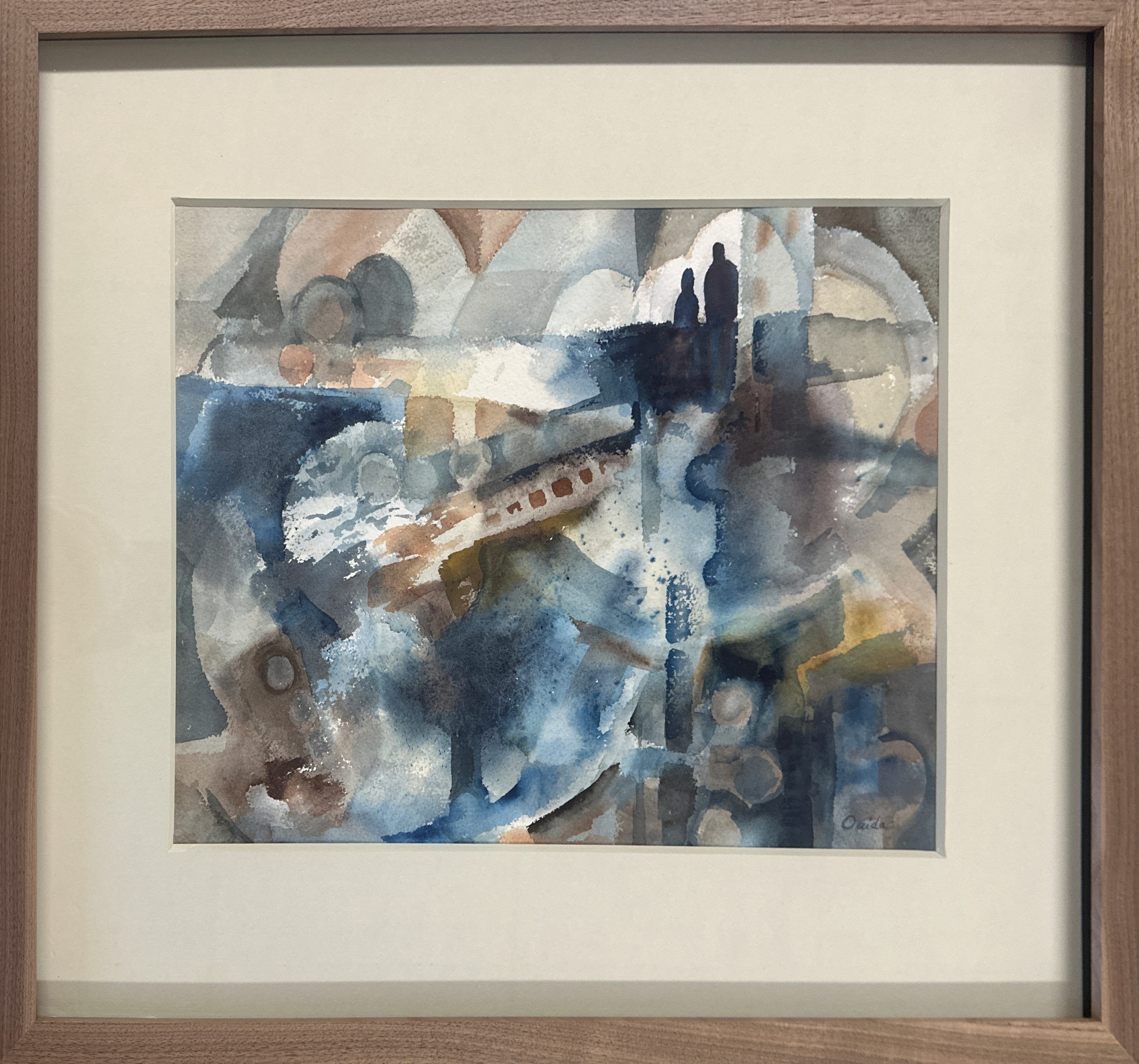 “Look at the paintings of Ouida Reilly and you find joy, beauty, and quiet strength. Meet the artist and you are drawn to this animated and talented being who regards life as a hopeful, exciting challenge.” So reported California art critic Charles Luedtke. This work, though, leaves behind Reilly’s typical impressionism for a more energetic near-abstraction (note the human figures in the upper right), composed with the same pallet as in her impressionist works but deployed rather differently. A fine painting, framed in a natural Walnut frame (18 x 21.5″) using strictly conservation-grade materials behind 99% UV-blocking art glass.