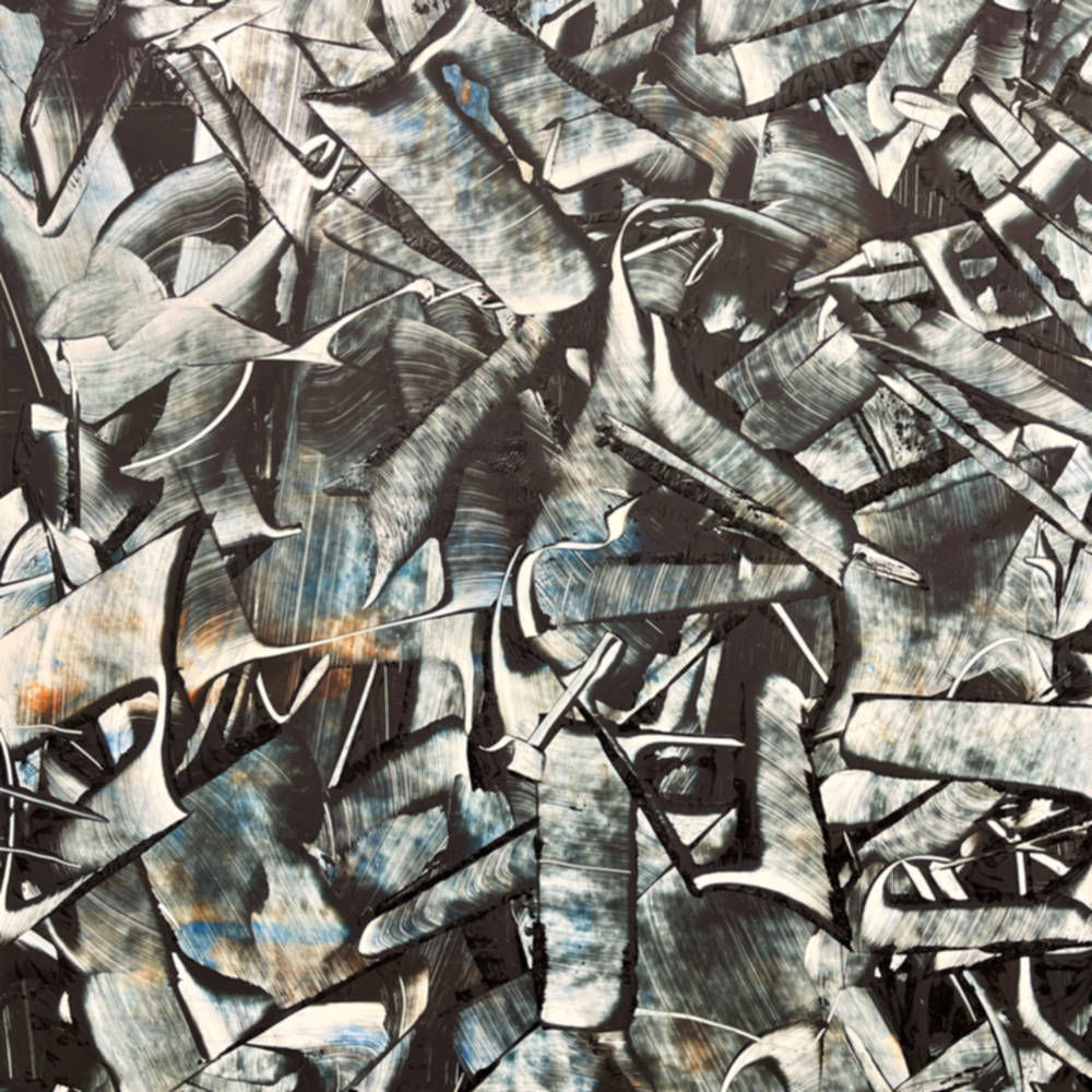 This work is from Edward Renouf’s Infïnites series in which he used what he referred to as “sgraffïto,” a technique of scratching minute scribbles through wet black oil paint with a pin point, revealing tiny traces of the gray acrylic beneath. Emanating from his long fascination with “the aleatory richness of random, often messy, and evidently impulsive quick lines” in Rembrandt’s drawings, Renouf’s planes of tiny jittery gestures culminate as “abstract drawings of a calligraphy that represent nothing but itself.” Renouf has stated: “Philosophically, my INFINITES are an emphatic statement of the unitary nature of existence.” Intensely aware of the Far East’s “aesthetic and intuitive genius and the so convincingly rational philosophical religions,” Renouf approached painting as object and image at once, seeking “the holistic grasp of existential unity” and “paradox without which no profound understanding is possible.”