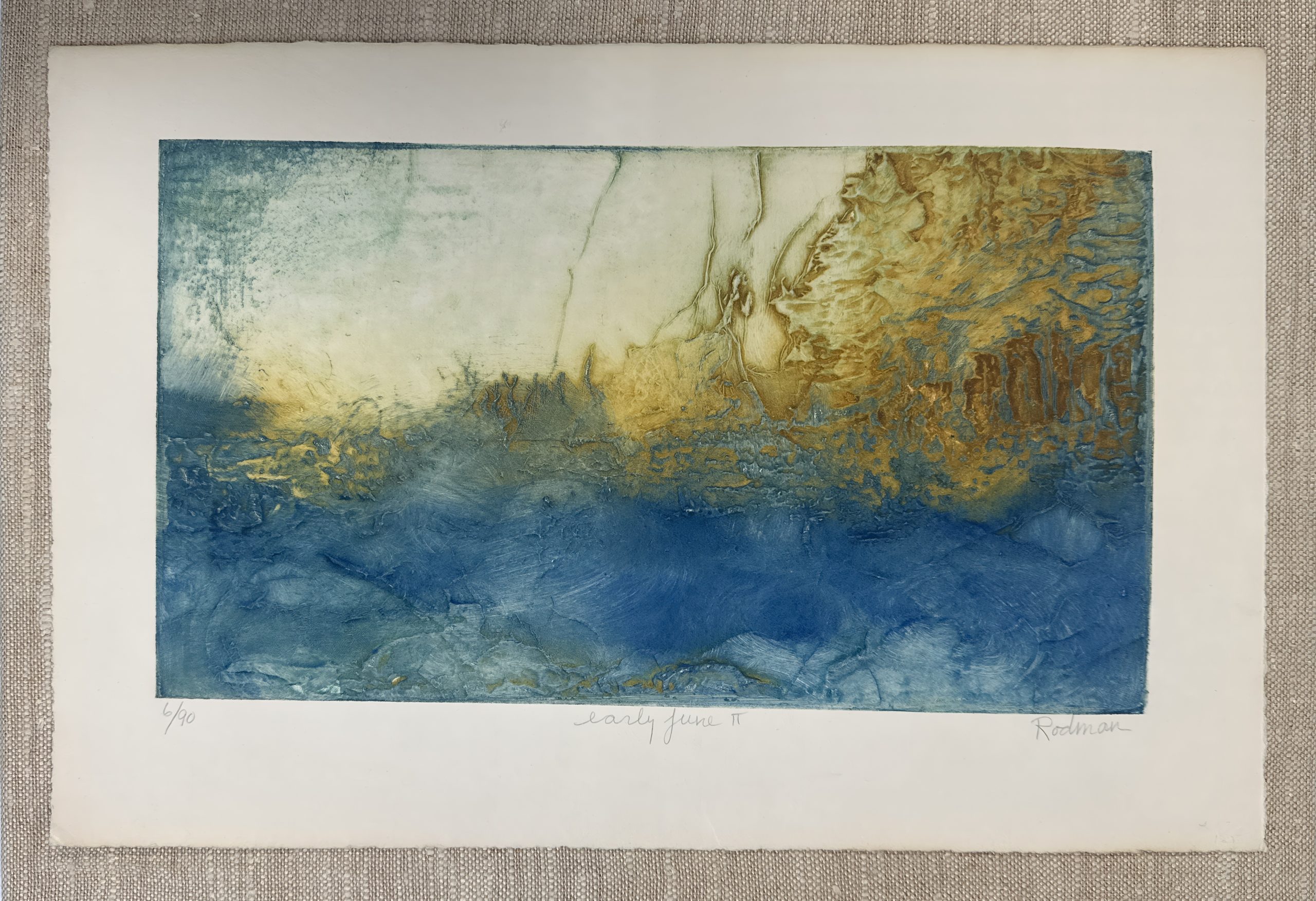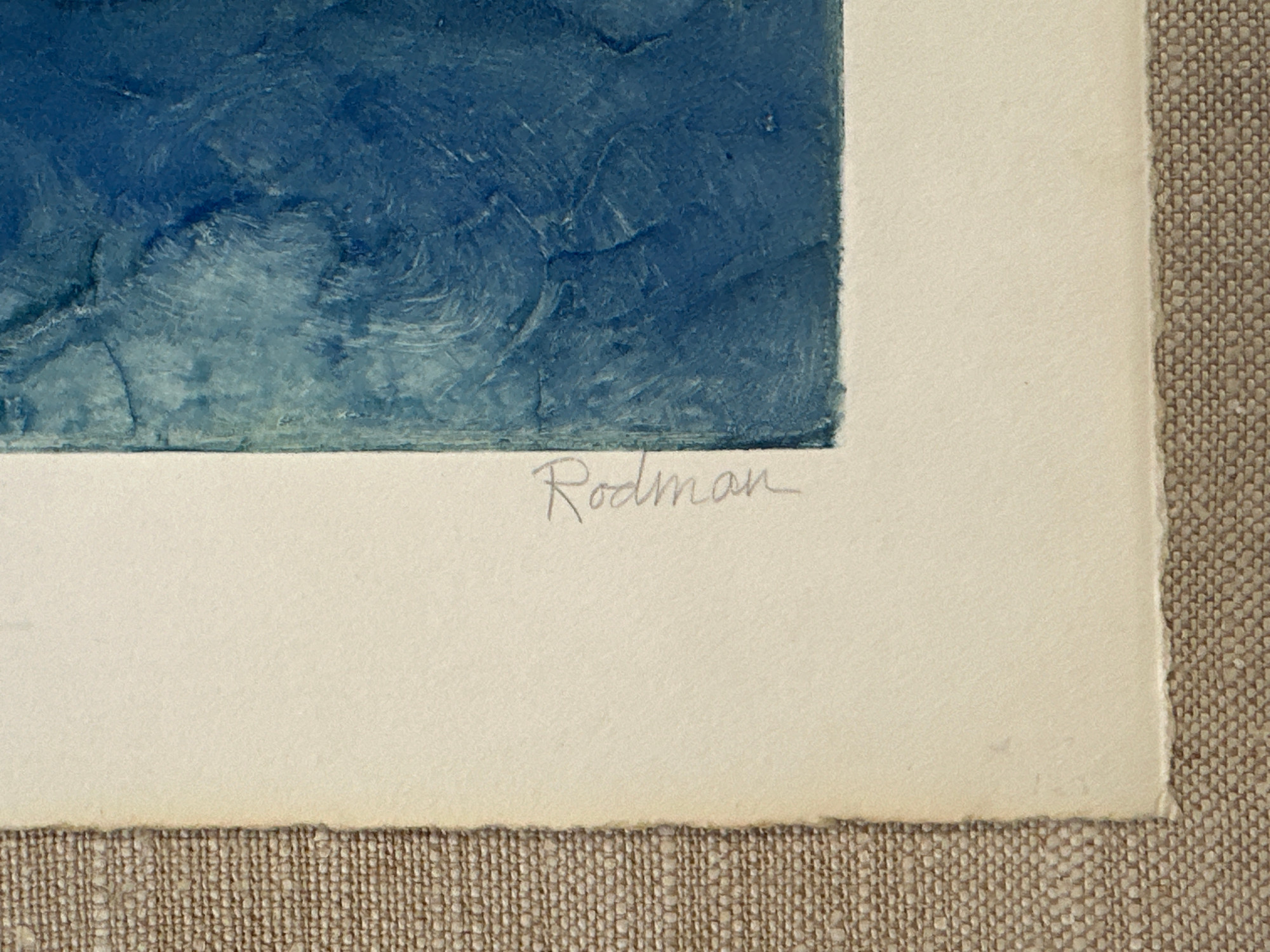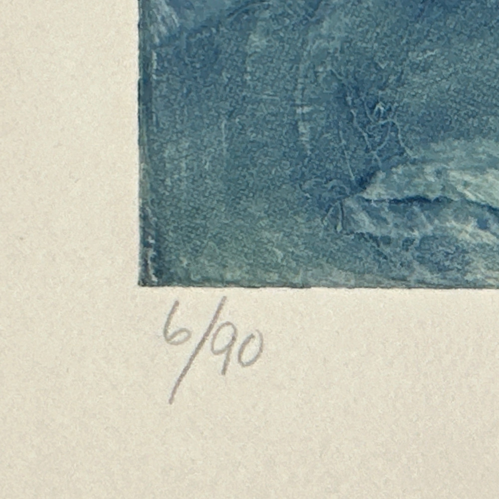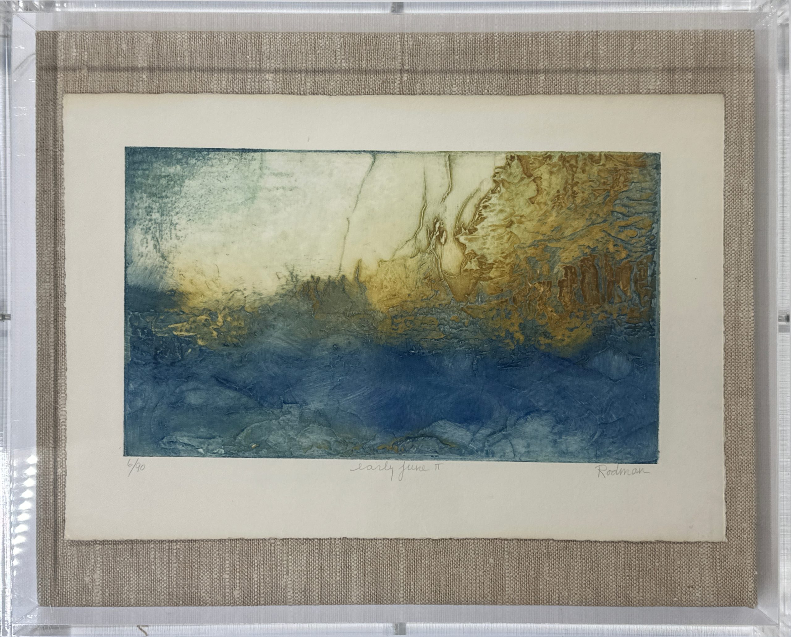 Mounted on a fabric-wrapped board and custom framed in an acrylic box frame.