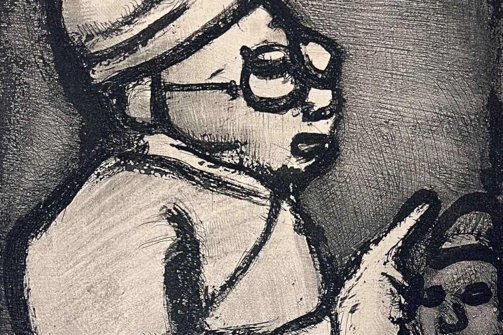 French artist Georges Rouault was a pioneering expressionist painter and a major figure in modern printmaking. His work is immediately recognizable for the thick black brushstrokes that outline their subjects. But rather than create pleasing “armchair” pictures like those of many of his contemporaries, Rouault applied his dramatic and intense painterly style to religious subjects, clowns, and circus performers, using these motifs to reflect on religion, morality, and modern life. The theme of the circus was a major theme in Rouault’s work; he was fascinated by the contrast between the circus’ superficial brightness and the sadness of circus life. This portfolio reflected Rouault’s attempt to strip away the “spangles” of the clown’s costume and reveal the “reflection of paradise lost.”