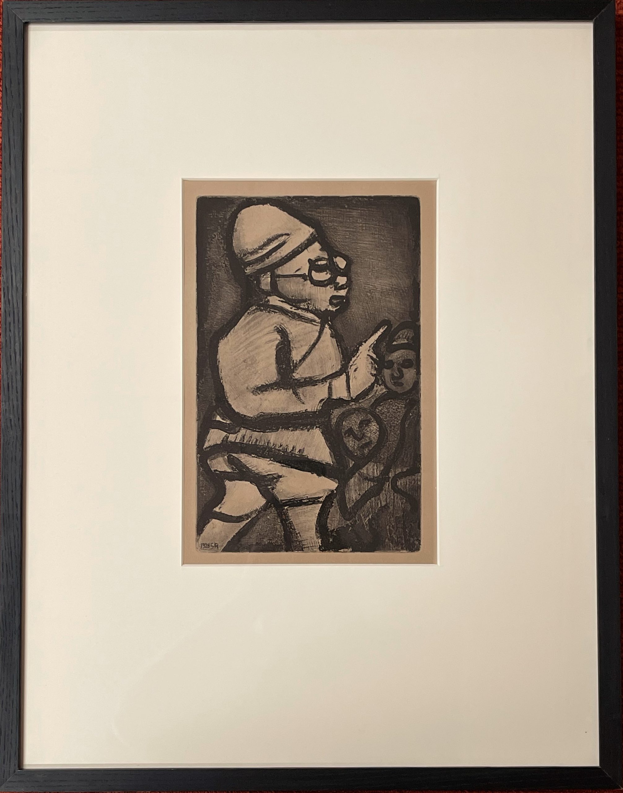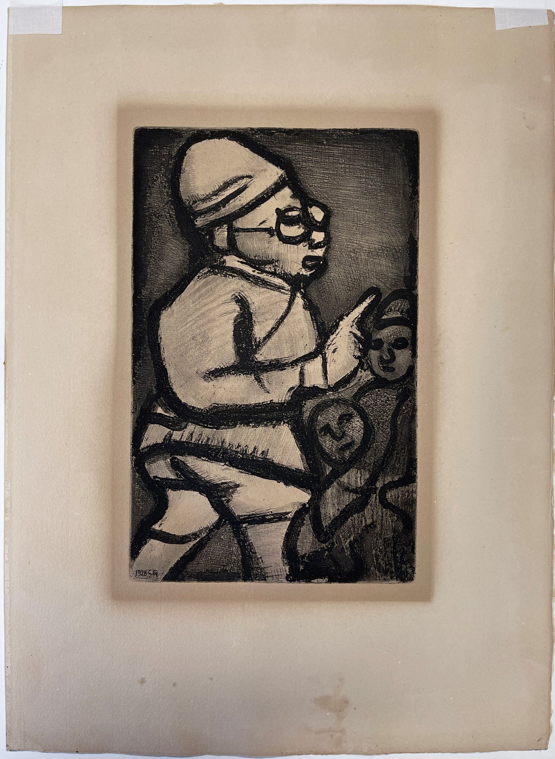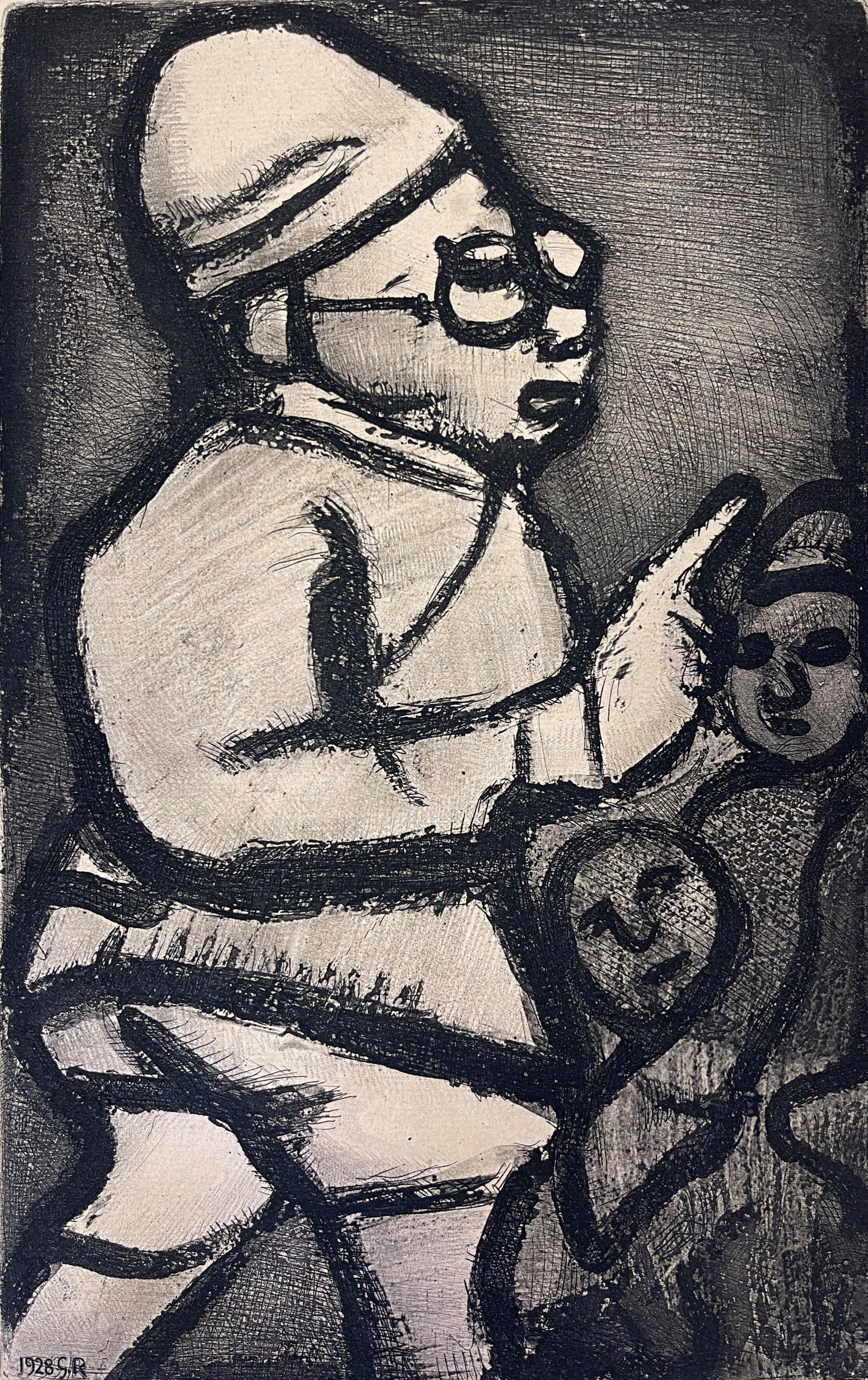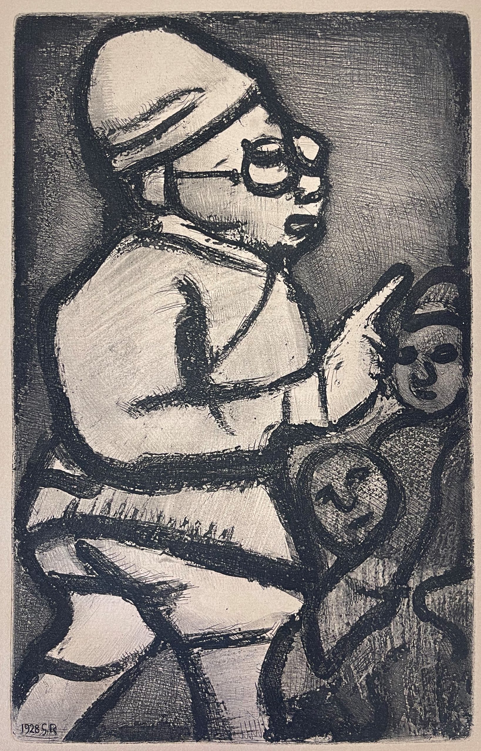 Rouault began working on the Reincarnations of Père Ubu in 1918; he returned to the plate and produced the final version in 1928. It was not published until 1932, though, when an edition of 225 pencil-signed impressions was made along with 305 portfolios for Reincarnations de Père Ubu containing suites of the etchings on Arches and Rives papers.