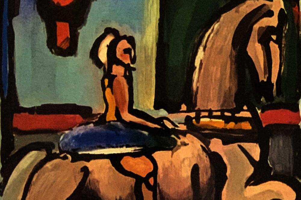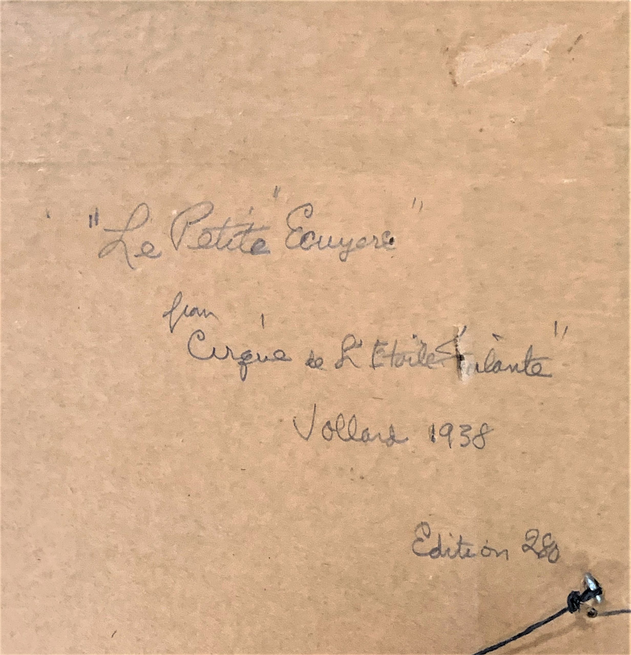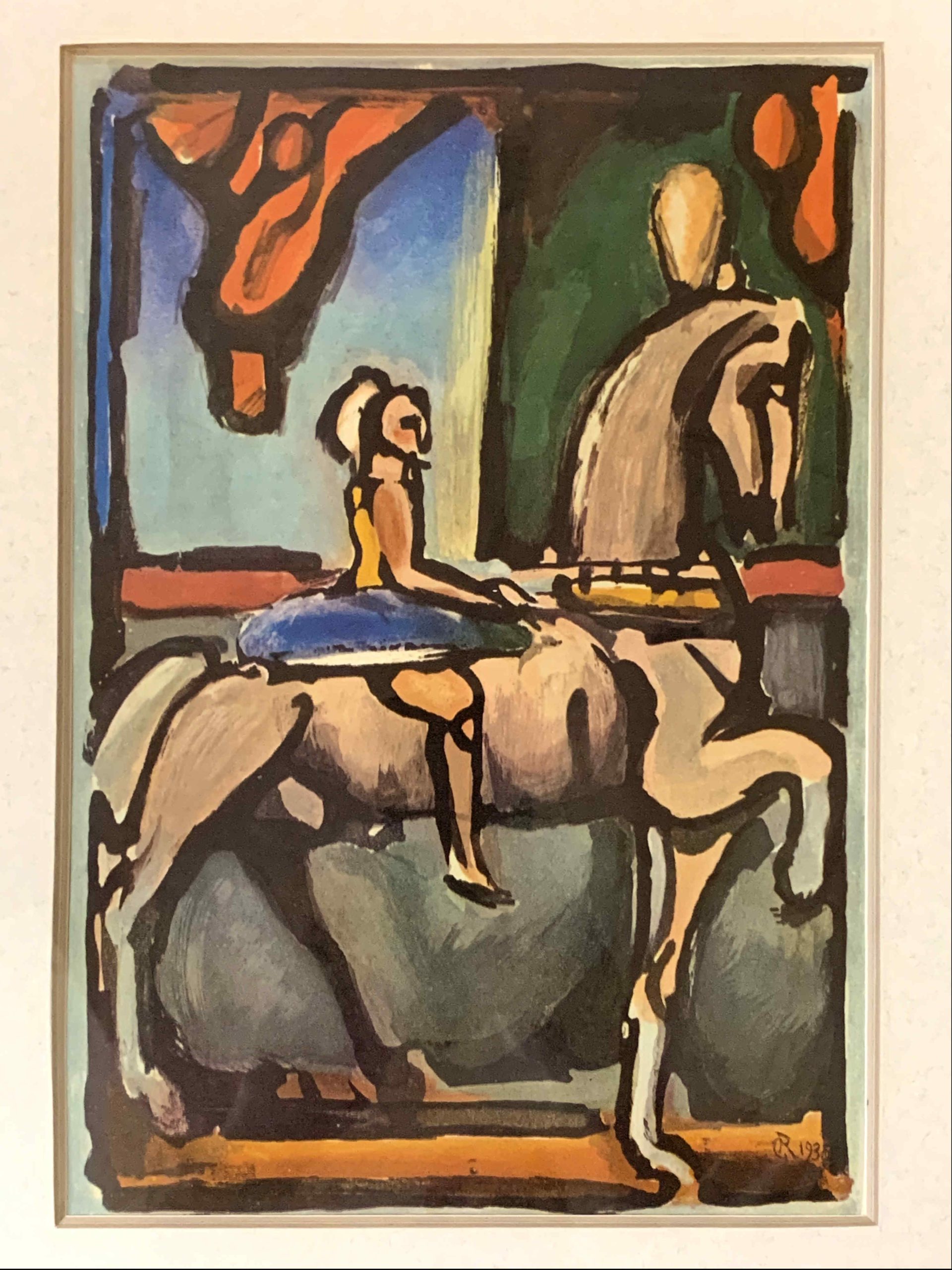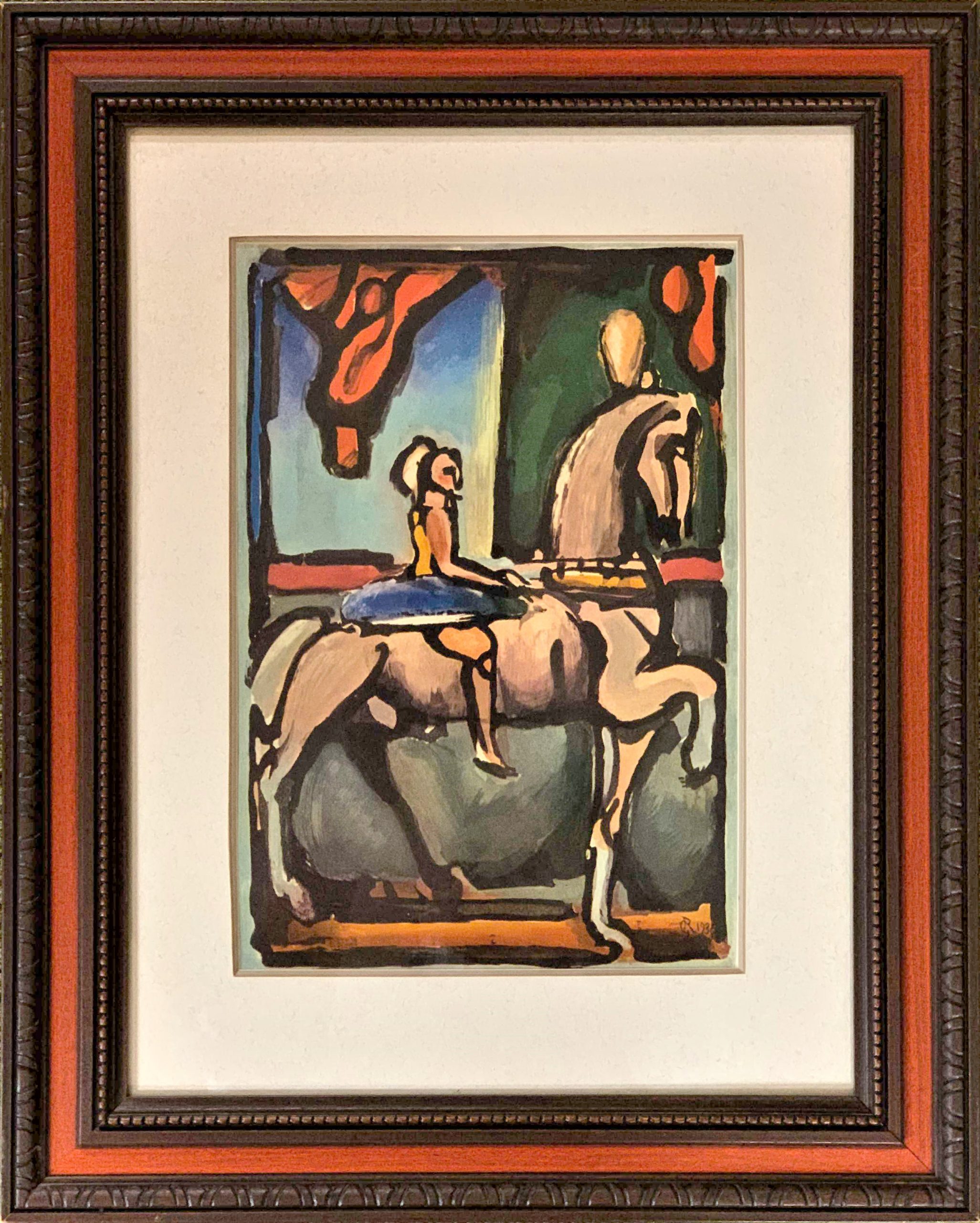 This work, entitled La Petit Ecuyère [The Little Equestrian], is Plate 6 of Rouault’s Cirque de l’Etoile Filante portfolio [Circus of the Shooting Star] series, commissioned and published by Parisian art publisher and dealer Ambroise Vollard (1866-1939). The series was introduced by seventeen color etchings with aquatint, and followed by 82 wood engravings that illustrate the text, also written by Rouault. The project began in 1926. This piece was created in 1935. The full edition was finally published in 1938. These aquatints are often described as the culmination of Rouault’s career as a printmaker.