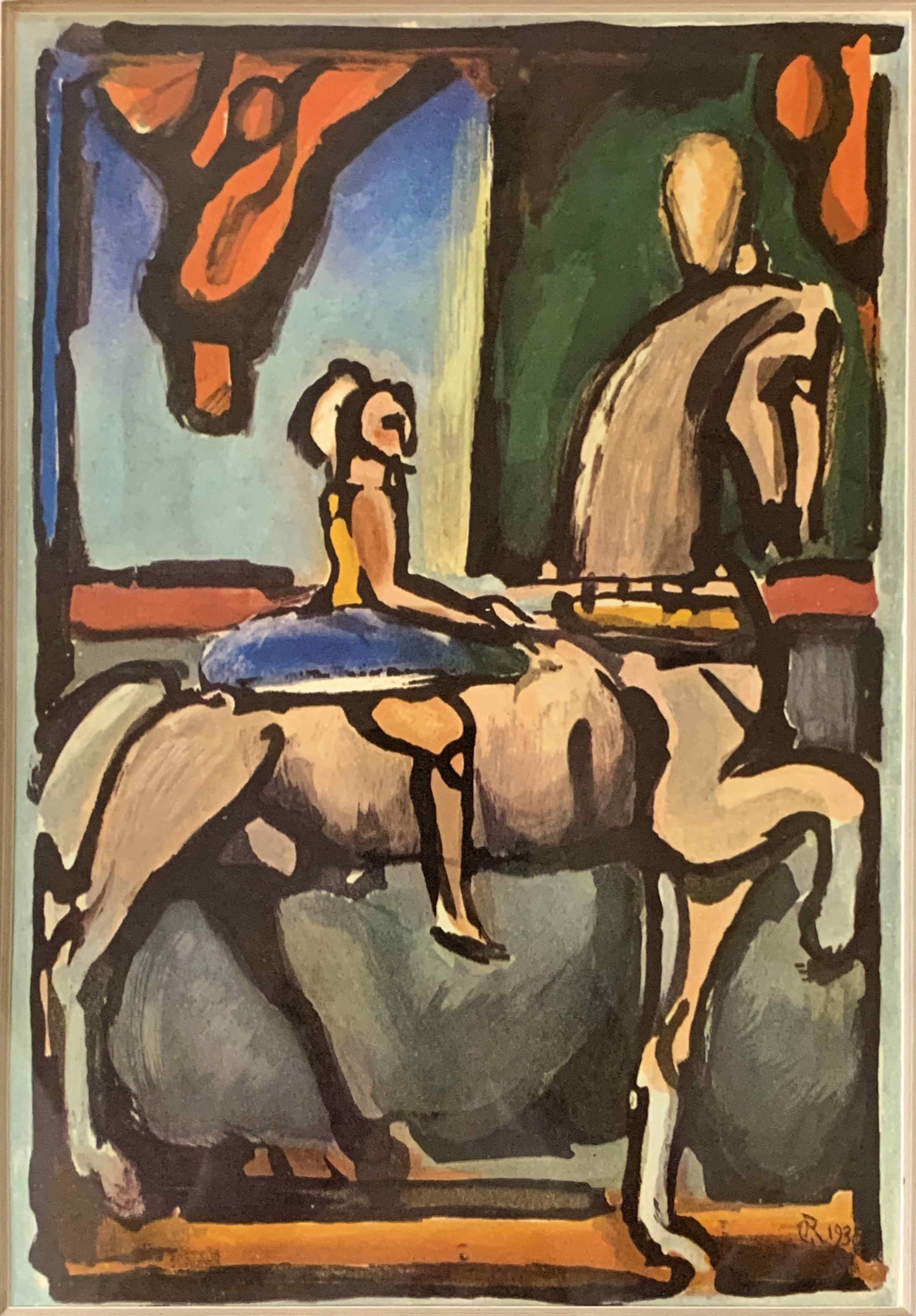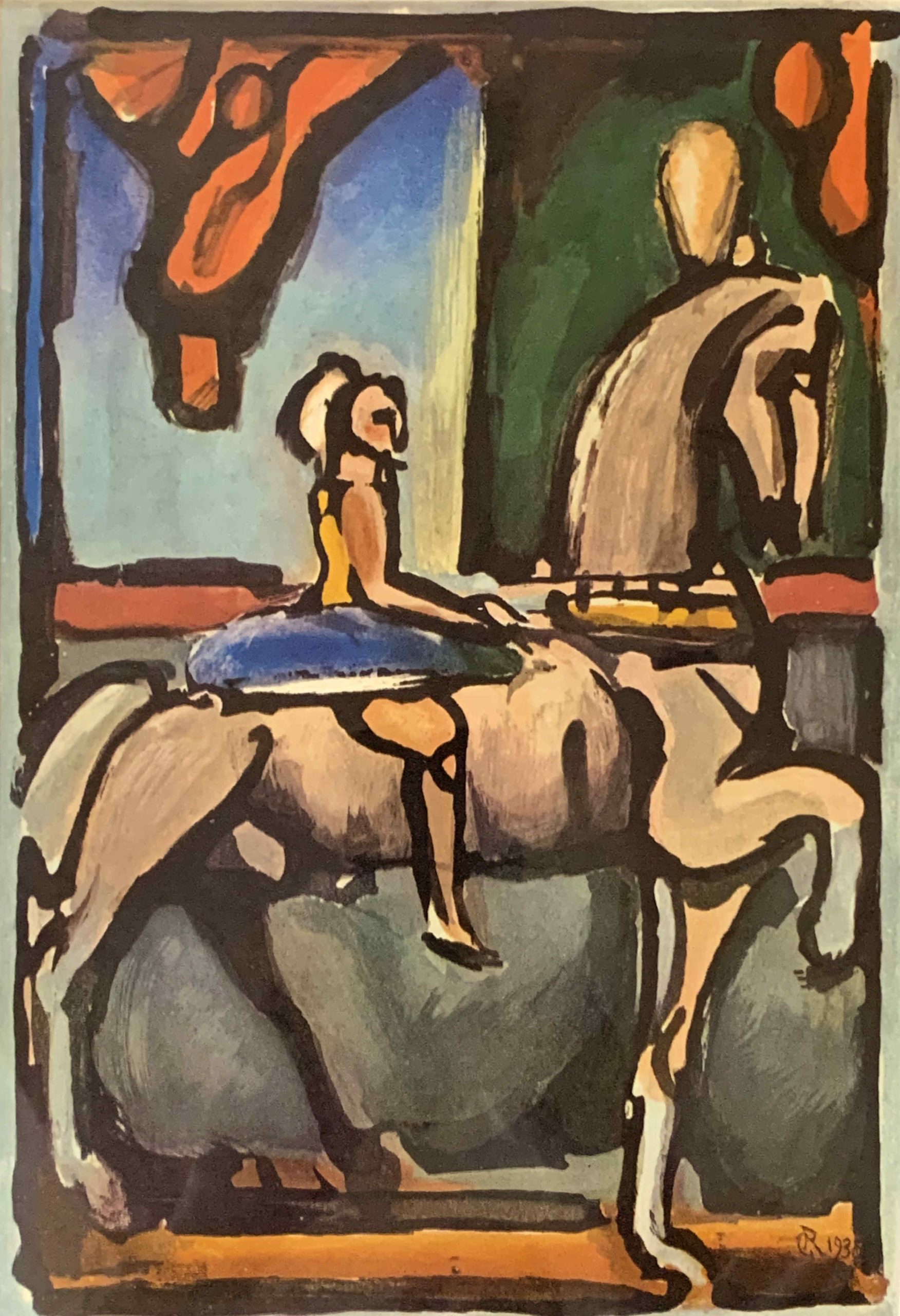 Rather than create pleasing “armchair” pictures like those of many of his contemporaries, Rouault applied his rough painterly style to religious subjects, clowns, and circus performers, using these motifs to reflect on religion, morality, and modern life. The theme of the circus was a major theme in Rouault’s work; he was fascinated by the contrast between the circus’ superficial brightness and the sadness of circus life. This portfolio reflected Rouault’s attempt to strip away the “spangles” of the clown’s costume and reveal the “reflection of paradise lost.”
