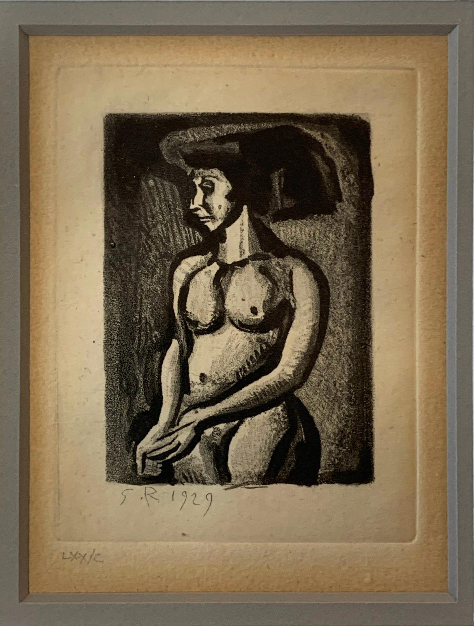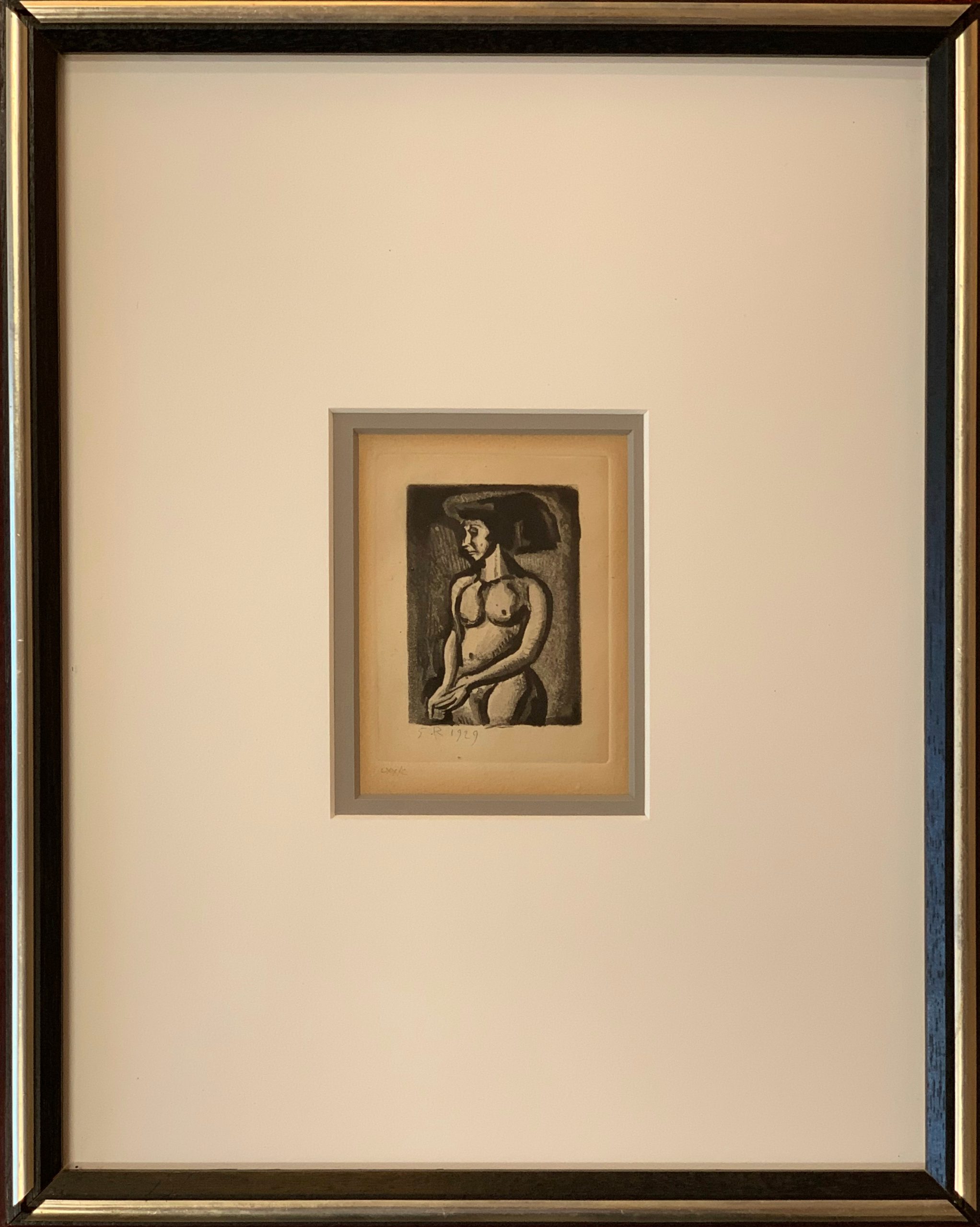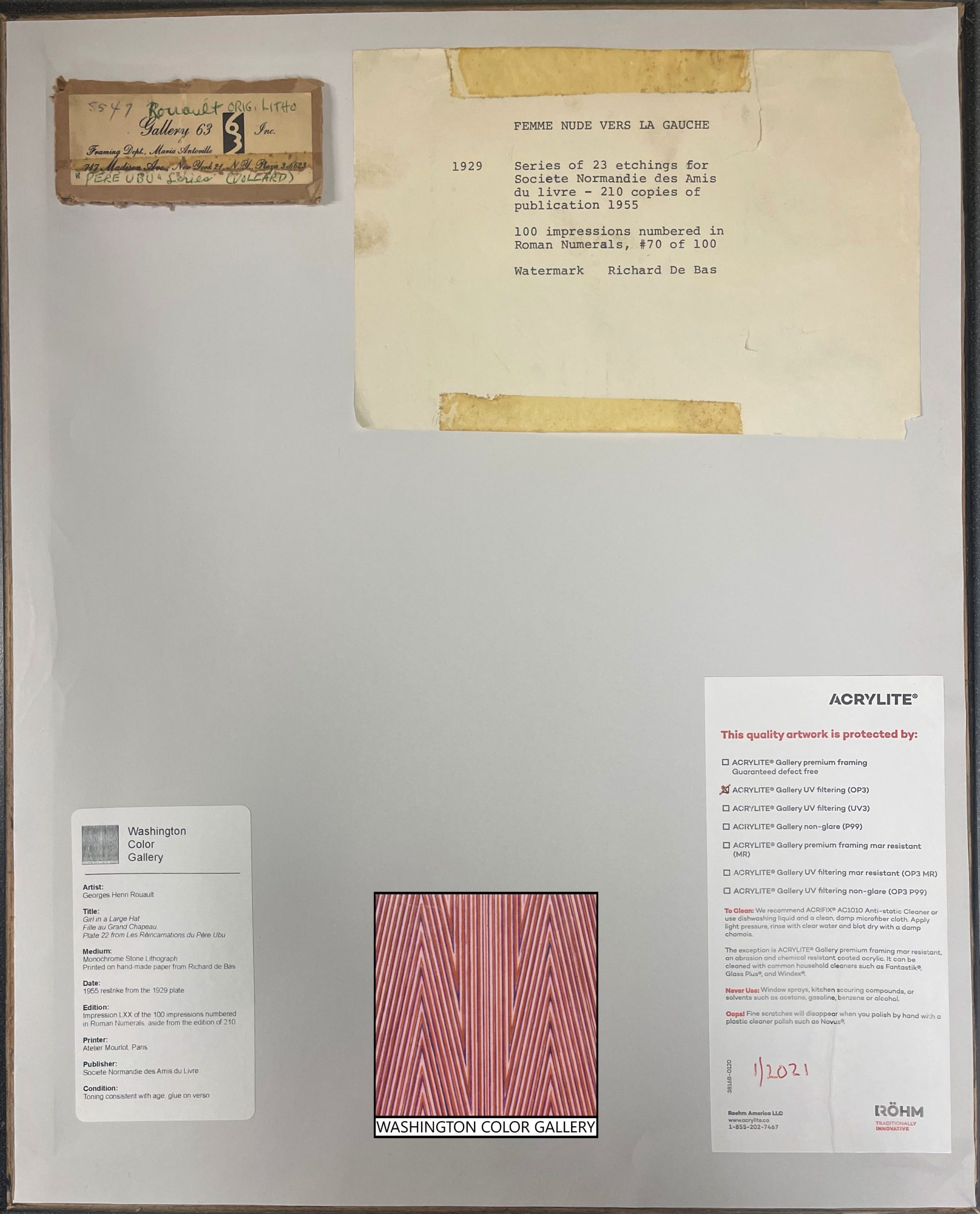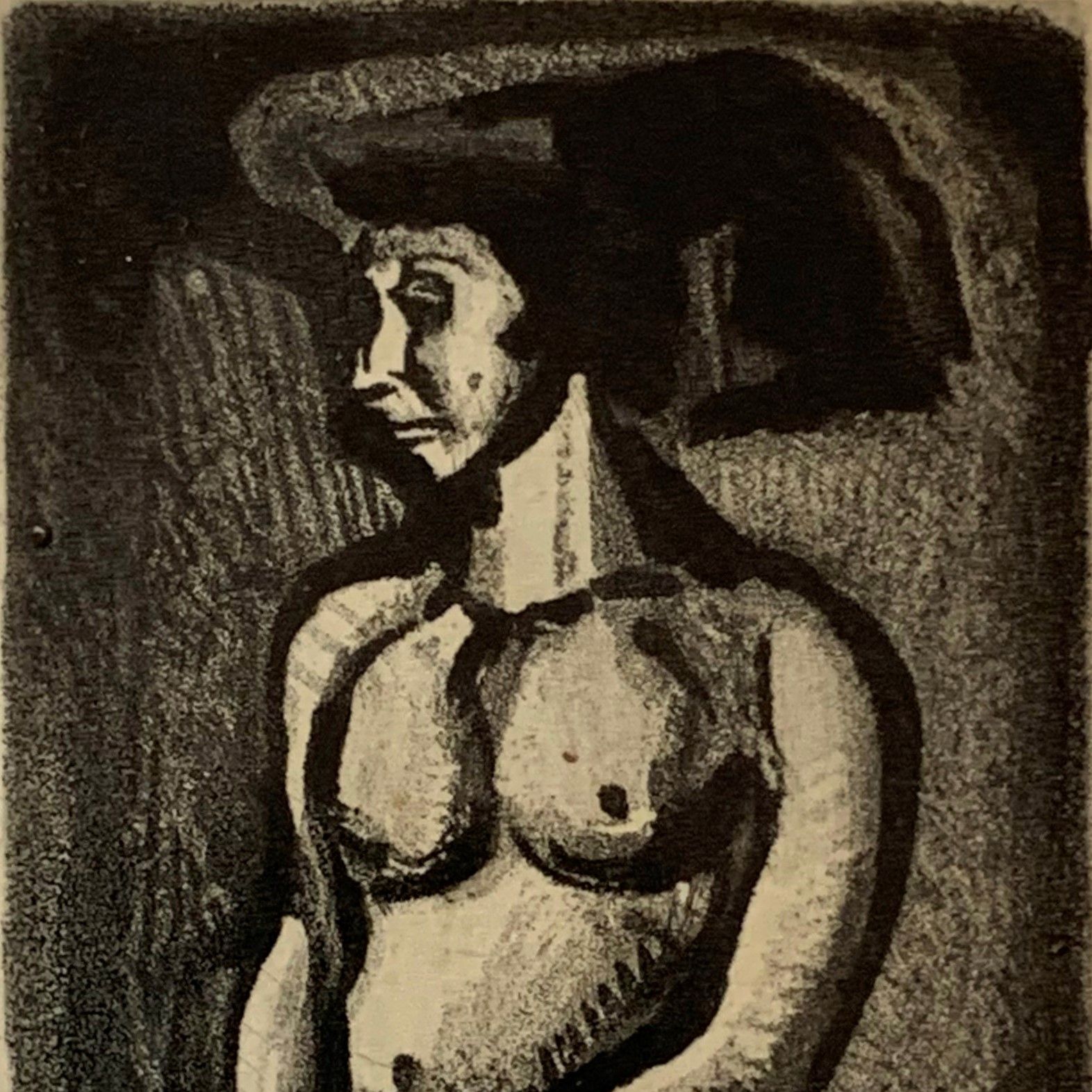 The title of this work, according to Wofsy’s Catalogue Raisonne, is “Femme Nue, vers la gauche” [Naked Woman, to the Left]; it is elsewhere titled “Fille au Grand Chapeau” [Woman with a Very Large Hat]. This work is plate number 22 from Ambroise Vollard’s famous Les Réincarnations du Père Ubu.