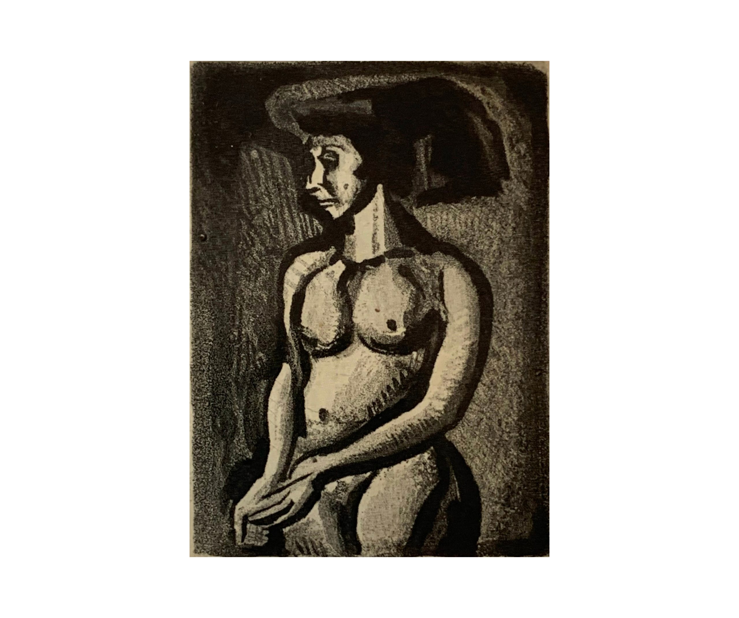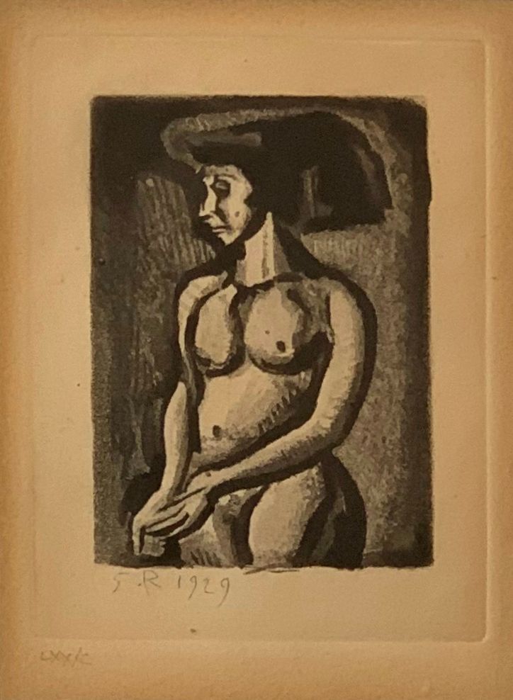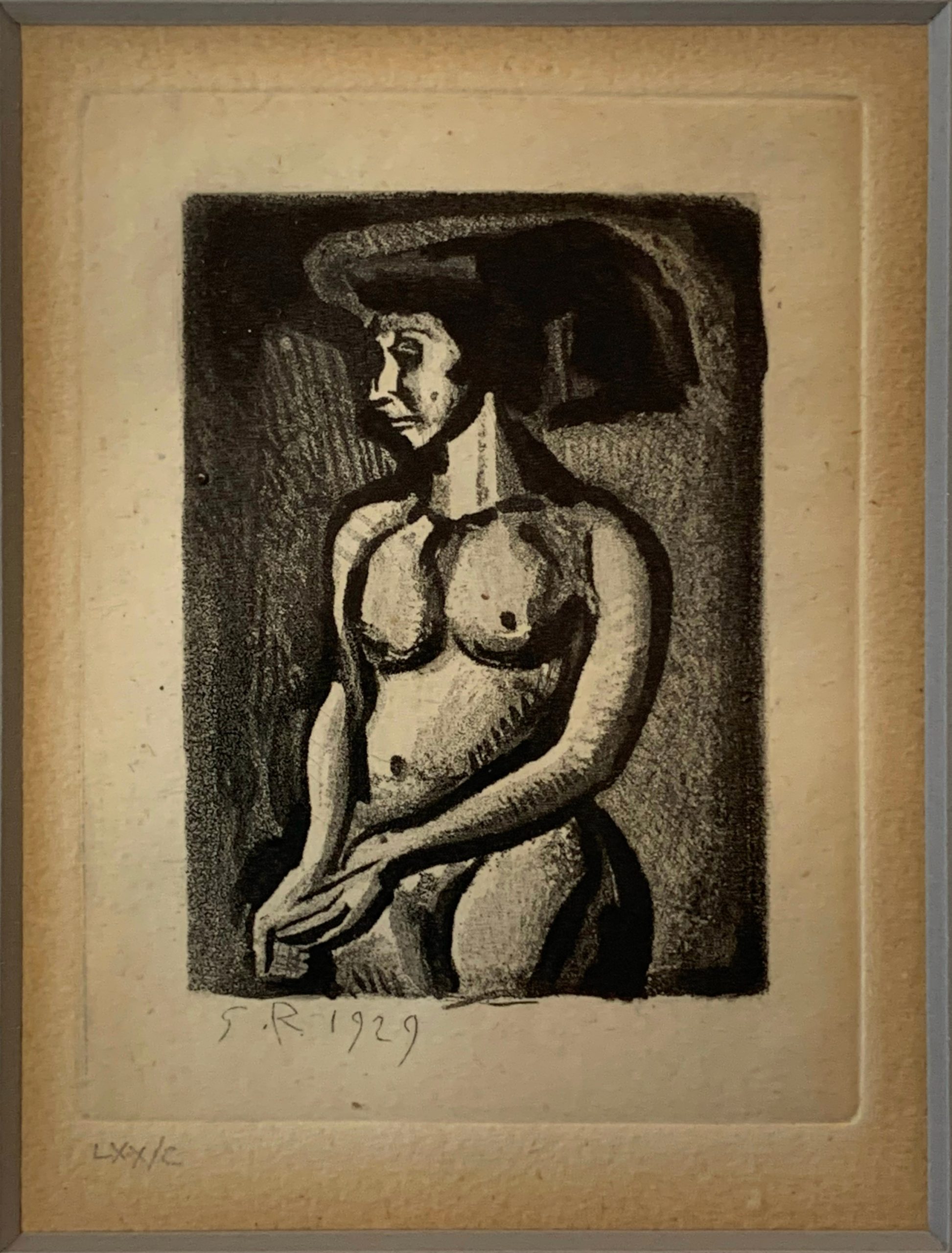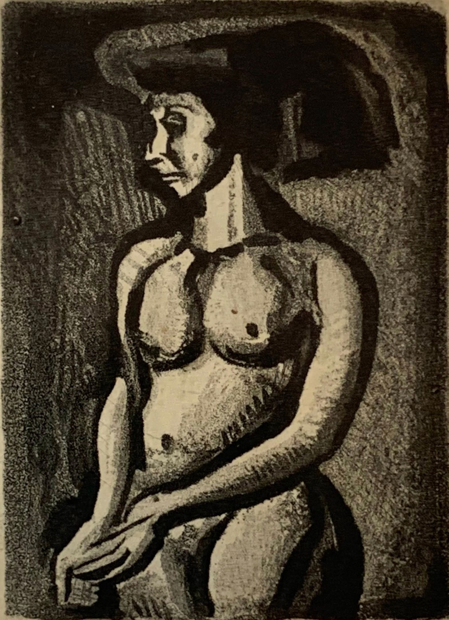 The title of this work, according to Wofsy’s Catalogue Raisonne, is “Femme Nue, vers la gauche” [Naked Woman, to the Left]; it is elsewhere titled “Fille au Grand Chapeau” [Woman with a Very Large Hat]. This work is plate number 22 from Ambroise Vollard’s famous Les Réincarnations du Père Ubu.
