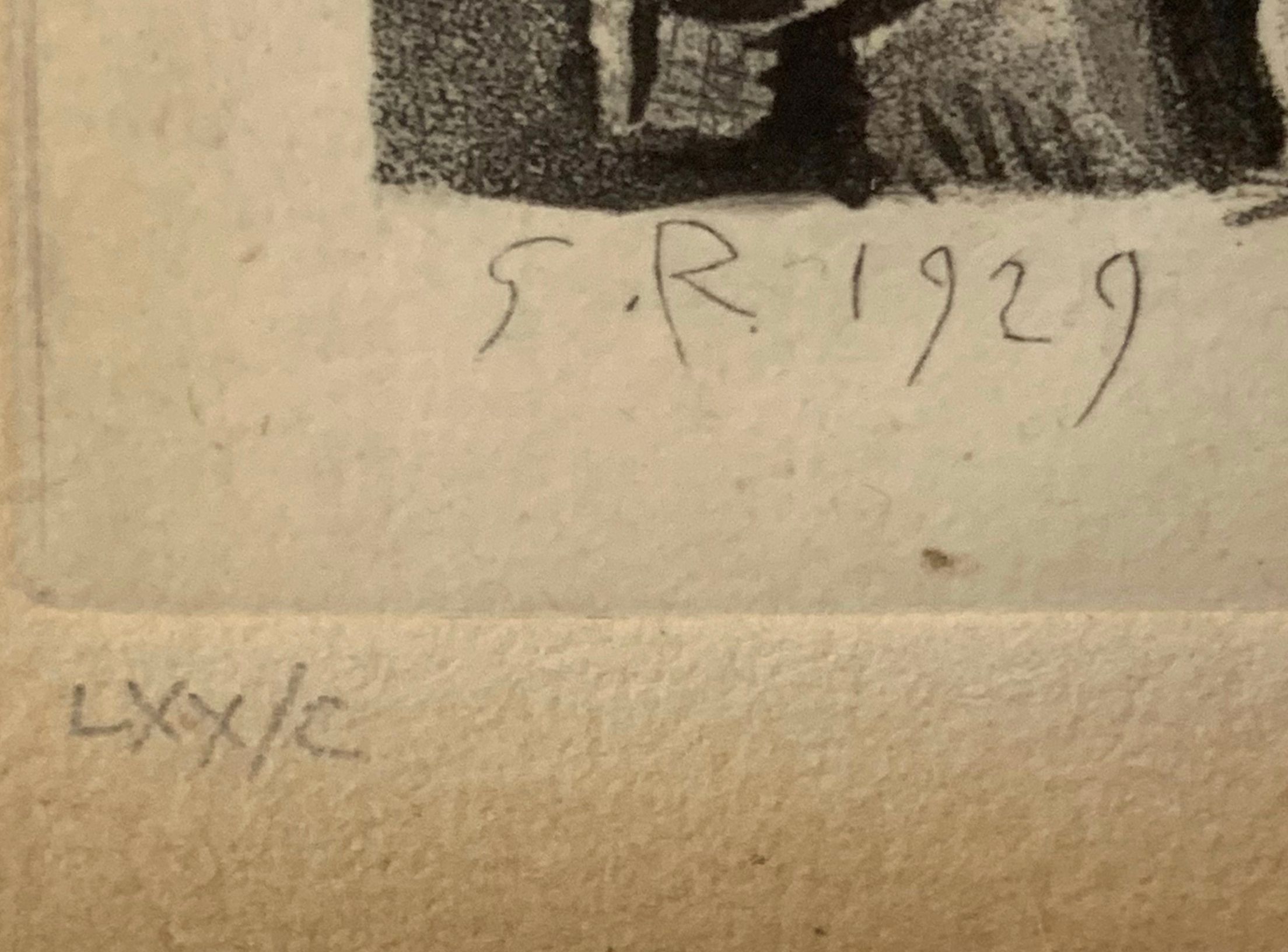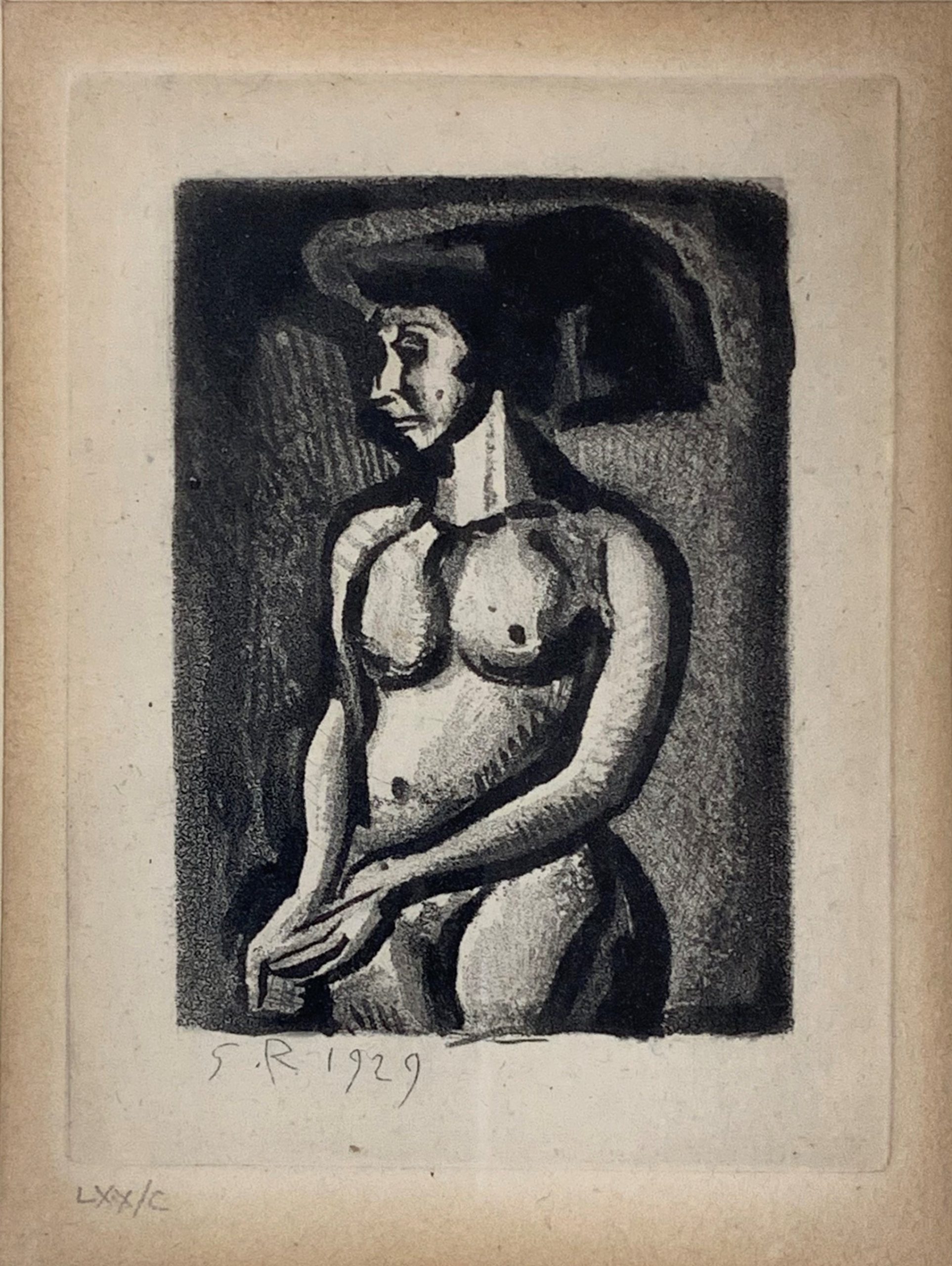 Rouault’s illustrations for Réincarnations de Père Ubu marked Rouault’s earliest use of photogravure techniques, and display a combination of etching and aquatint. He began working on it in 1918; he returned to the plate and produced the final version in 1928, but it was not published until 1932, when an edition of 225 pencil-signed impressions was made along with 305 portfolios for Reincarnations de Père Ubu, containing suites of the etchings on Arches and Rives papers. This example, however, was from an edition of 210 from reduced format plates published by Antoine Vollard in 1955 on fine Vélin paper (which, interestingly, is almost purely aquatint, without the etched and engraved lines of the 1932 edition). This example is one of the 100 sets of the 1955 edition which were numbered in Roman numerals (in addition to the 110 sets were numbered in Arabic numerals for the Société Normande des Amis du Livre).