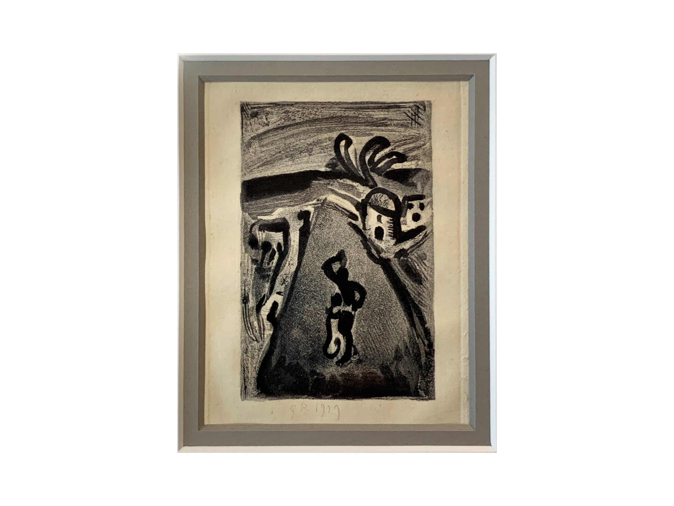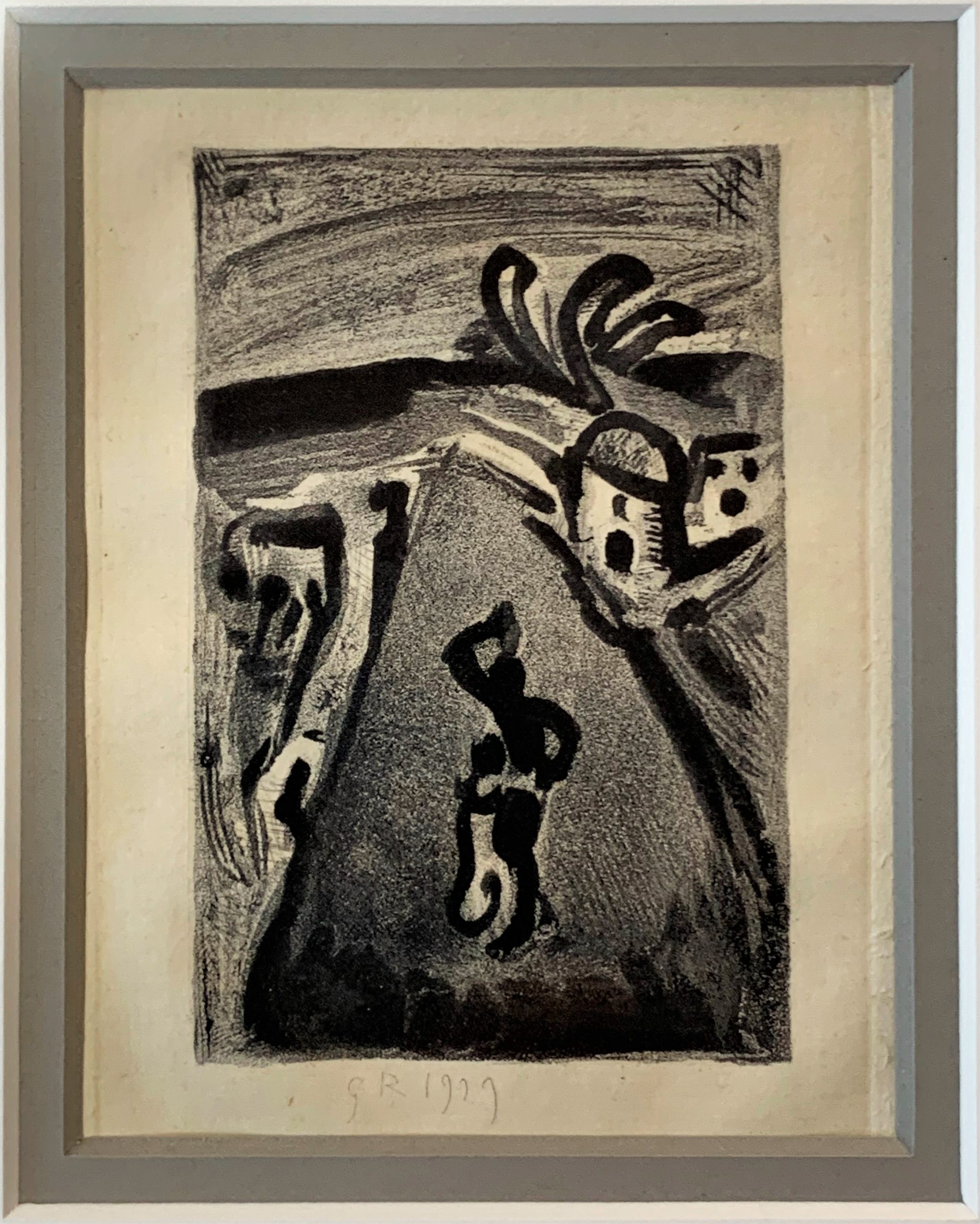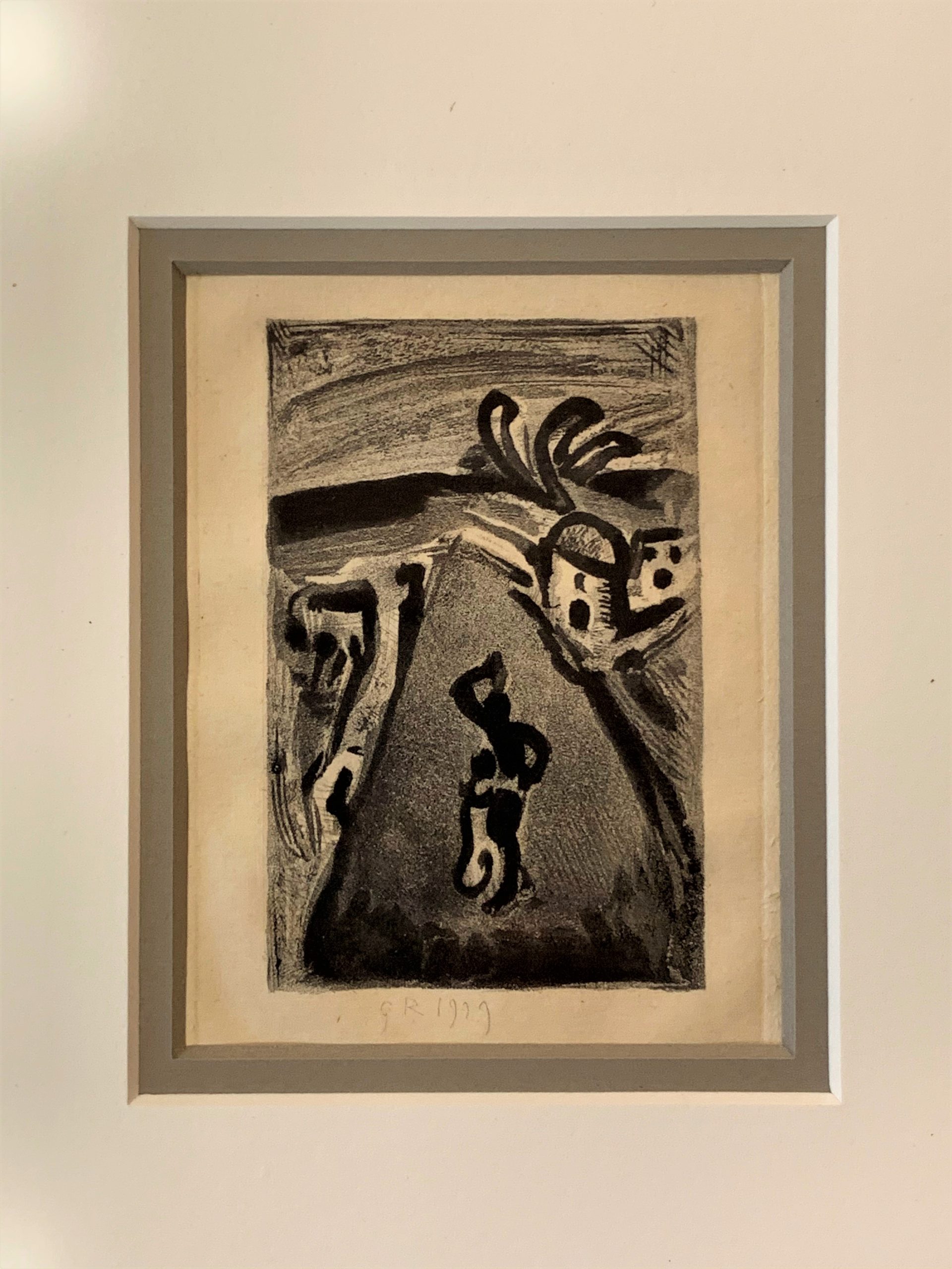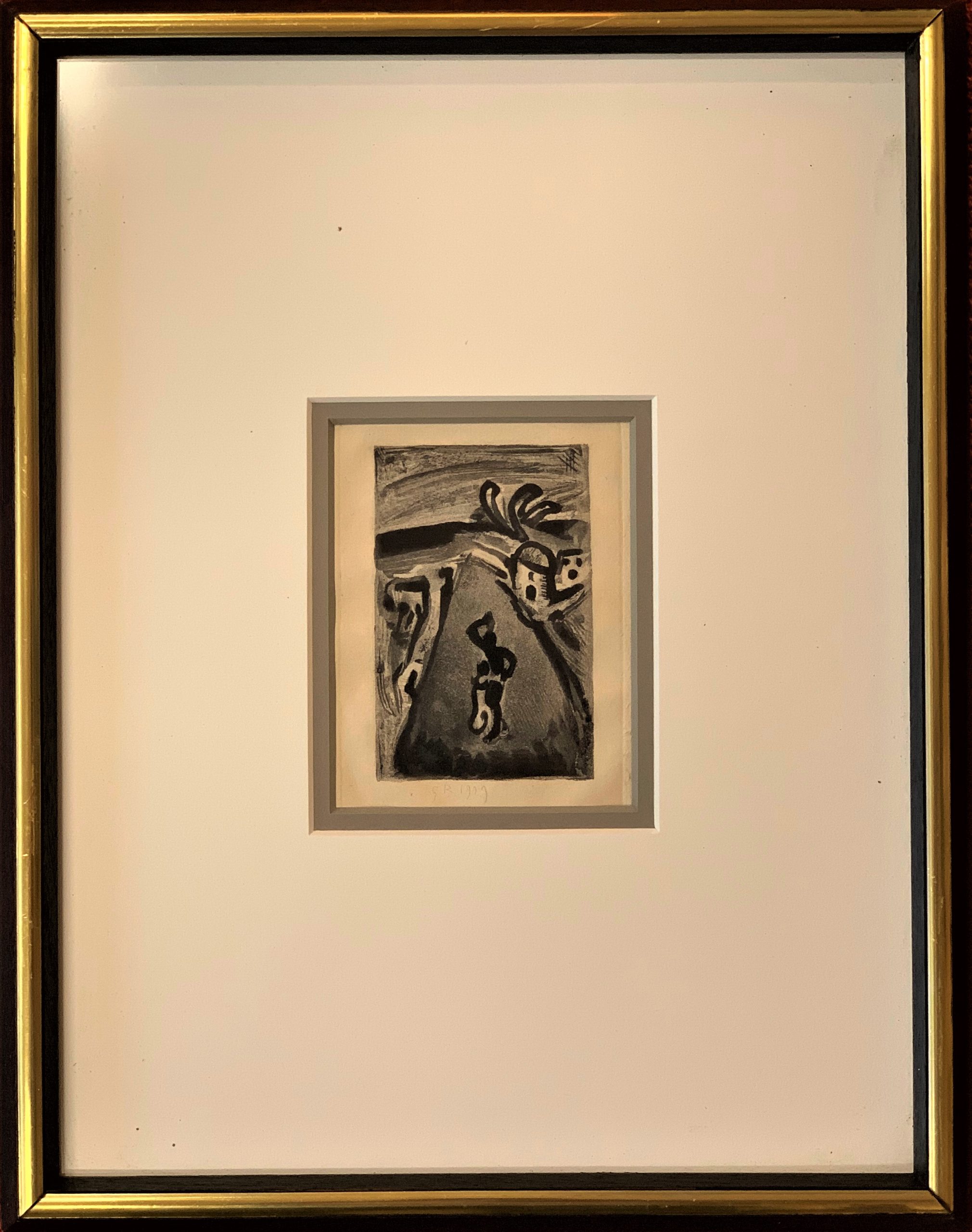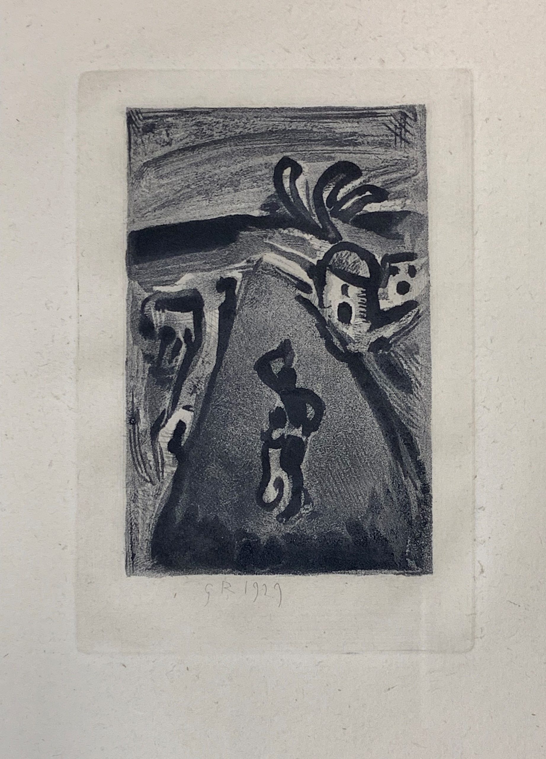 Rouault began working on the Reincarnations of Père Ubu in 1918; he returned to the plate and produced the final version in 1928.  It was not published until 1932, when an edition of 225 pencil-signed impressions was made along with 305 portfolios for Reincarnations de Père Ubu, containing suites of the etchings on Arches and Rives papers.  This etching, from the 1929 plate, was from the edition of 210 published by Antoine Vollard in 1955 on fine Vélin paper.