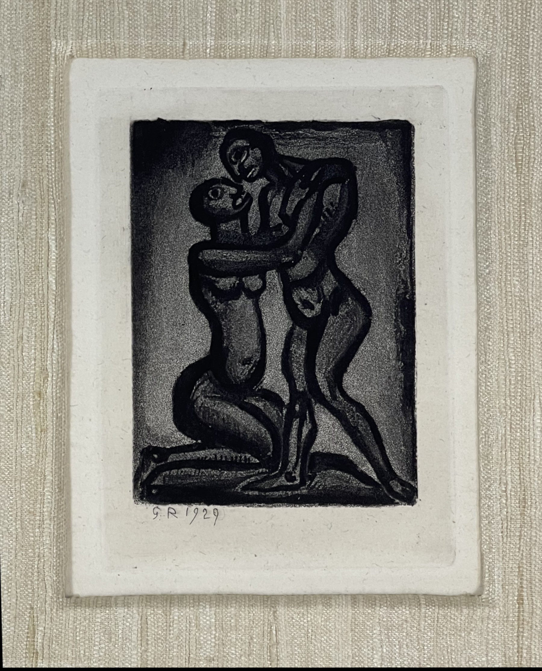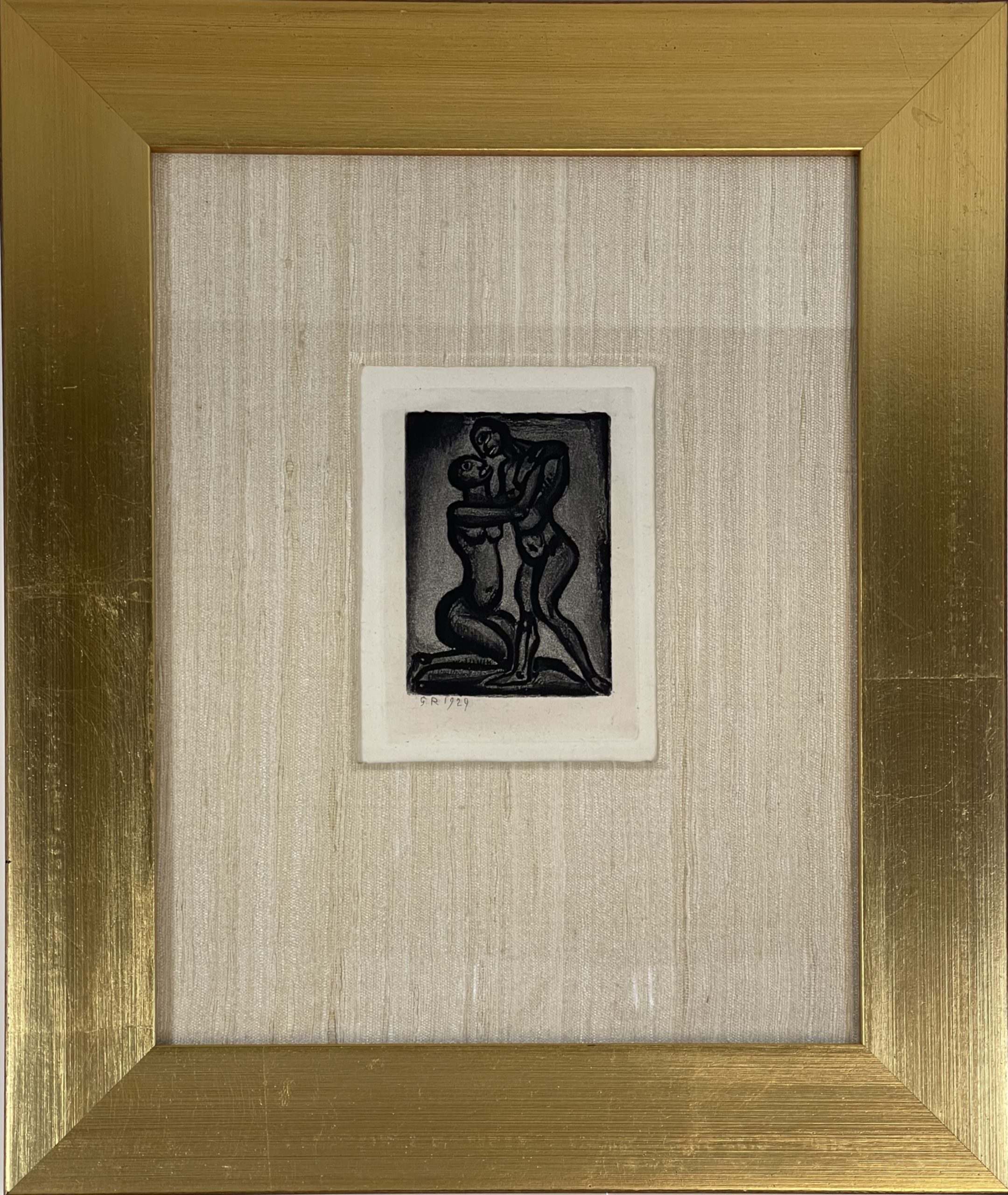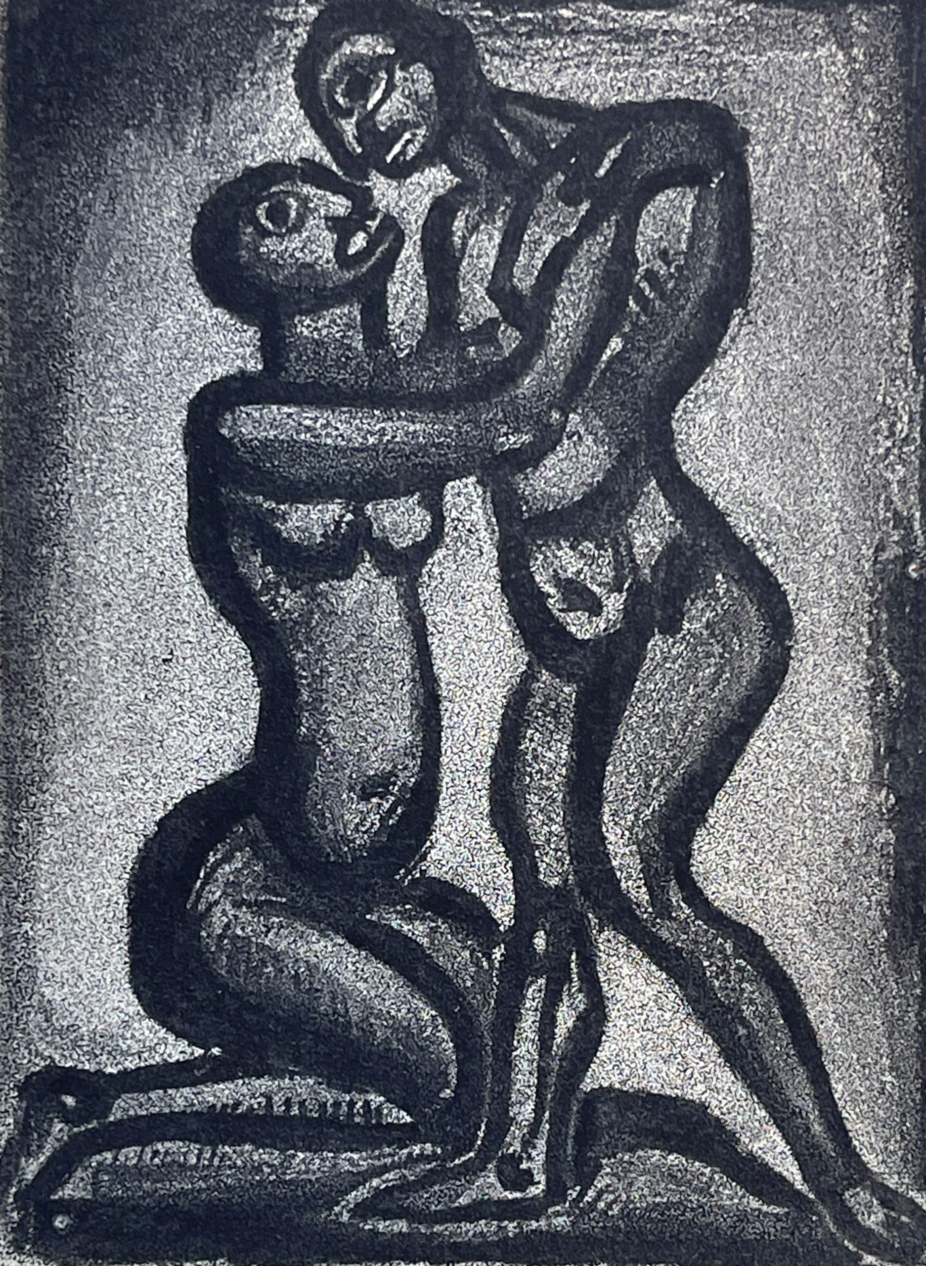 In this etching and aquatint, titled Les Amis, a young black woman kneels before a standing black male in a kind of embrace, but with expressions that do not reflect love. This edition was published by Vollard for the Société Normande des Amis du Livre, Paris, in 1955.