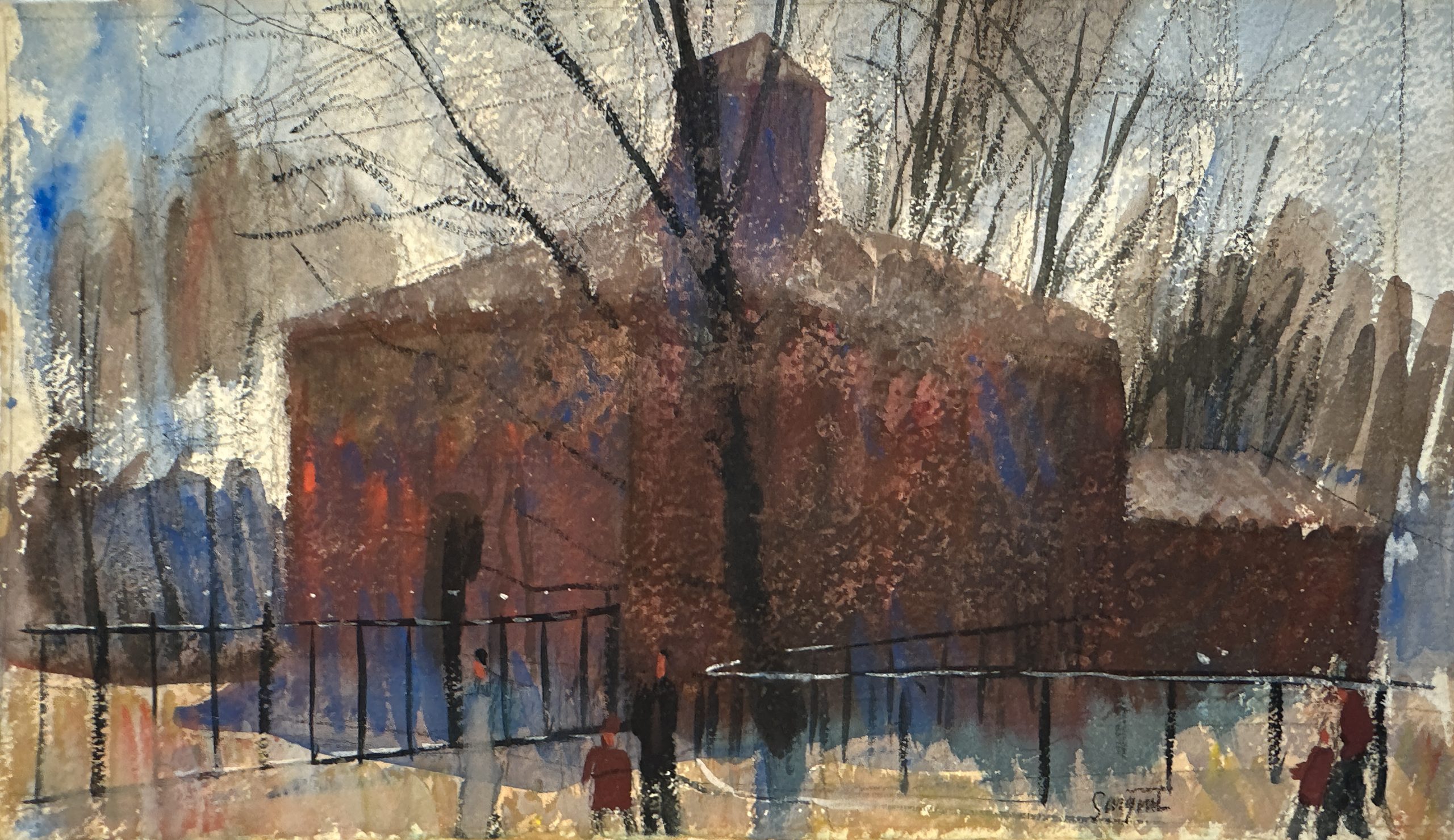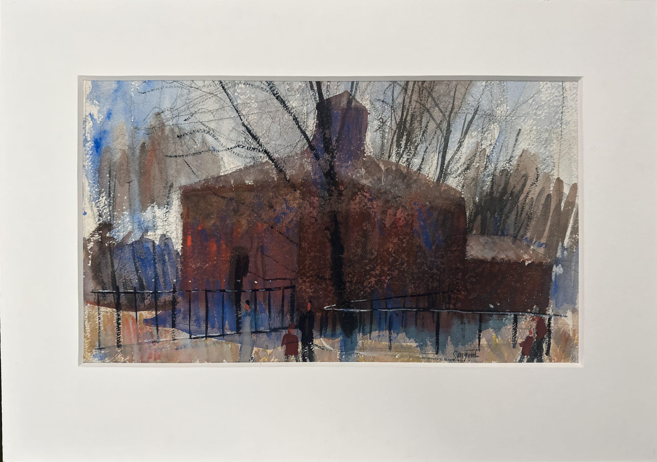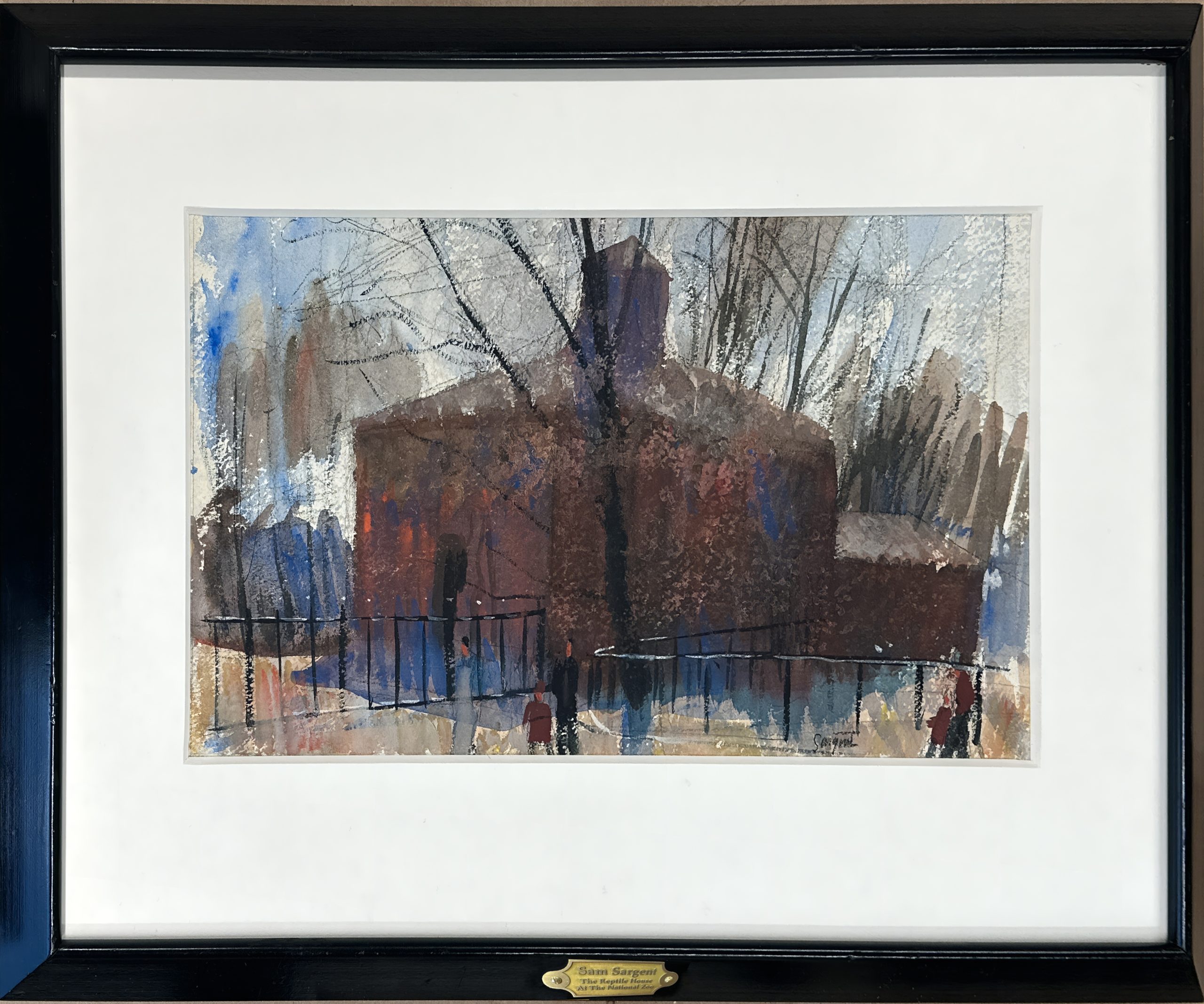 An enchanting watercolor painted with deep, rich colors, portraying the old reptile house at the National Zoo. Custom framed in a period wood frame behind 99% UV-Blocking non-reflective art glass using strictly conservation-grade materials.