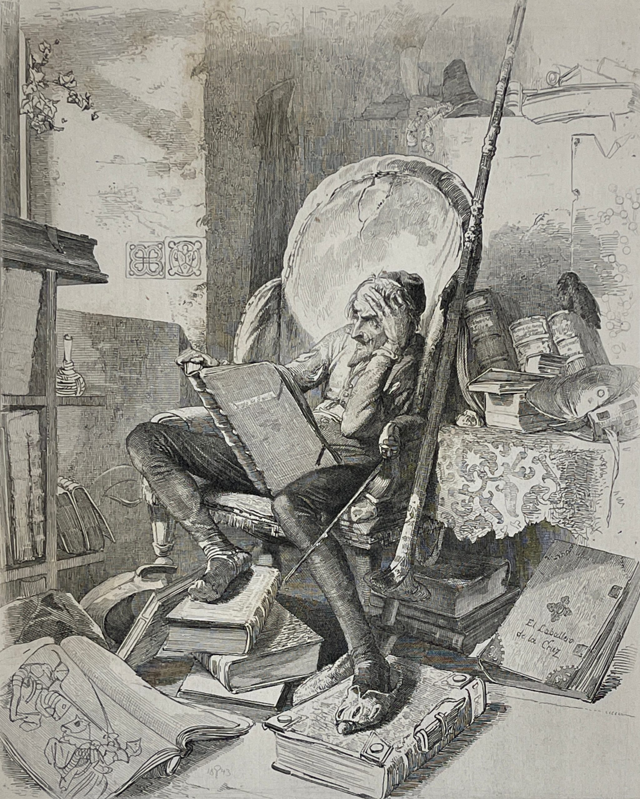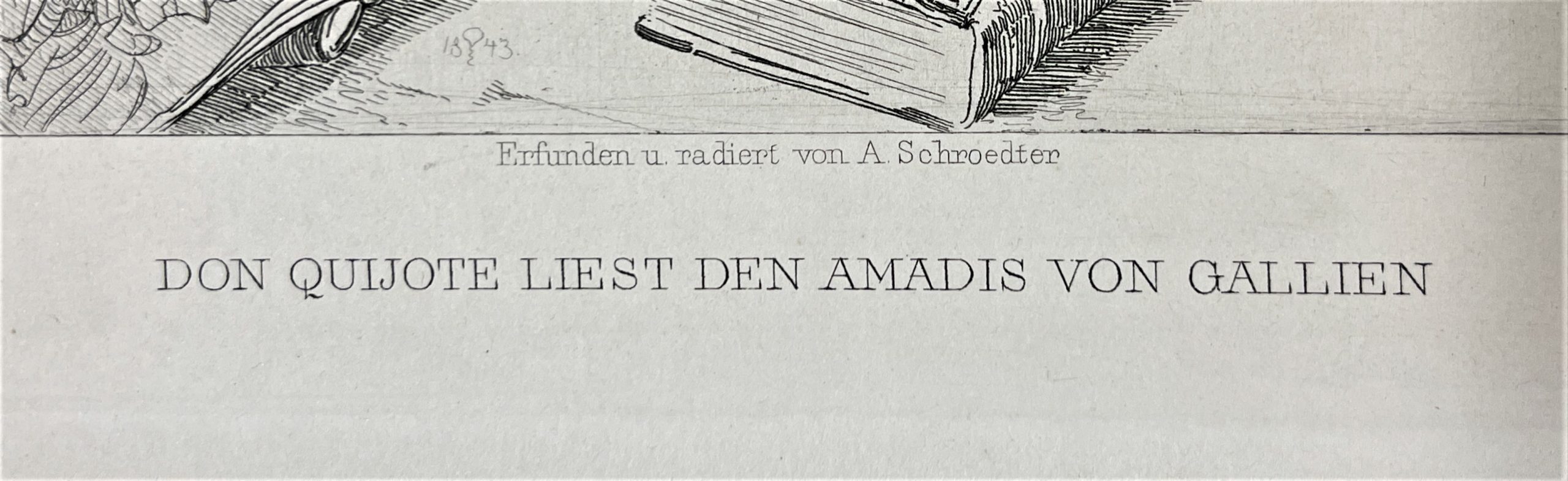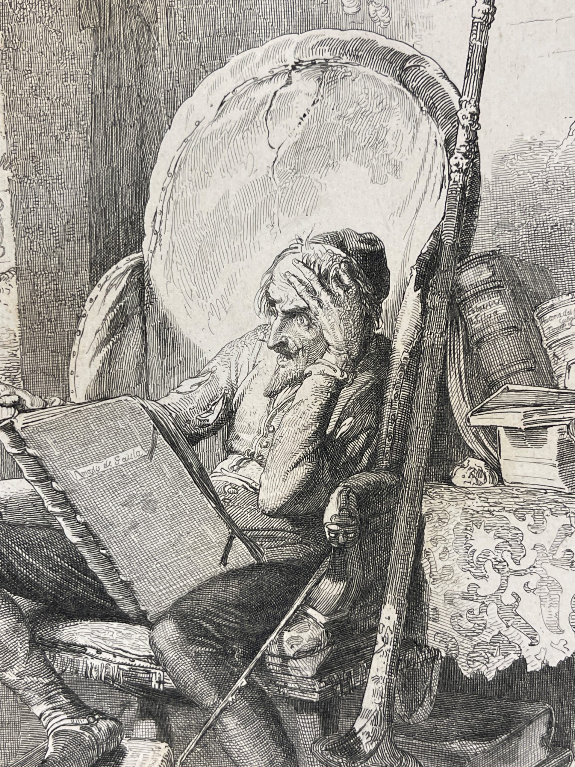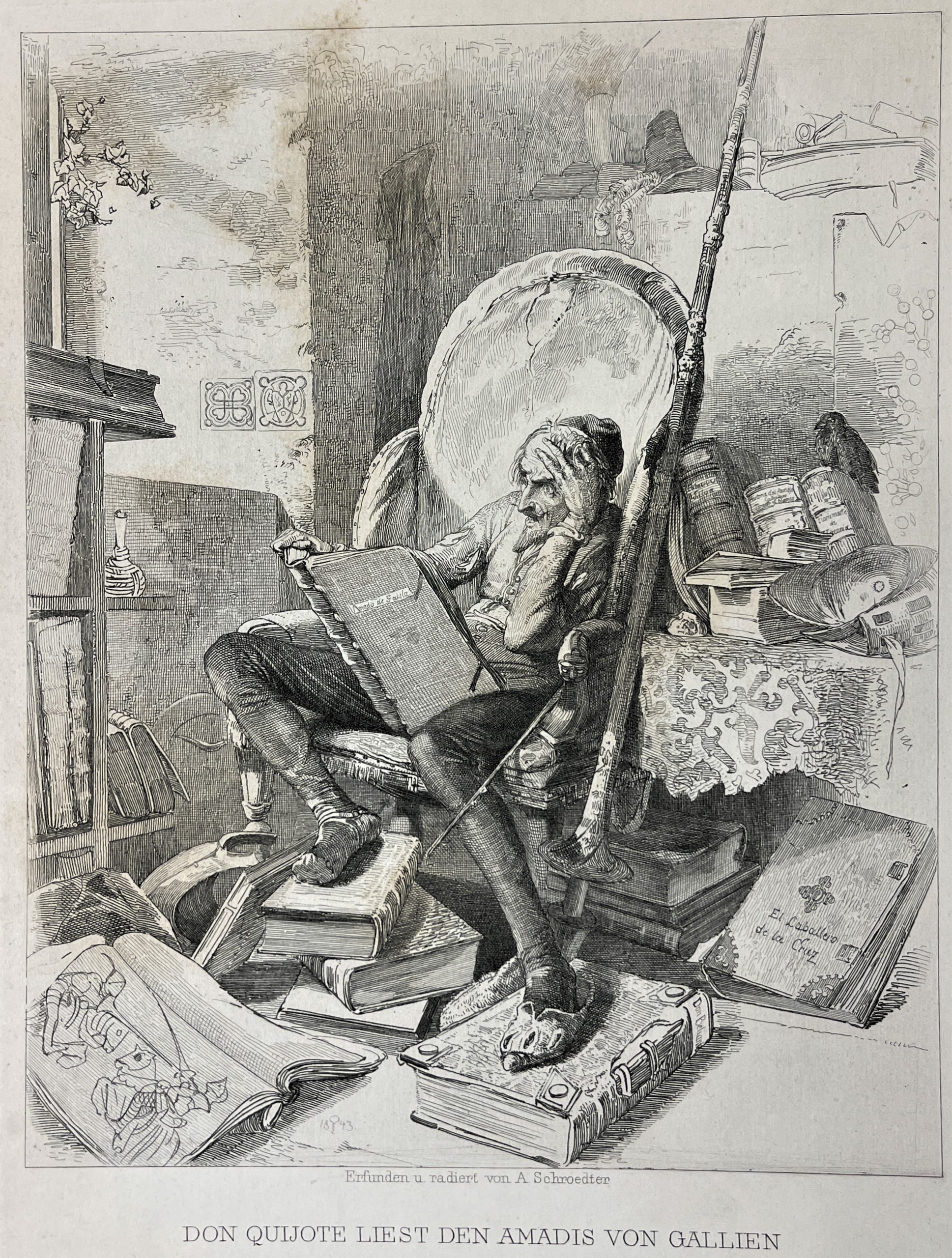 This 1843 etching by the great master Adolf Schrödter illustrates the scene in which Don Quixote reads Amadis of Gaul.  Don Quixote has decided to imitate the penance suffered by his hero, Amadis of Gaul, so he writes verses to his beloved Lady Dulcinea and does a great deal of lamenting and sighing.