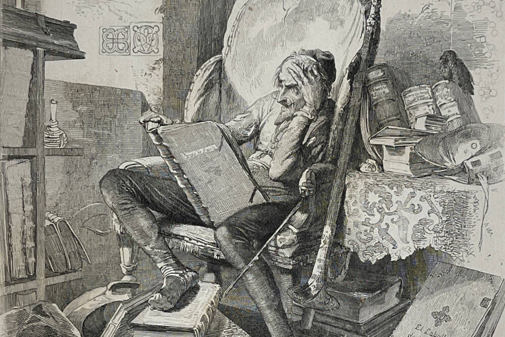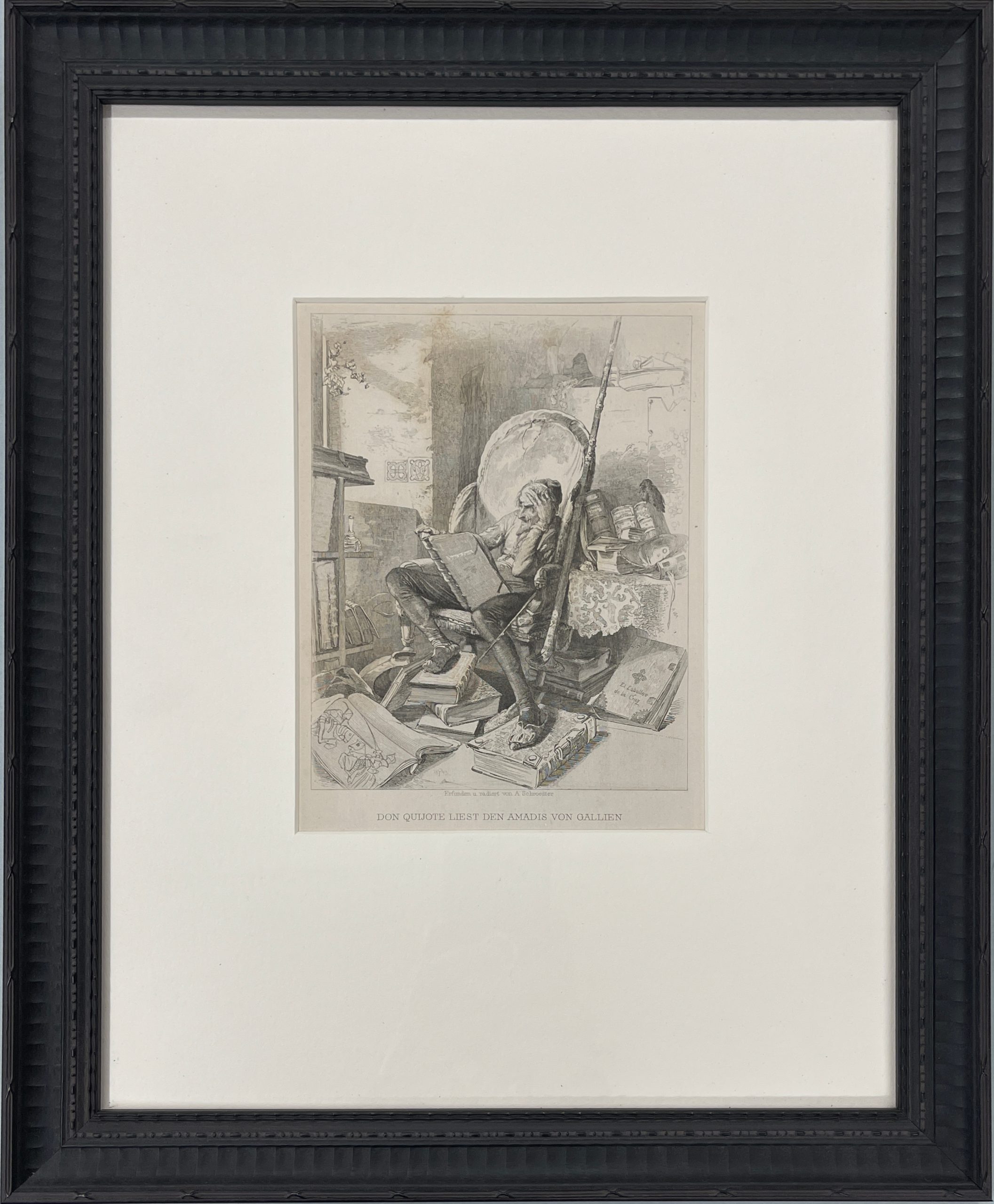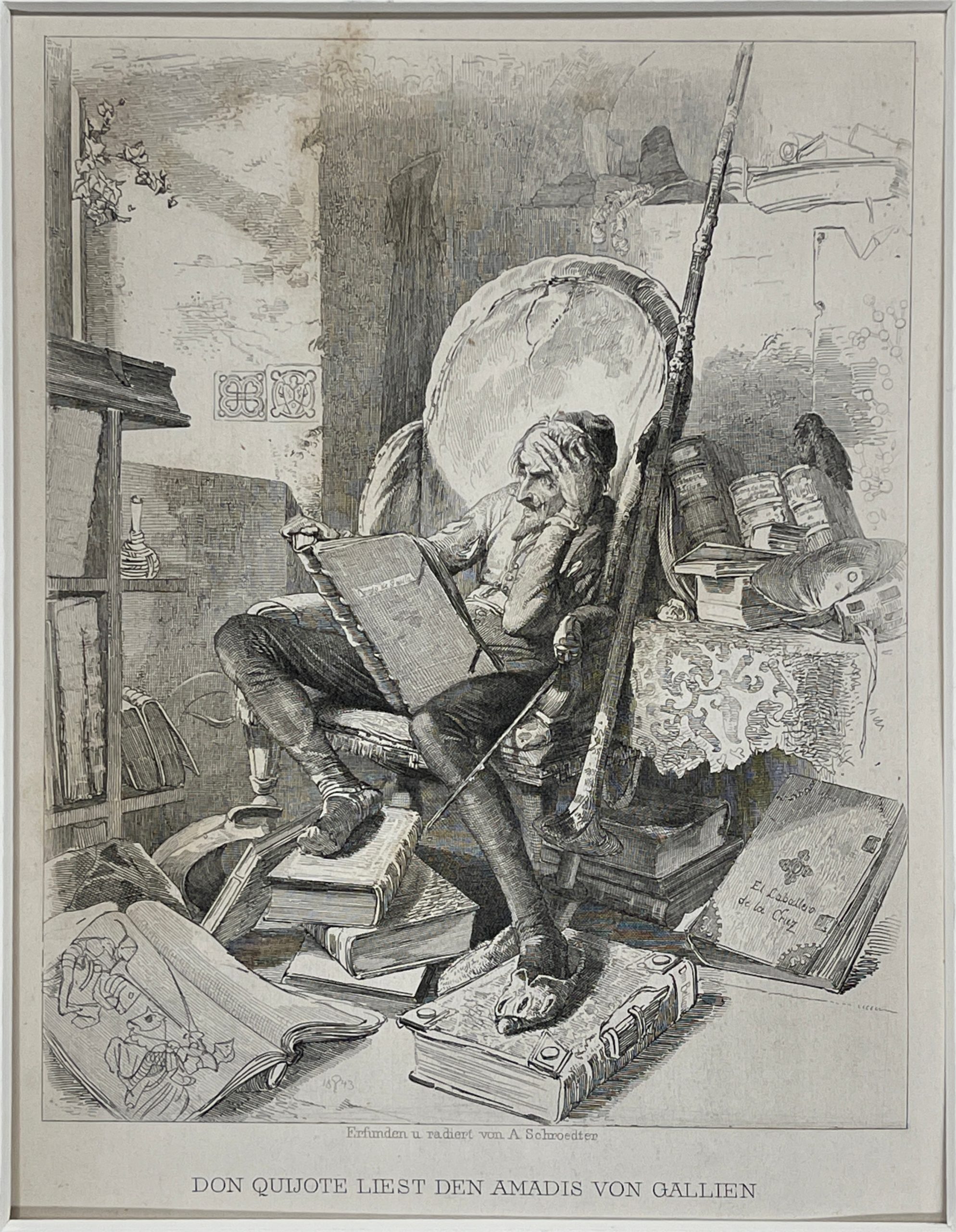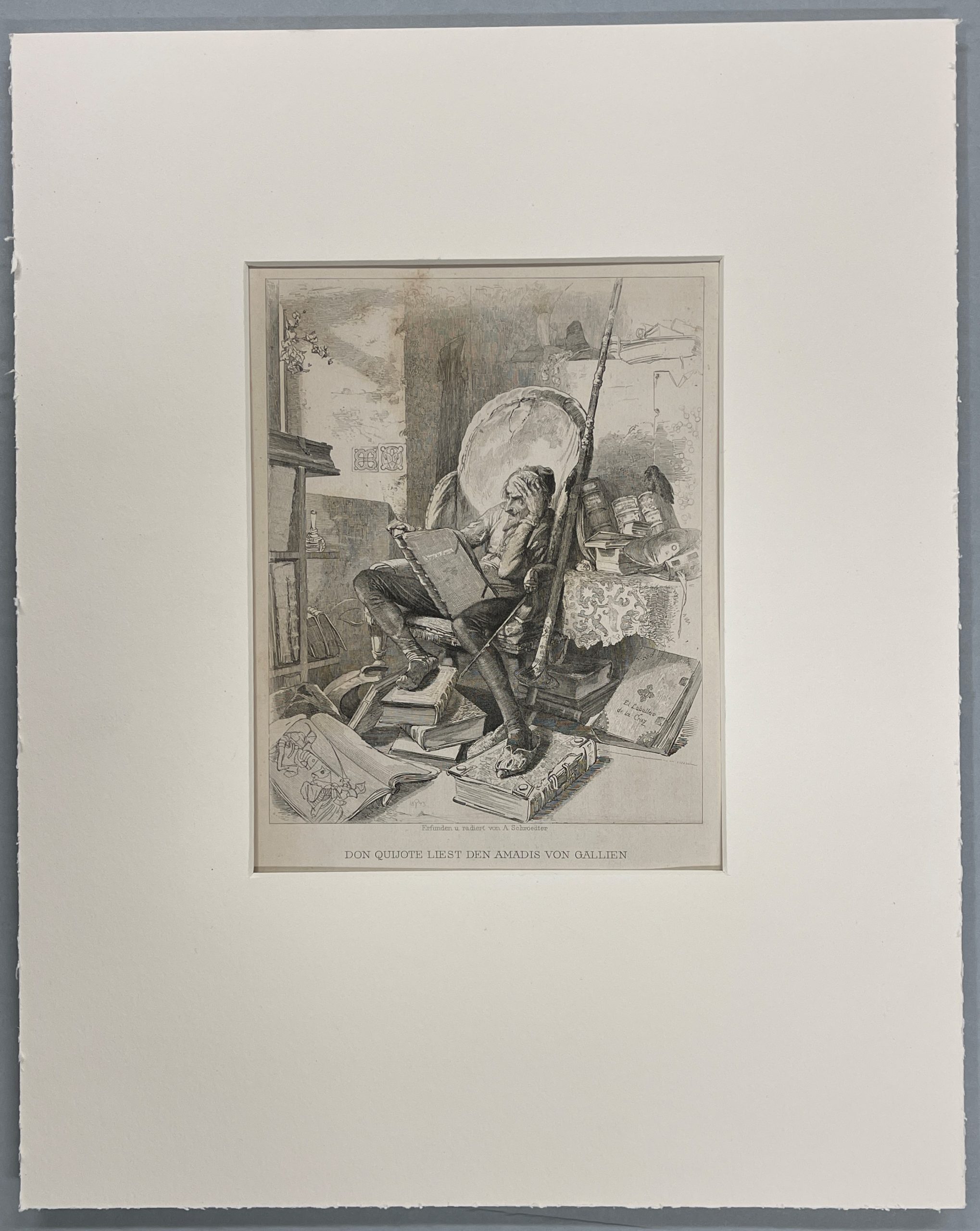 This 1843 etching by the great master Adolf Schrödter illustrates the scene in which Don Quixote reads Amadis of Gaul.  Don Quixote has decided to imitate the penance suffered by his hero, Amadis of Gaul, so he writes verses to his beloved Lady Dulcinea and does a great deal of lamenting and sighing.