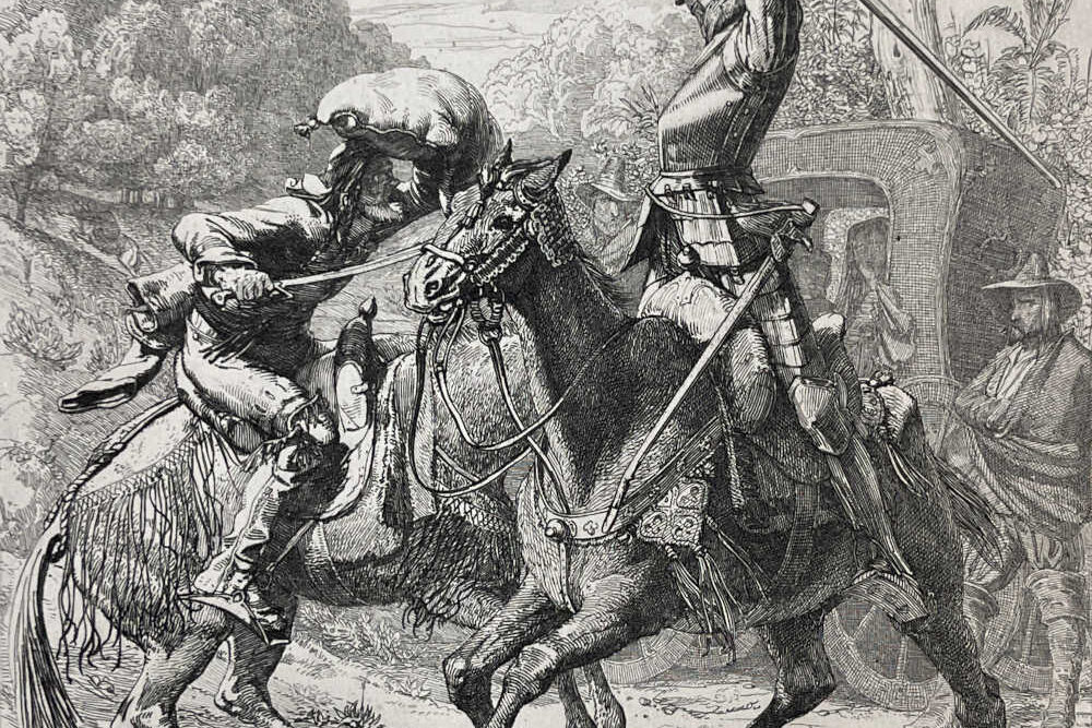 One of the coach’s squires, dismayed that Don Quixote intends for the coach to stray from its intended destination, tells Don Quixote to go away. As you might expect, this devolved quickly into a fight, with Don Quixote charging after the Biscayan squire with sword drawn. The Biscayan grabs a pillow from the coach as a shield, and though he is able to wound Don Quixote he is unable to defeat him. Just before Don Quixote renders the killing blow, though, the ladies from the coach plead for the Biscayan’s life. Don Quixote graciously agrees, demanding only that the squire report to Lady Dulcinea that she might deal with him however she deems best.