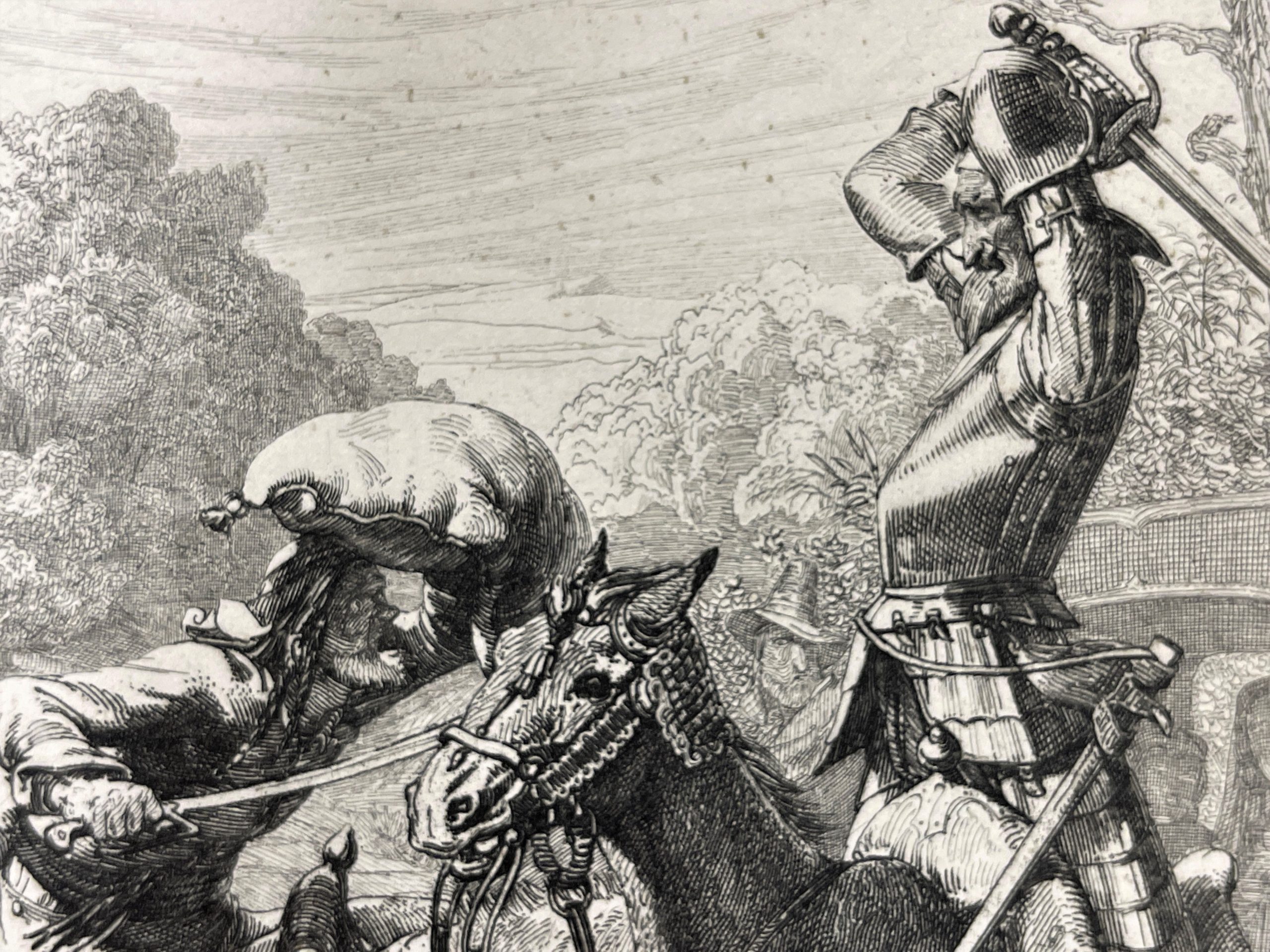 This 1843 etching by the great master Adolf Schrödter illustrates the scene in which Don Quixote battles with the Biscayan.