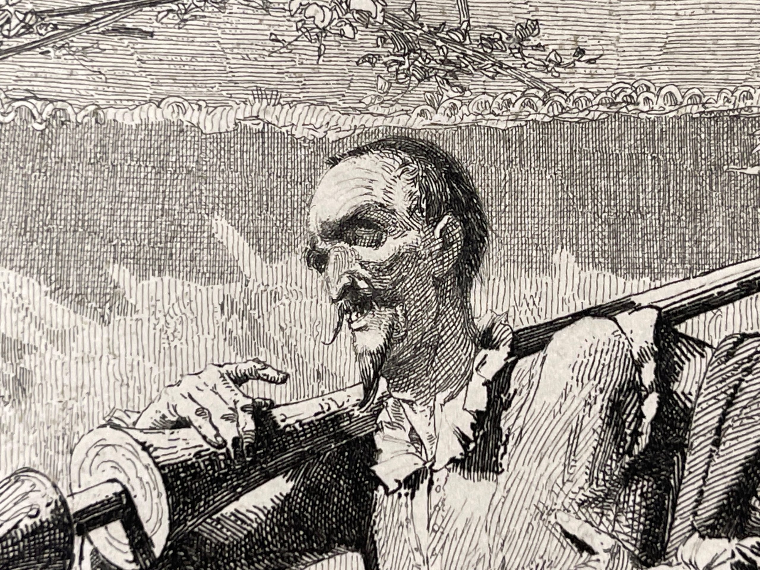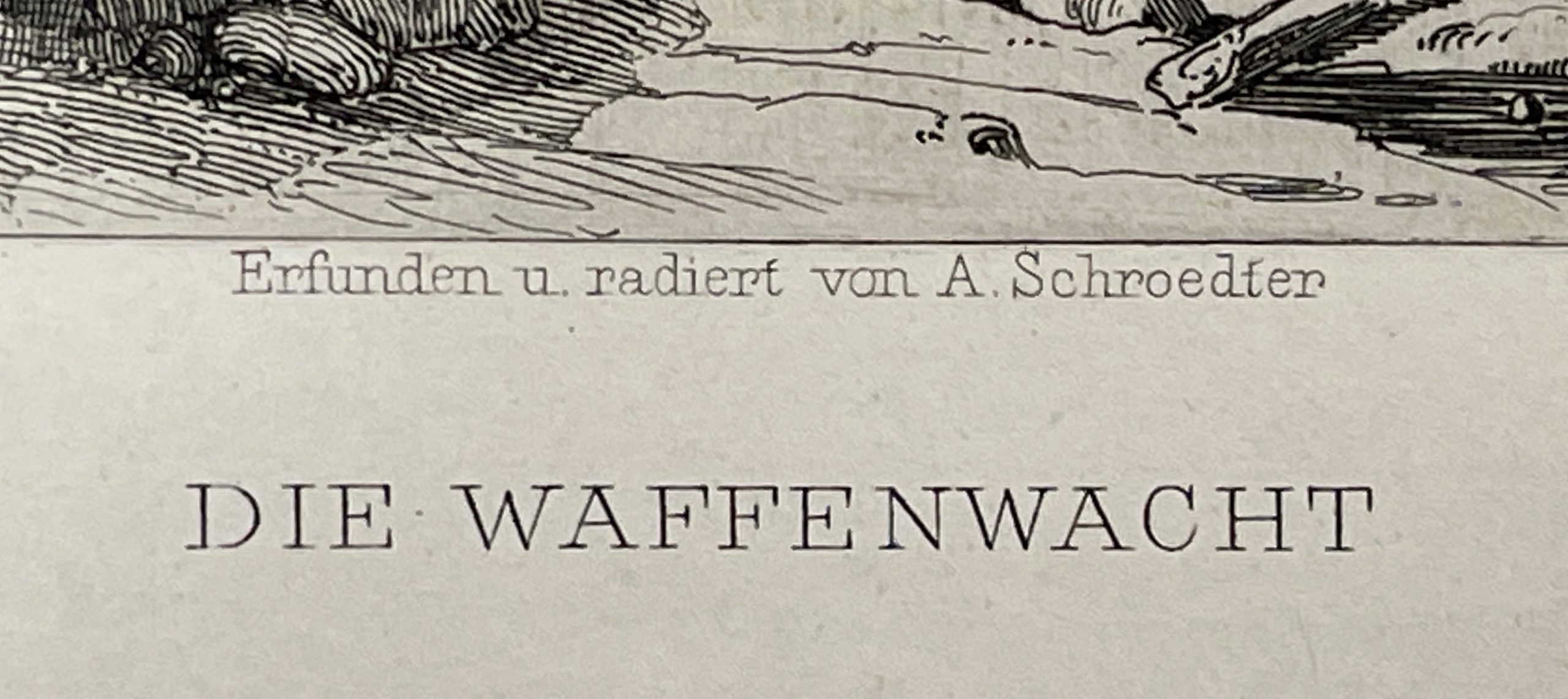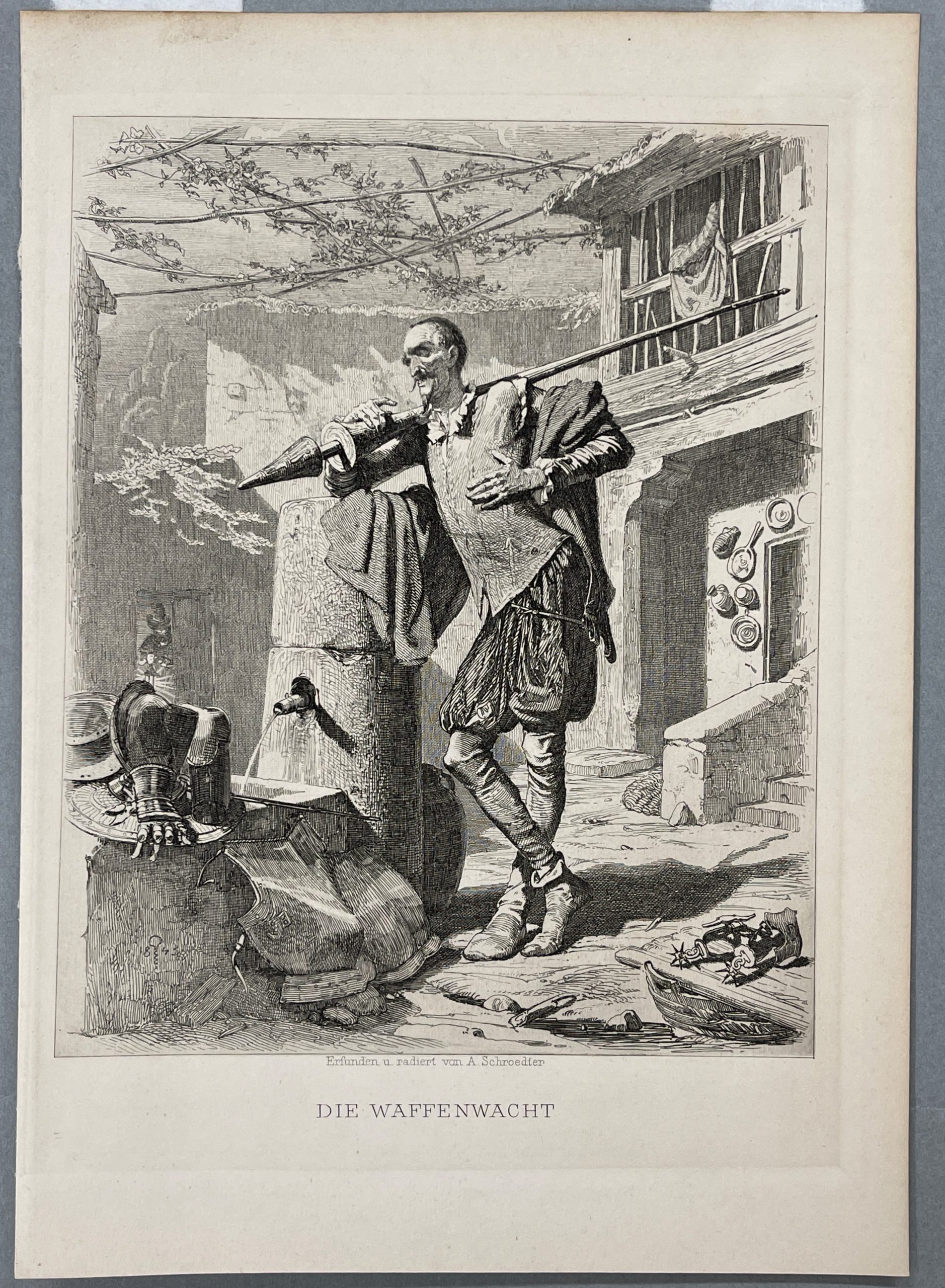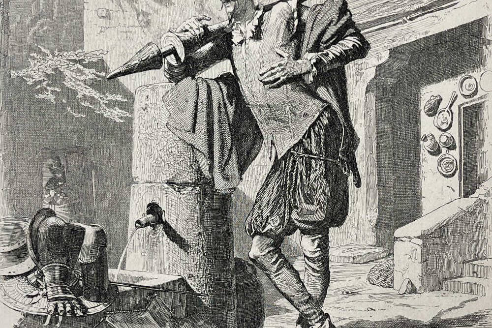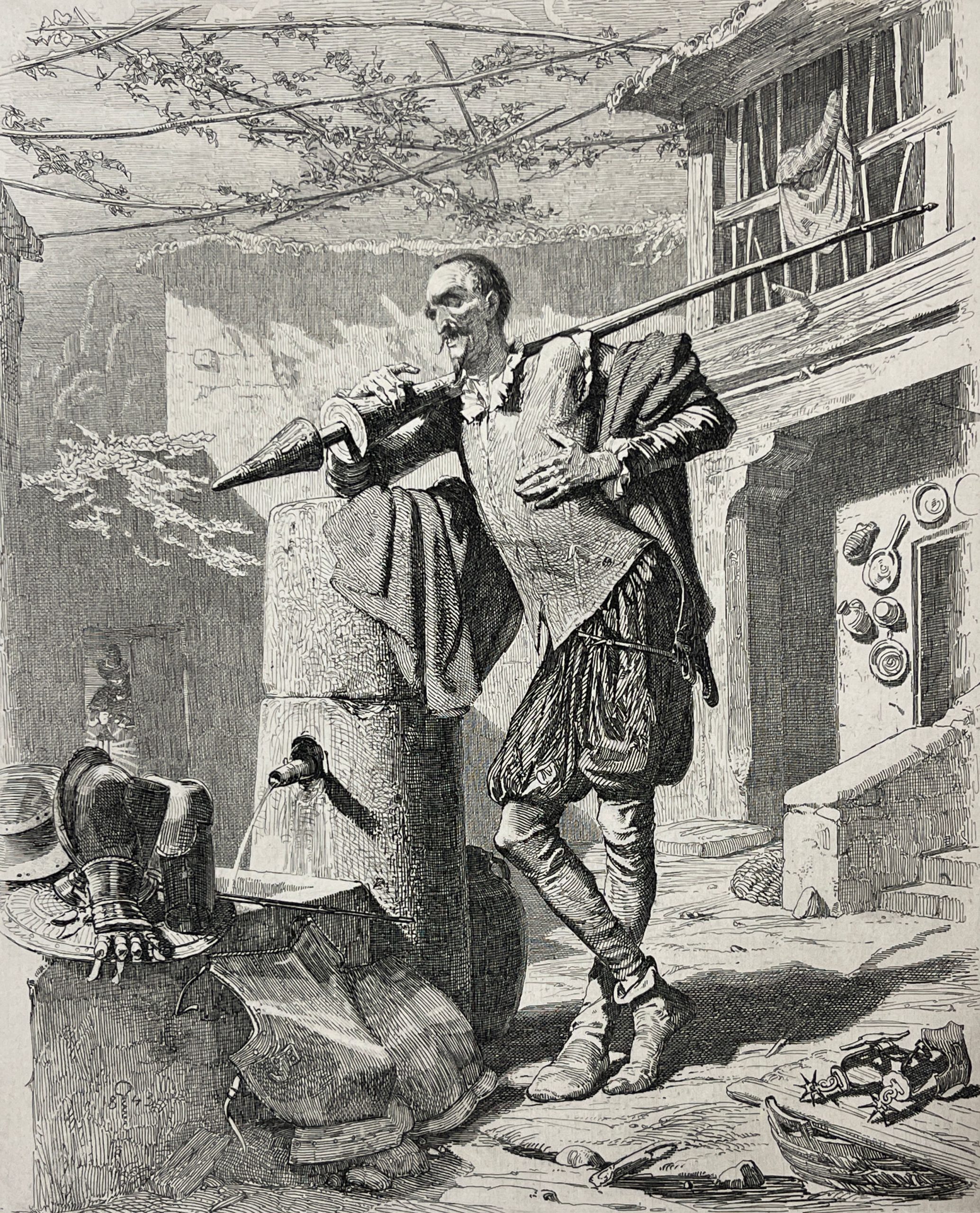 This 1843 etching by the great master Adolf Schrödter illustrates the scene in which Don Quixote prepares to be dubbed a knight. Lacking a powerful lord in a castle, Don Quixote asks his landlord to dub him. The landlord agrees to do it at dawn’s first light. Don Quixote prepares by meditating all night long, after first stowing his weapons safely away in a nearby watering trough. Alas, Don Quixote’s meditative vigil is interrupted by someone coming to use the trough to water his mules; Don Quixote is forced to dispatch his enemy—and all those enemies who follow. Fortunately, the landlord appears and is able to return peace to his courtyard by dubbing Don Quixote immediately, freeing him to begin protecting maidens and aiding widows and orphans.