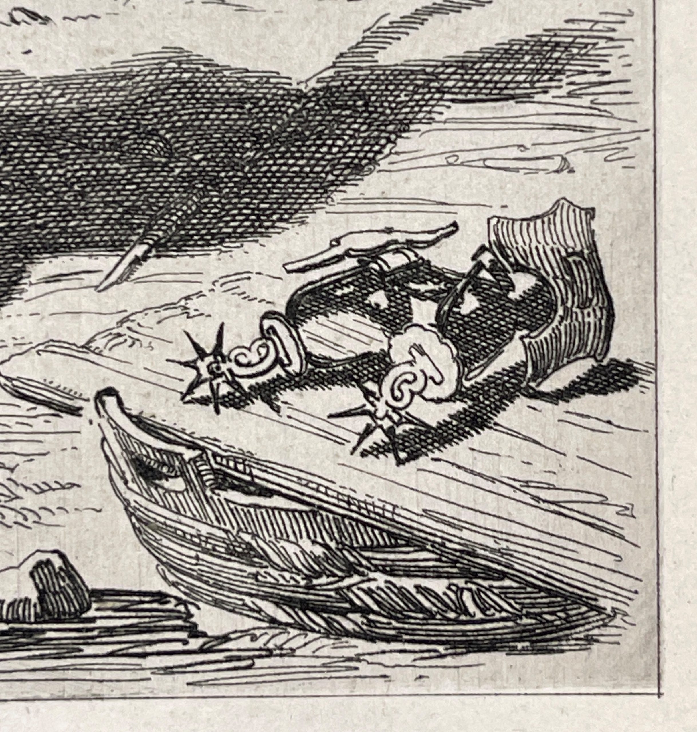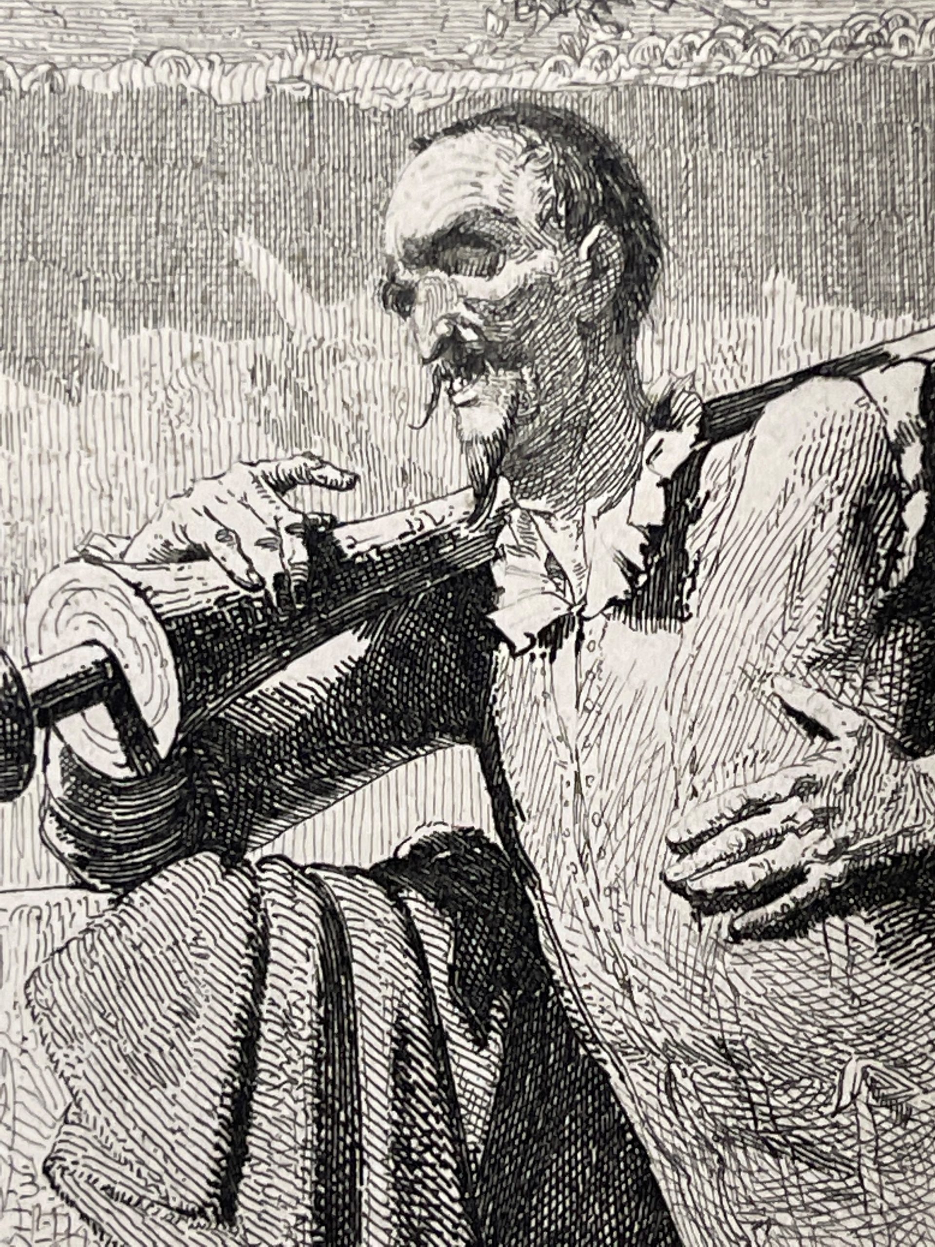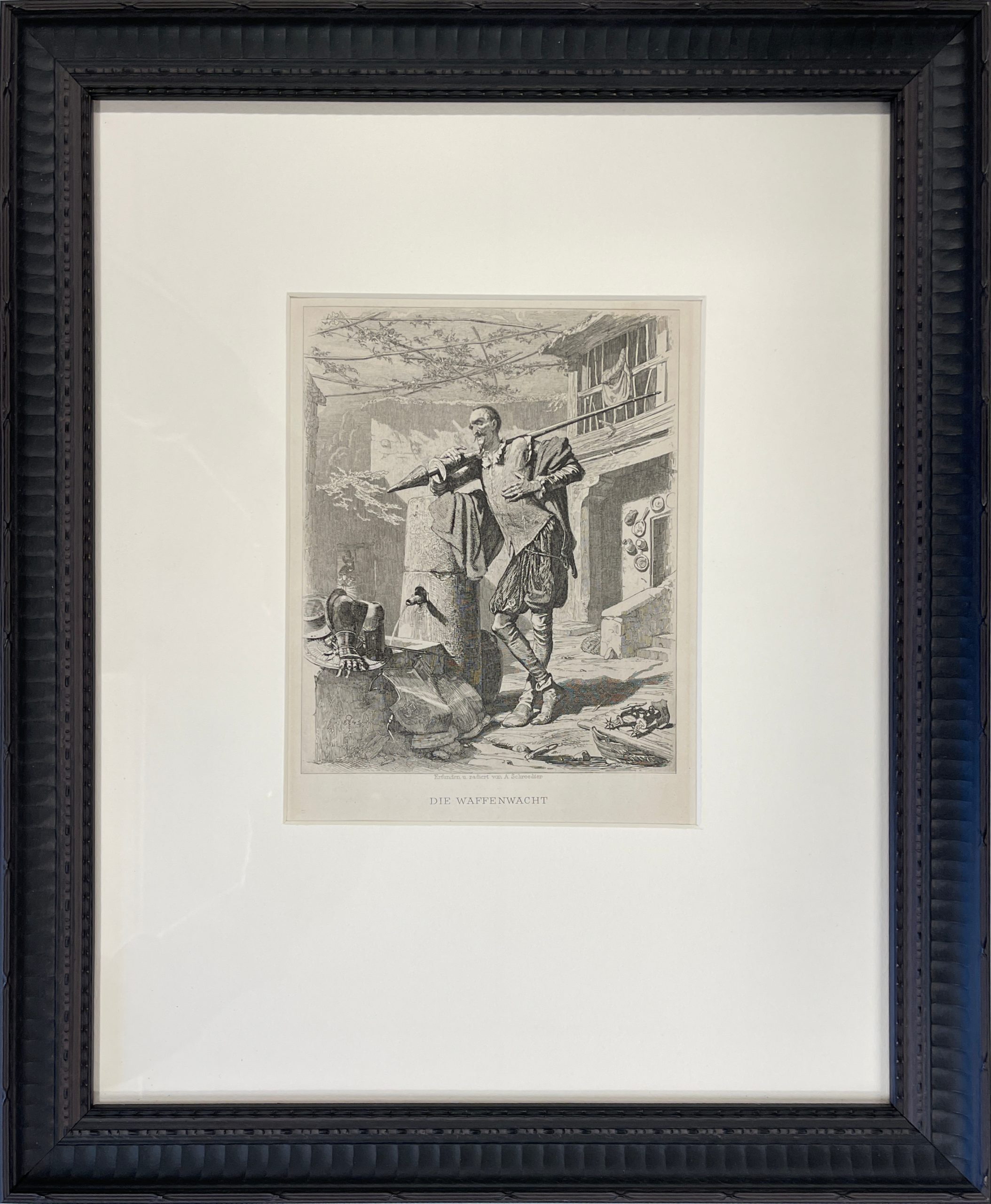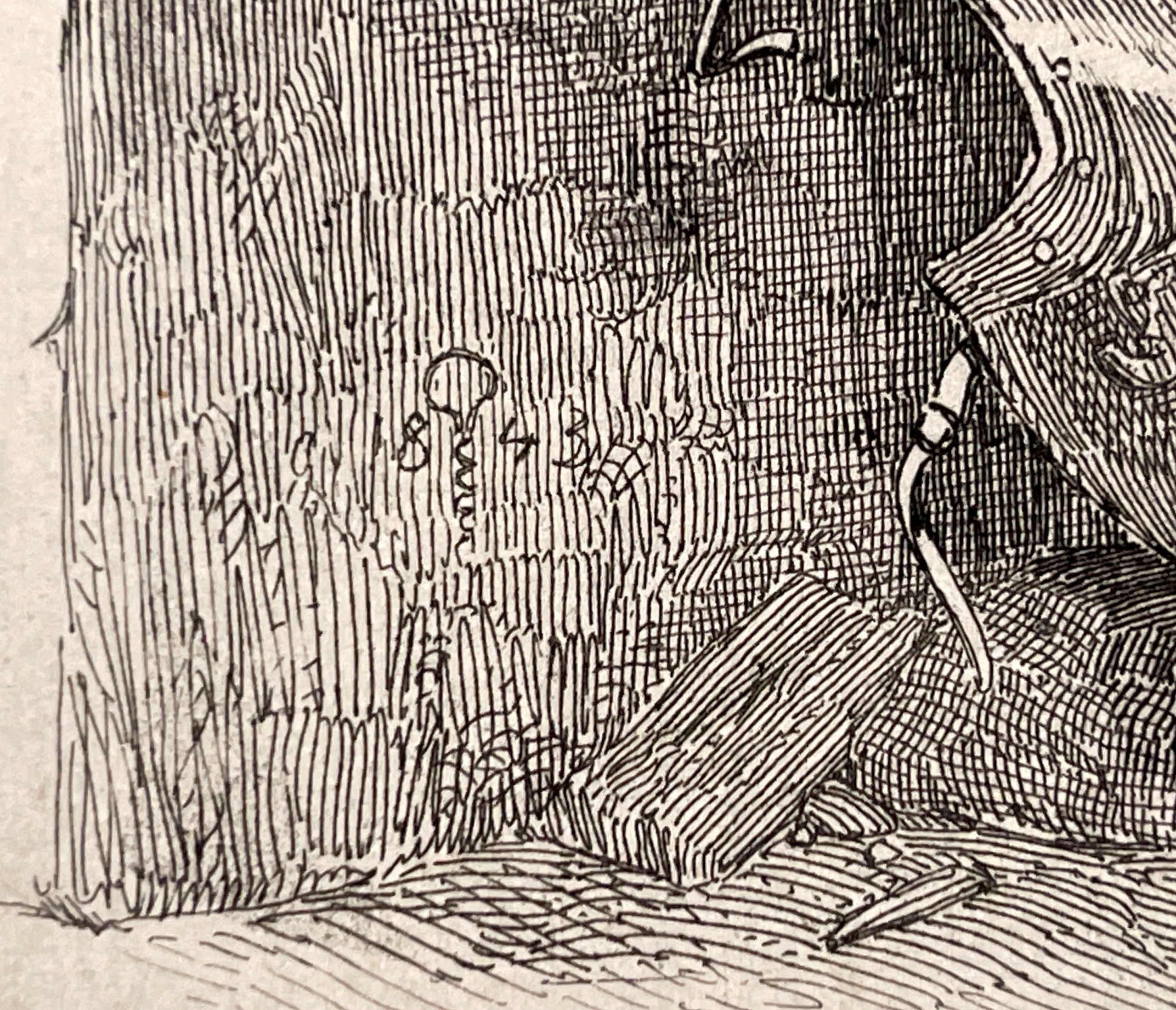 This 1843 etching by the great master Adolf Schrödter illustrates the scene in which Don Quixote prepares to be dubbed a knight. Lacking a powerful lord in a castle, Don Quixote asks his landlord to dub him. The landlord agrees to do it at dawn’s first light. Don Quixote prepares by meditating all night long, after first stowing his weapons safely away in a nearby watering trough. Alas, Don Quixote’s meditative vigil is interrupted by someone coming to use the trough to water his mules; Don Quixote is forced to dispatch his enemy—and all those enemies who follow. Fortunately, the landlord appears and is able to return peace to his courtyard by dubbing Don Quixote immediately, freeing him to begin protecting maidens and aiding widows and orphans.