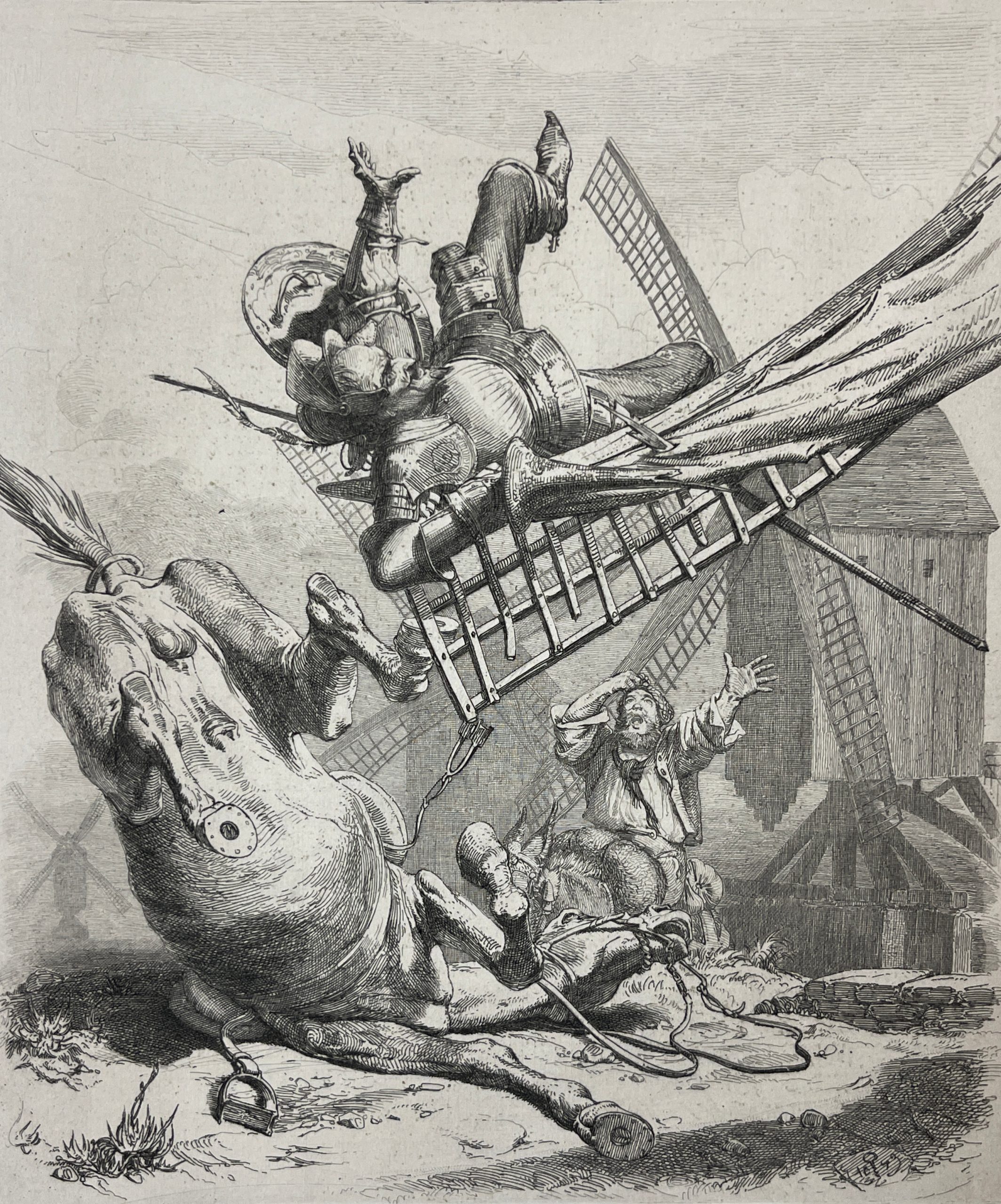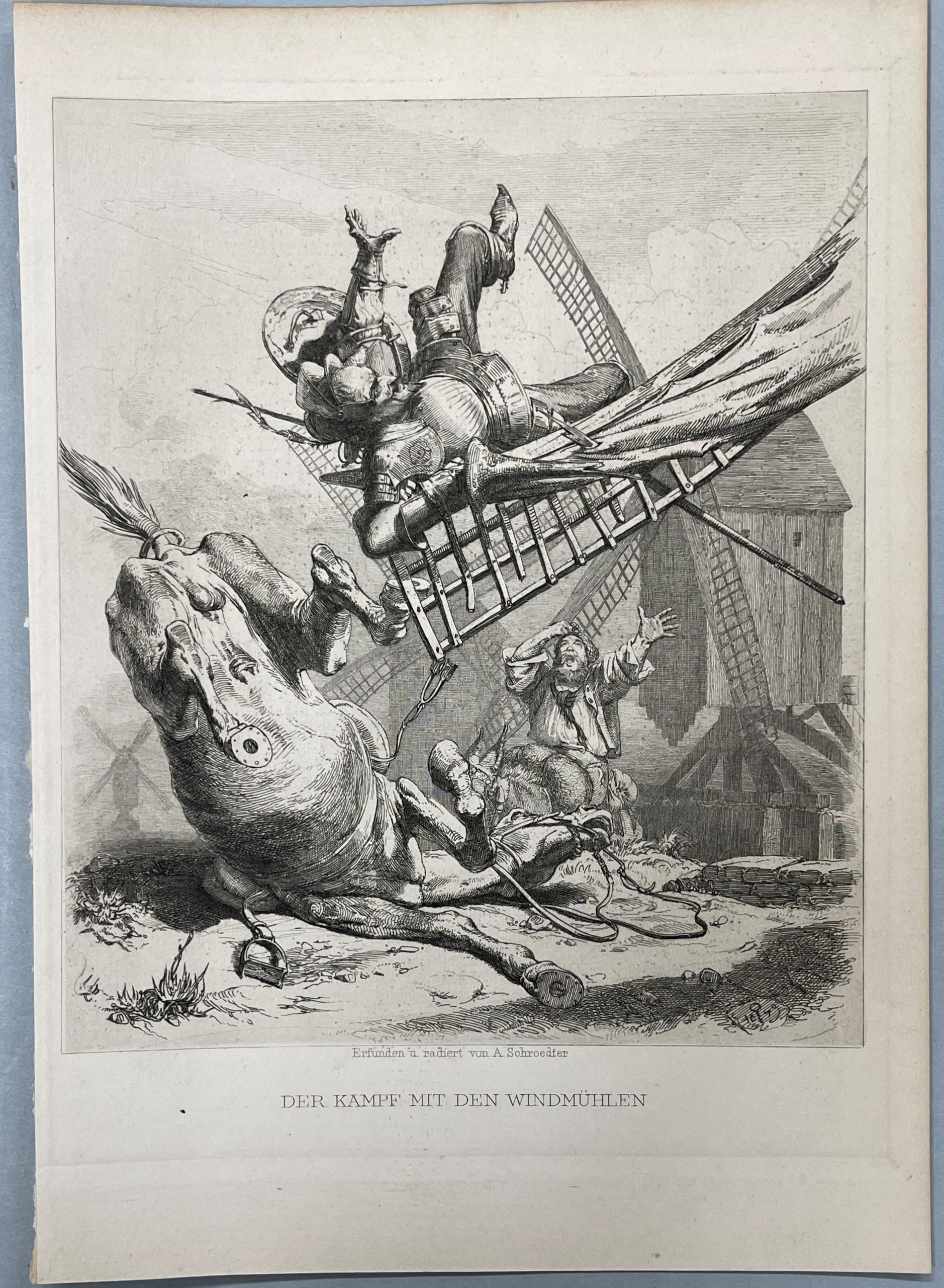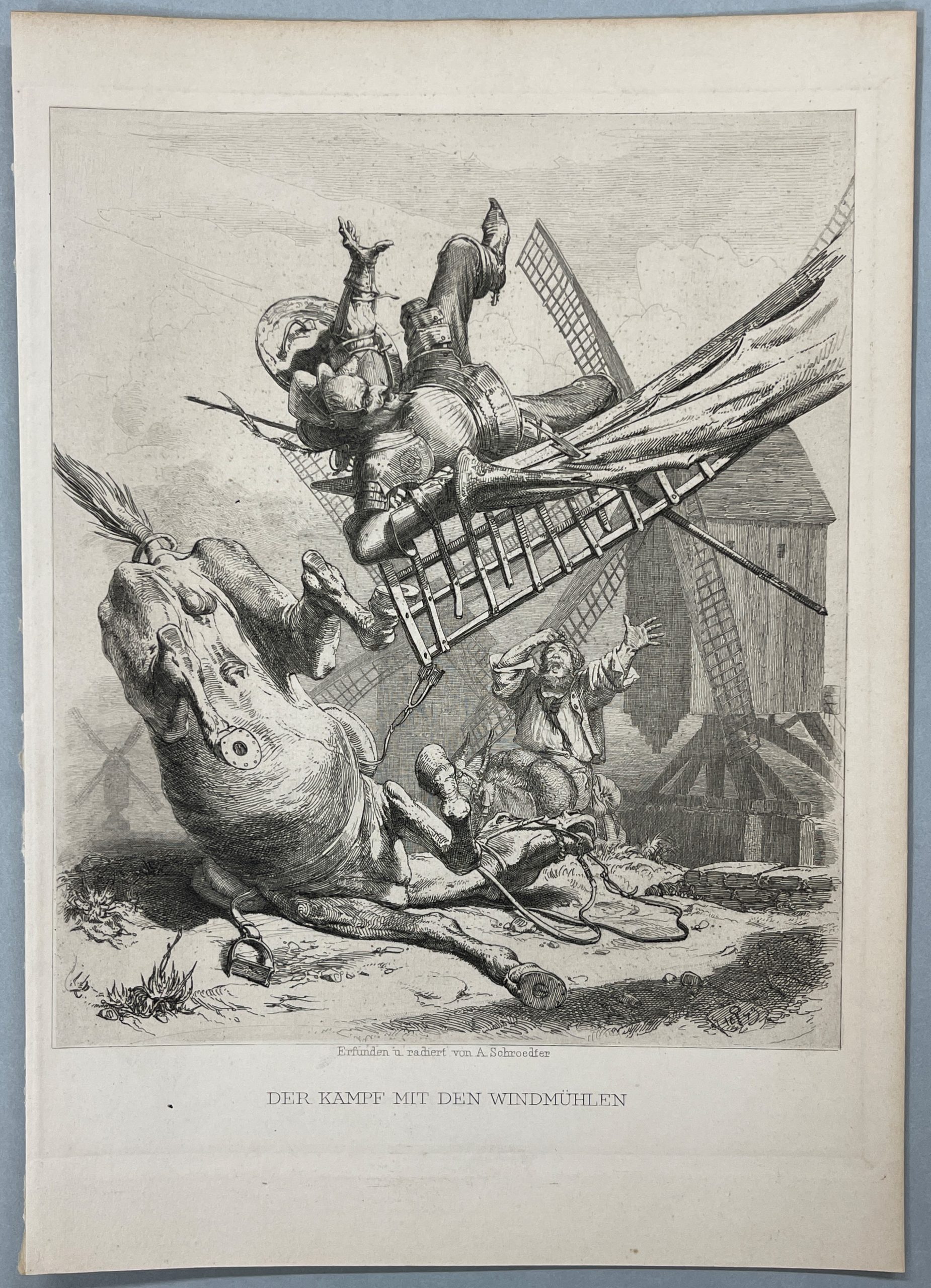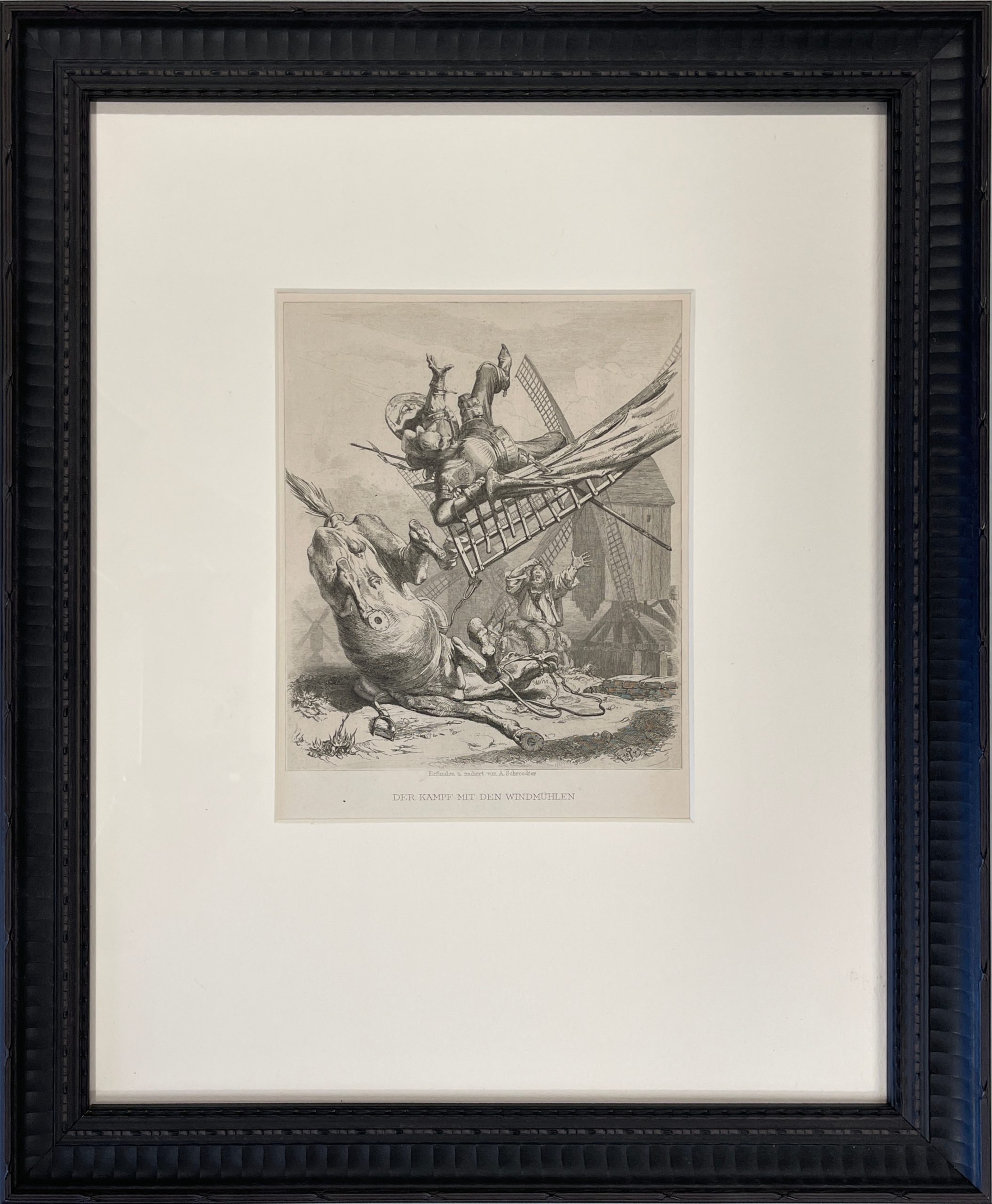 This 1843 etching by the great master Adolf Schrödter illustrates the most famous scene from the book in which Don Quixote tilts at windmills that he thinks are giants.