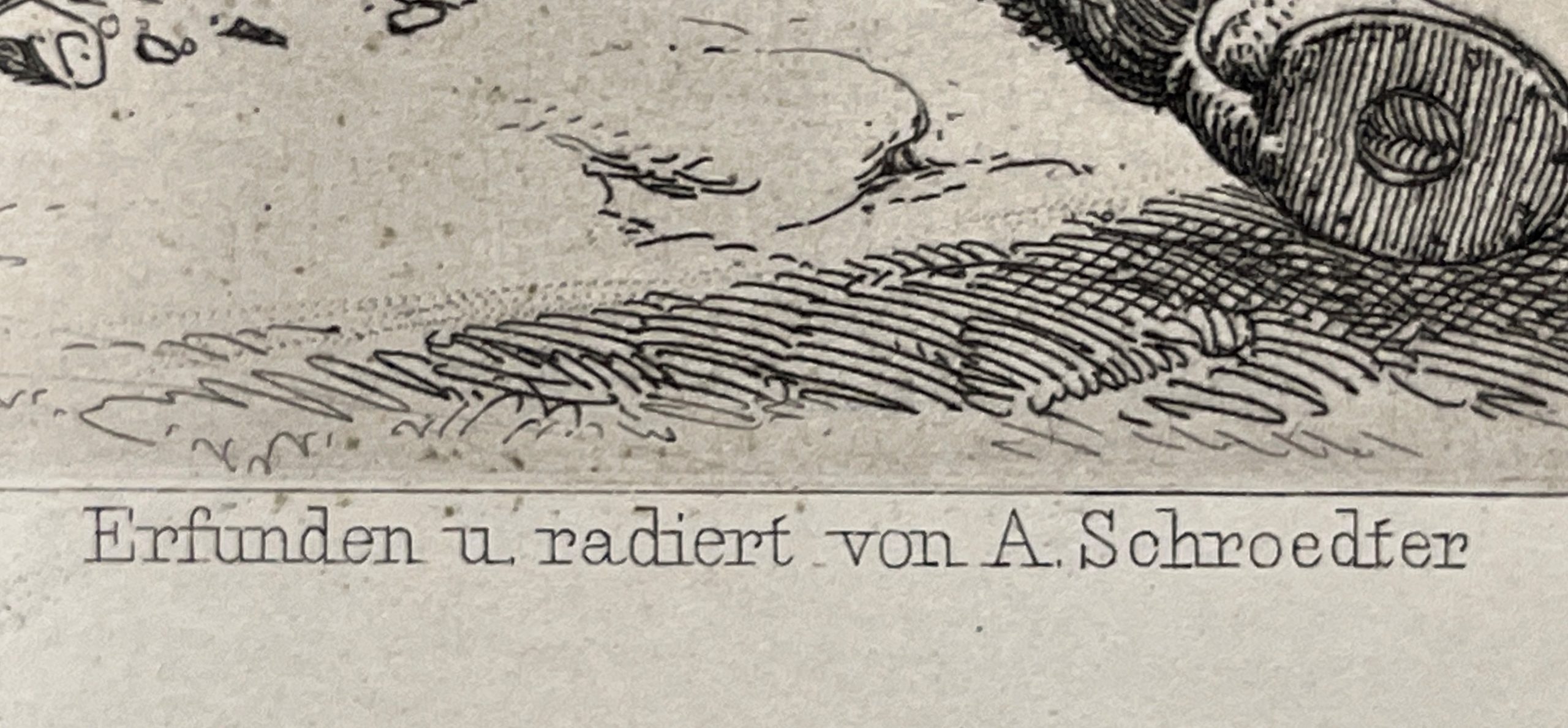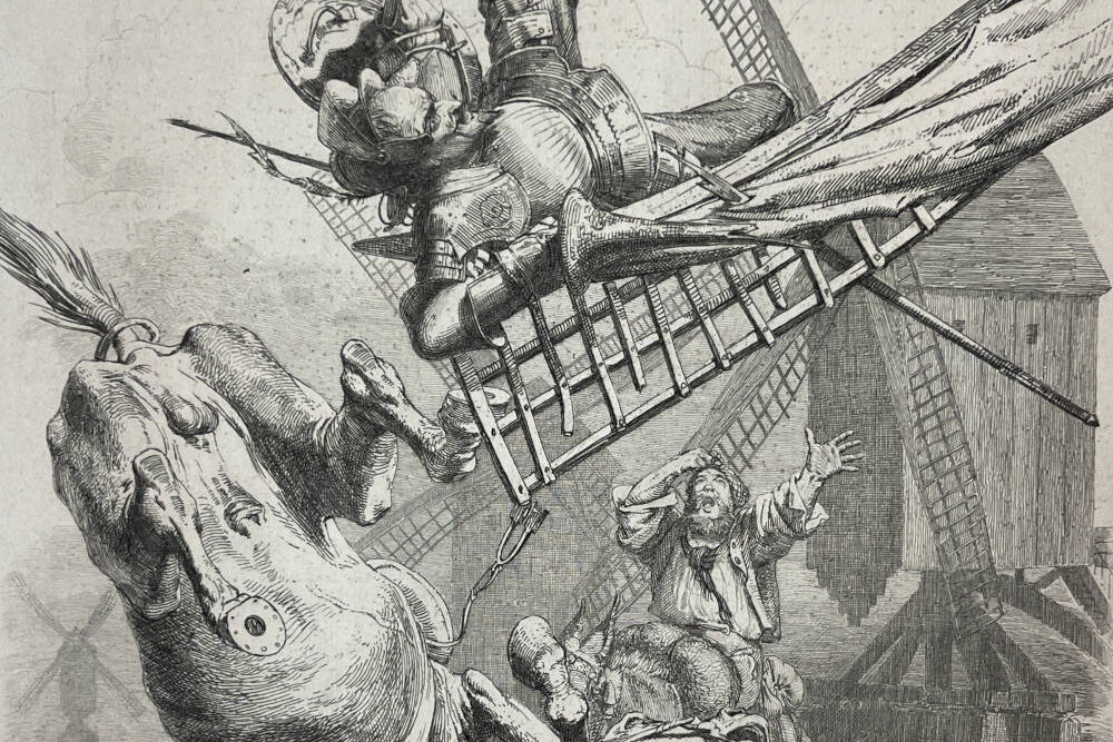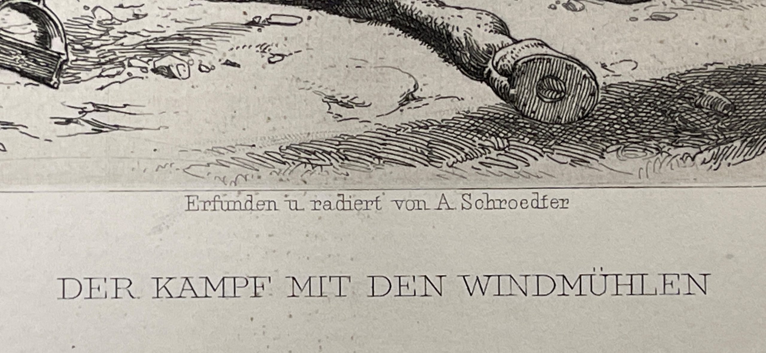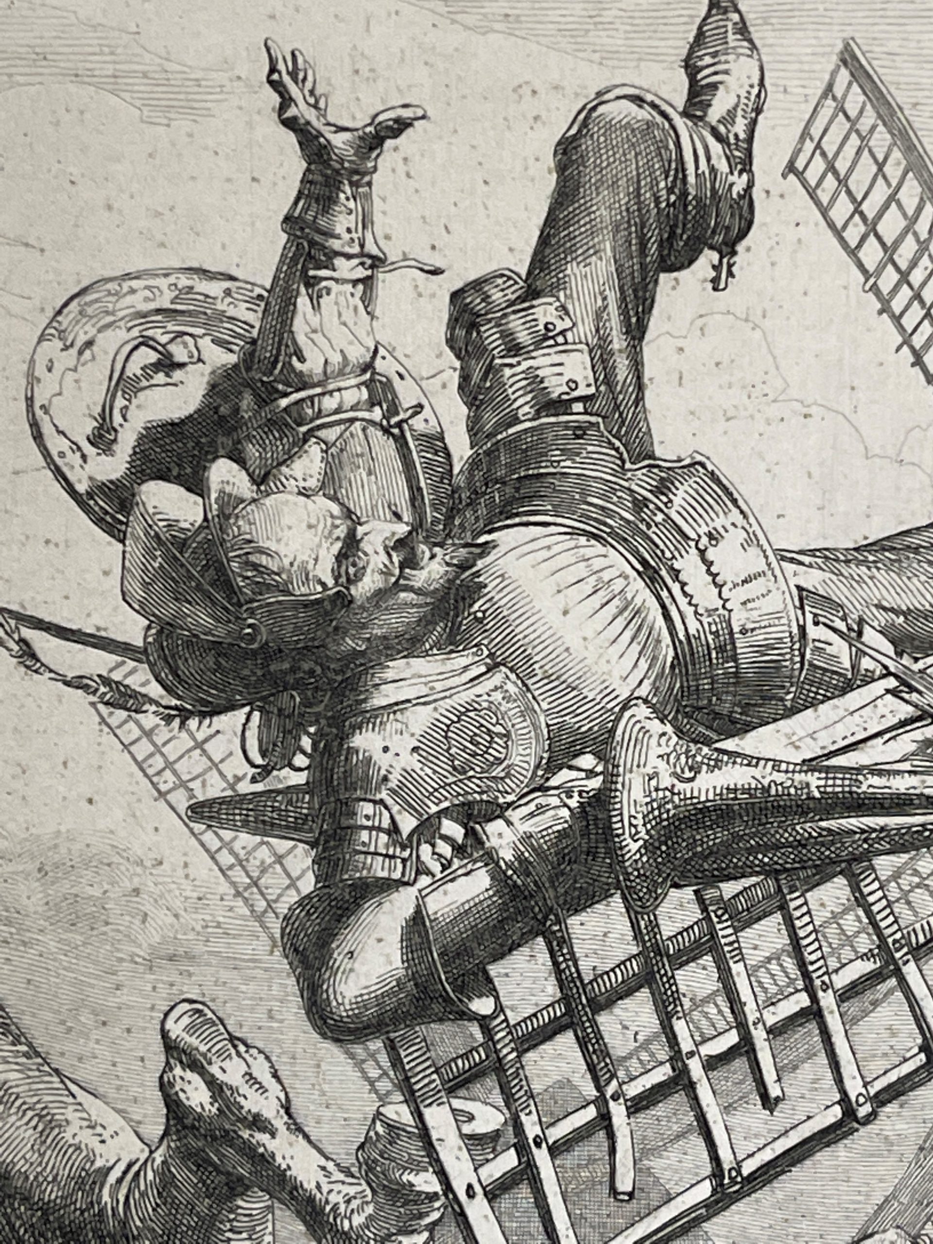 This 1843 etching by the great master Adolf Schrödter illustrates the most famous scene from the book in which Don Quixote tilts at windmills that he thinks are giants.