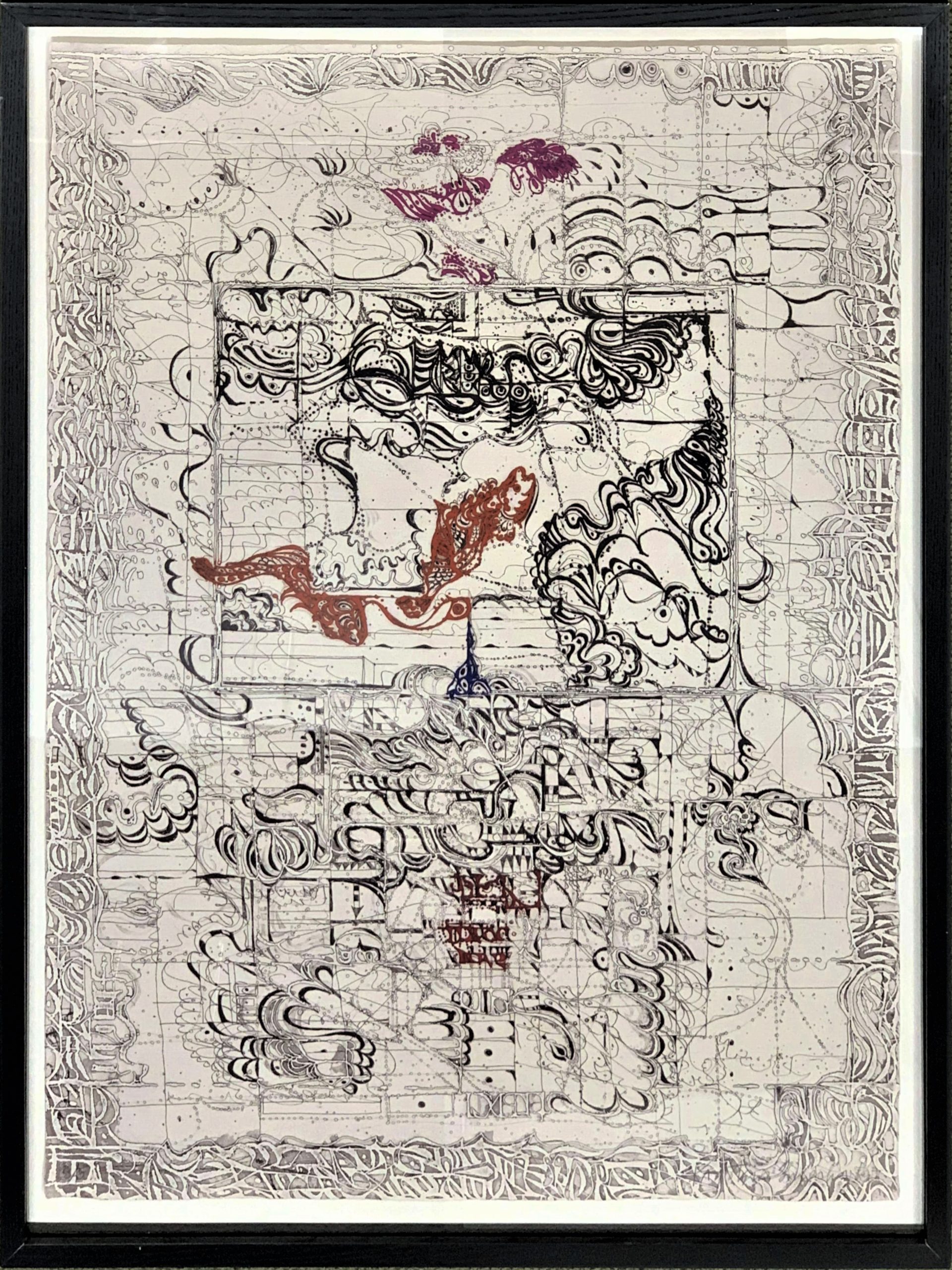 Smiechowska is a master engraver, but her works often combine several modes of expression, such as etching and aquatint, and are often made on previously embossed papers.  This work, for example, was embossed, then engraved and printed, and then hand-painted in red, blue, rust, and purple.