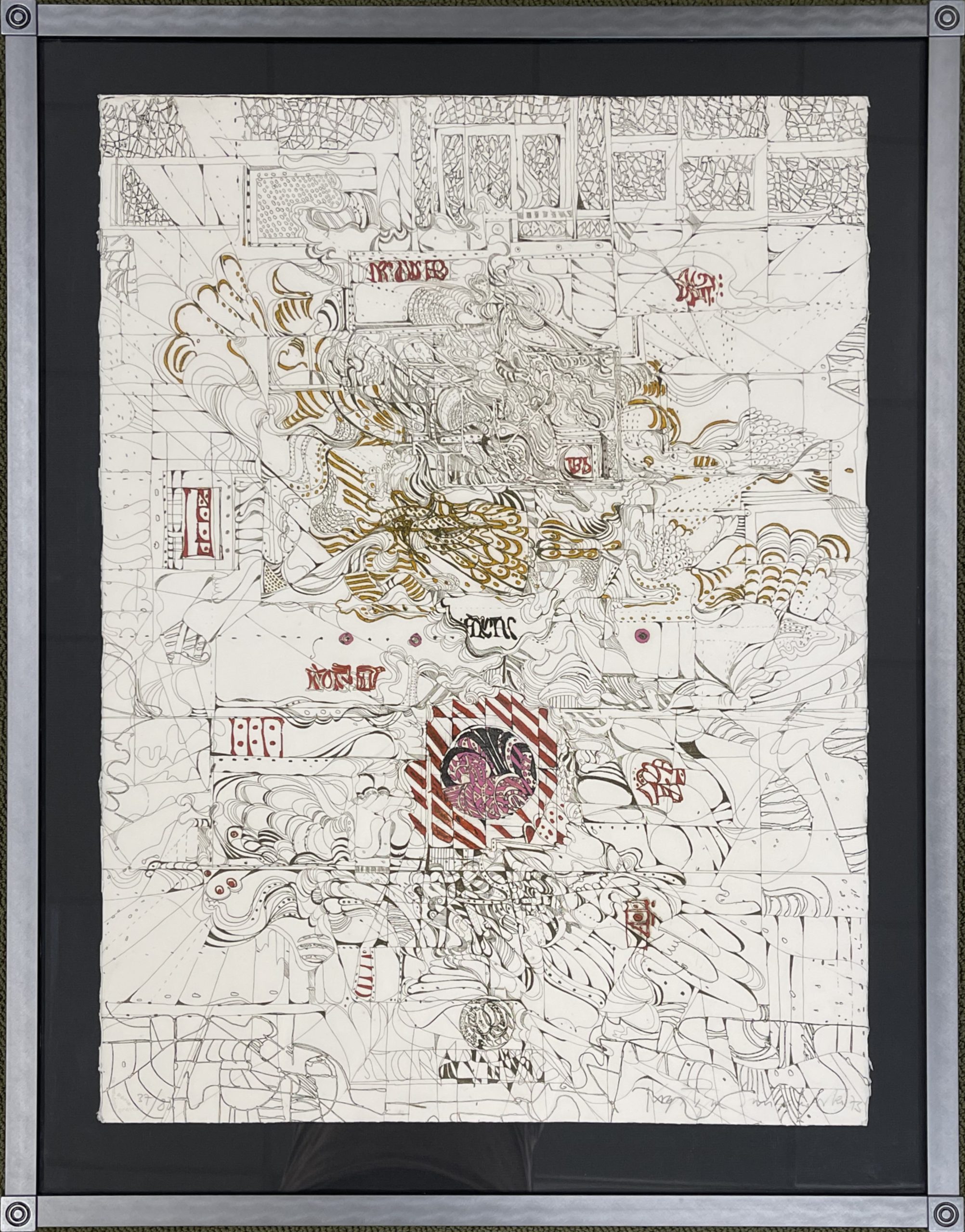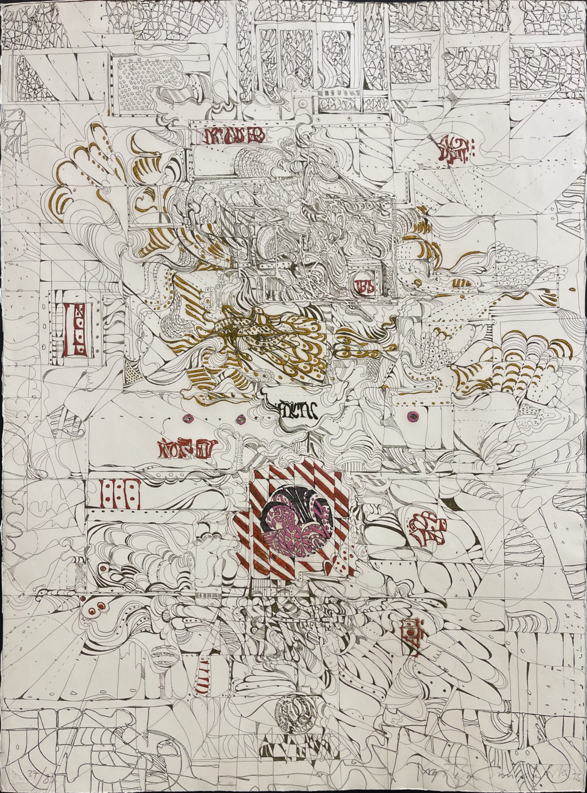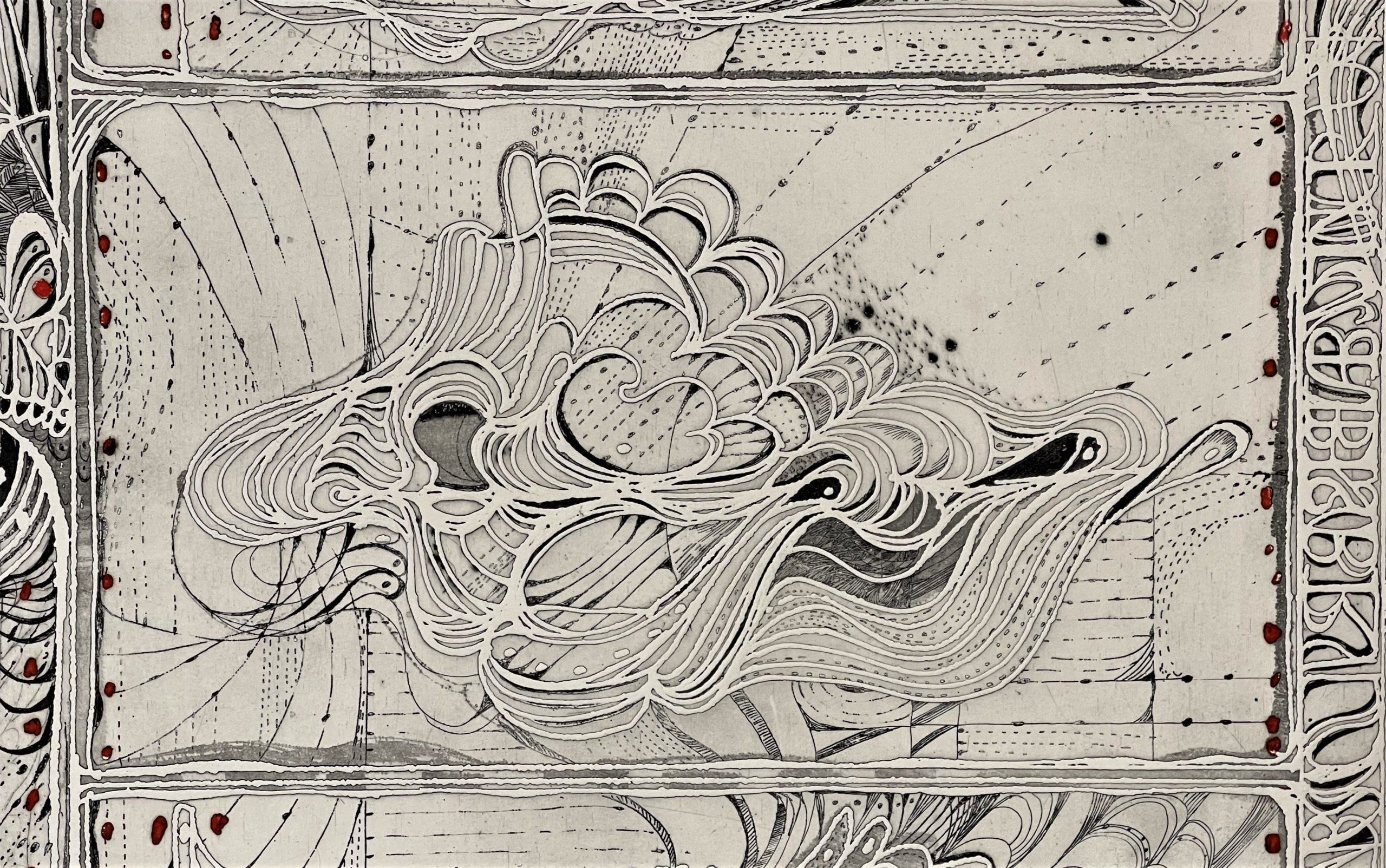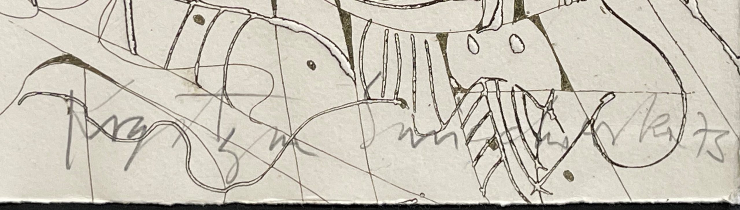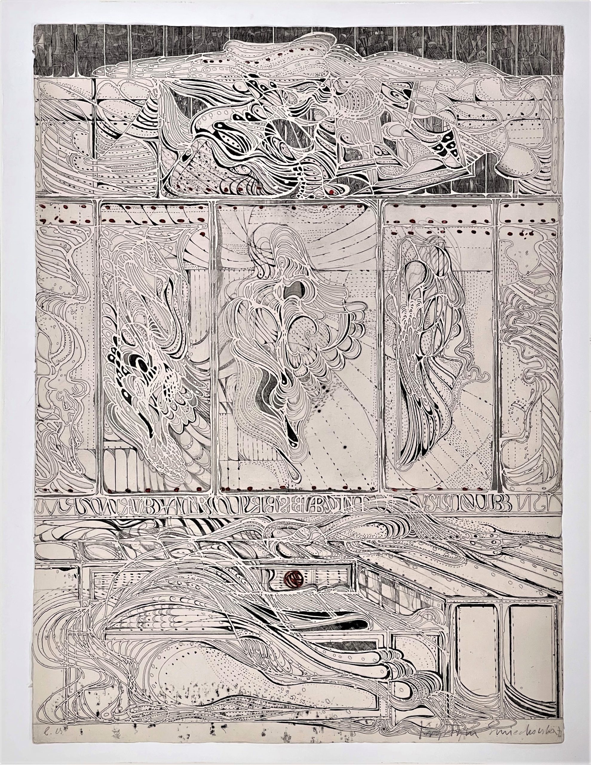 Polish-born printmaker Krystyna Smiechowska draws her inspiration from ancient maps and inscriptions and Slavic manuscripts from the High Middle Ages. She constructs abstract works in which the ancient writings and runes are integrated into the drawing and confer an aura of mystery to the work.
