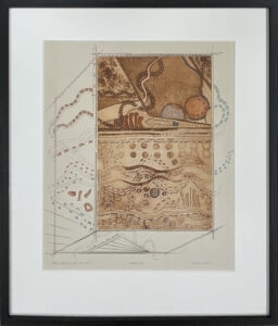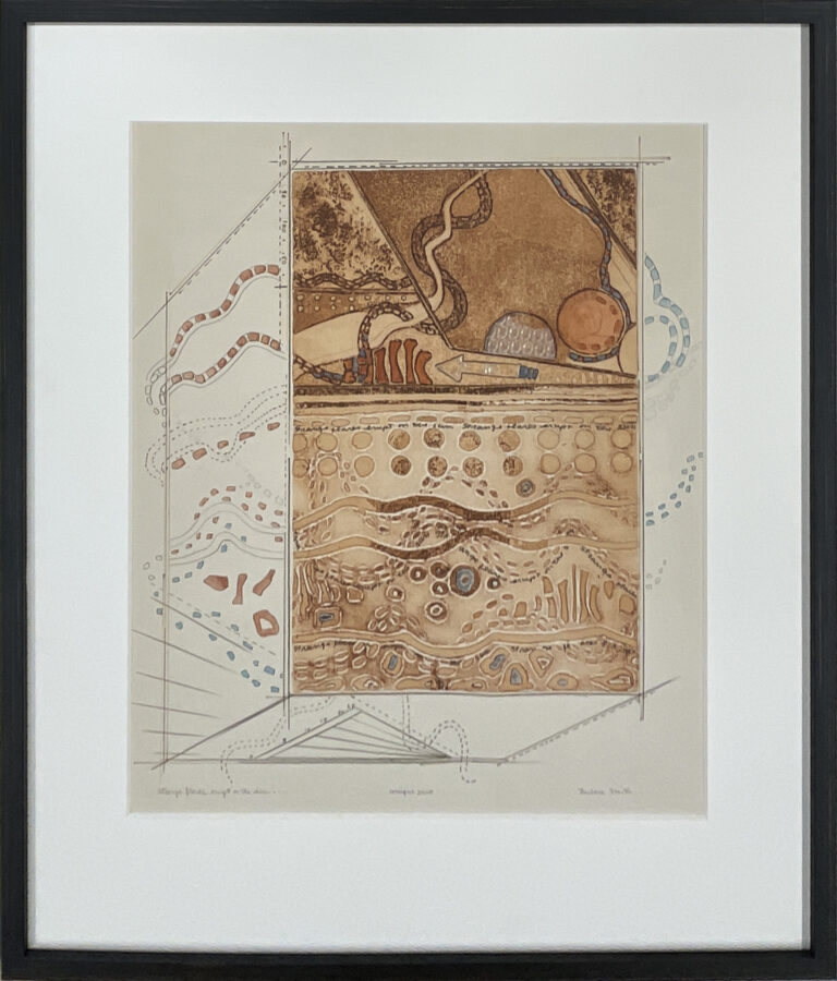 Cleveland-based printmaker Barbara Dworkin Smith was productive and popular.  Though she was a favorite daughter of the Ohio art scene, she had an active exhibition calendar in venues all over the country, particularly in the 1970s.  This picture exemplifies her work, with the organic and earthy feel she often presented, highly-structured but offset with organic forms and organic colors.