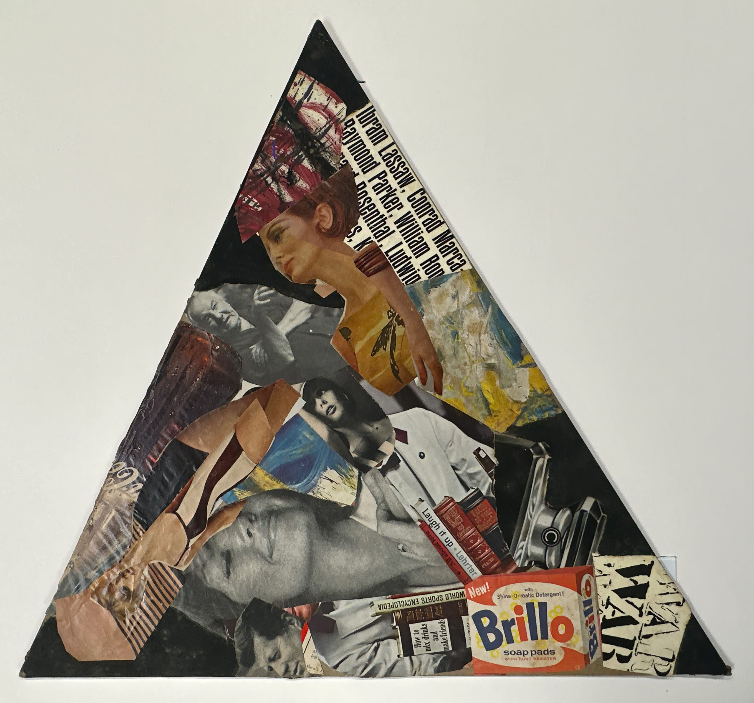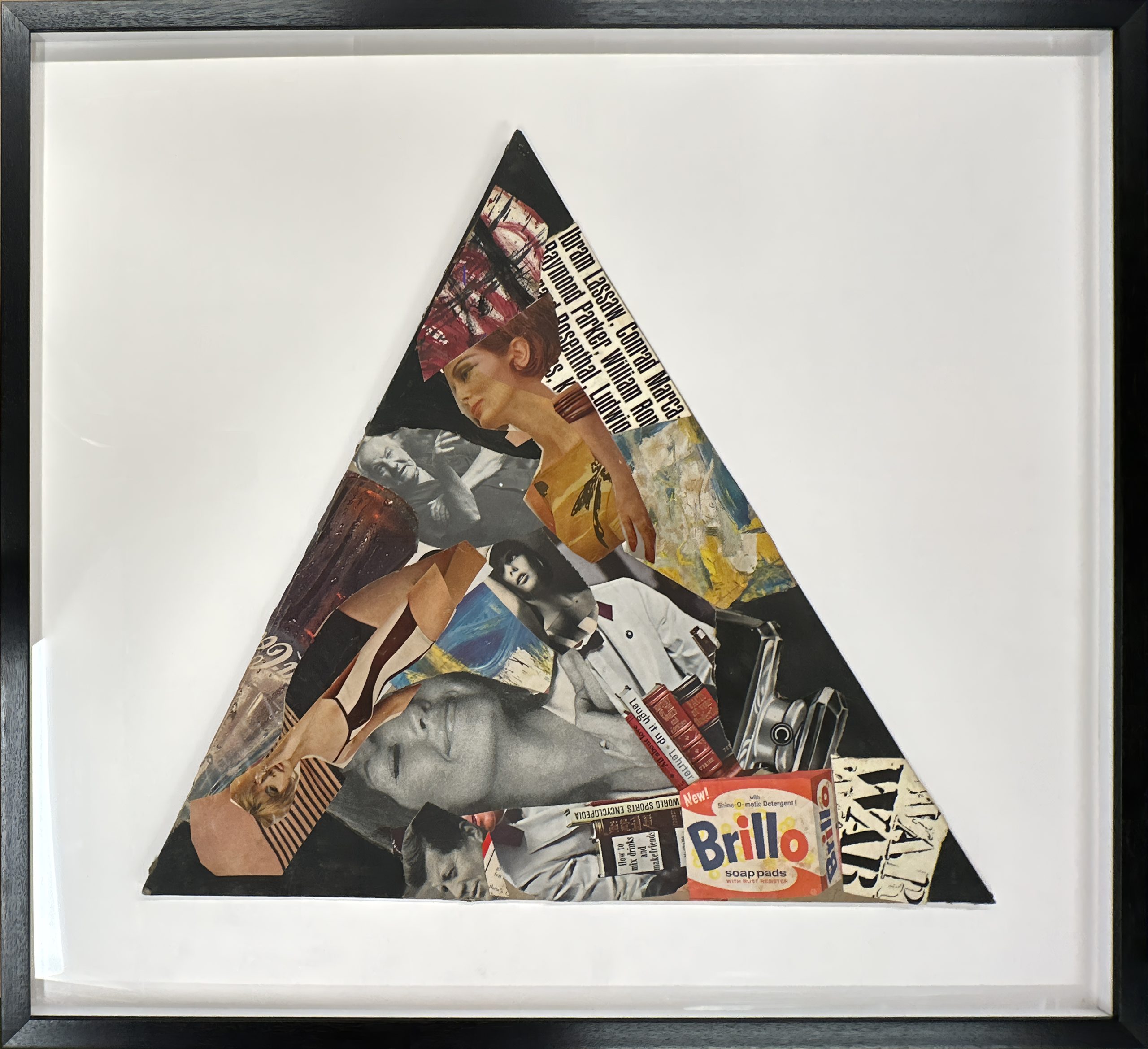 A collage reporting on 1960s history from Sockwell’s perspective. Custom framed in a black-stained solid Ash shadow-box frame behind 99% UV-blocking art glass using strictly conservation-grade materials.