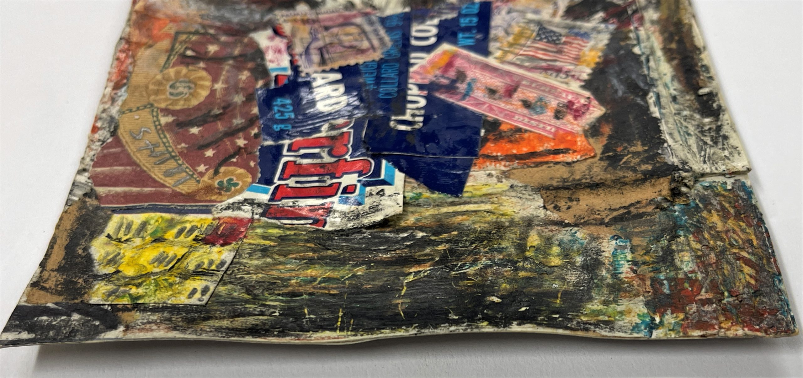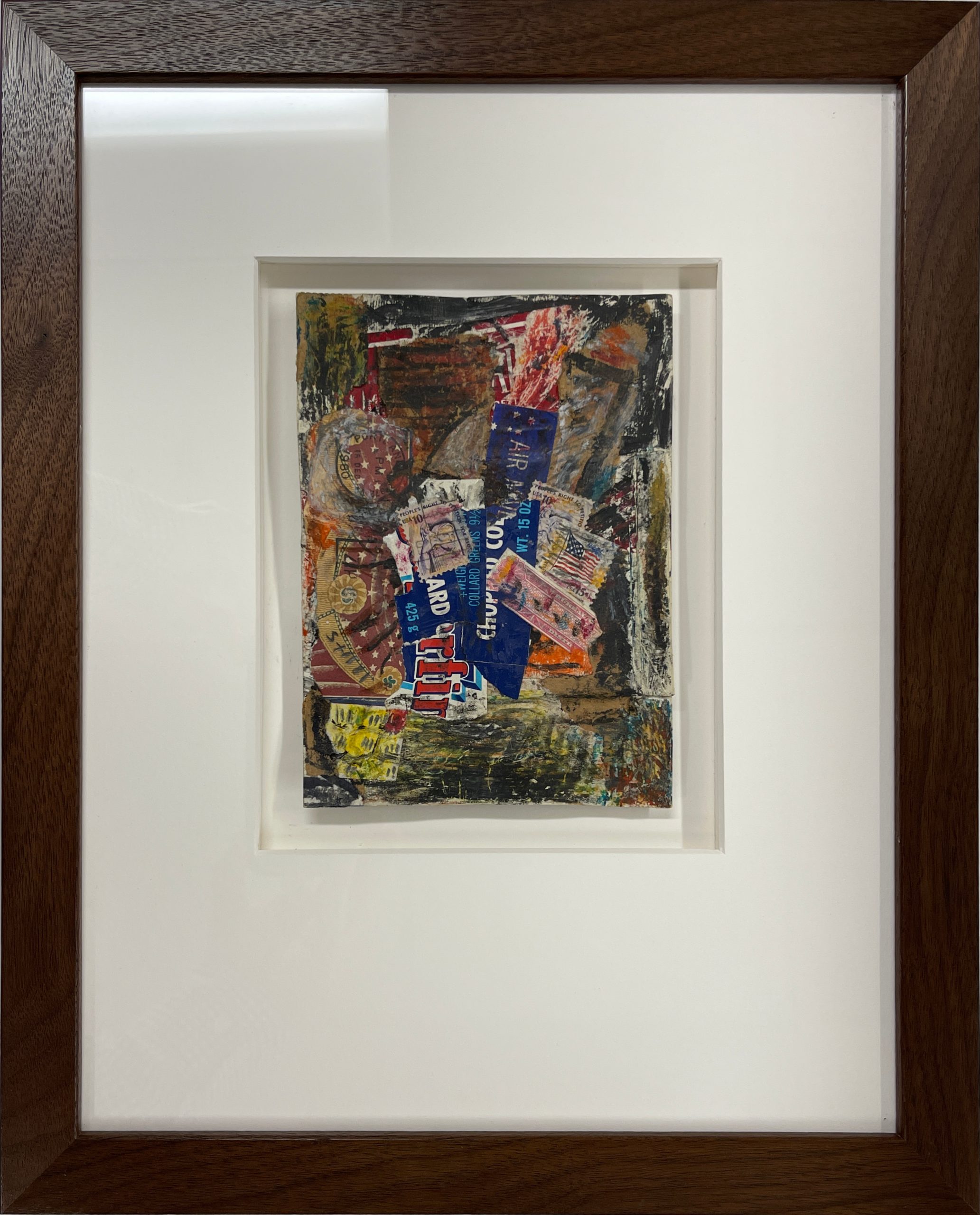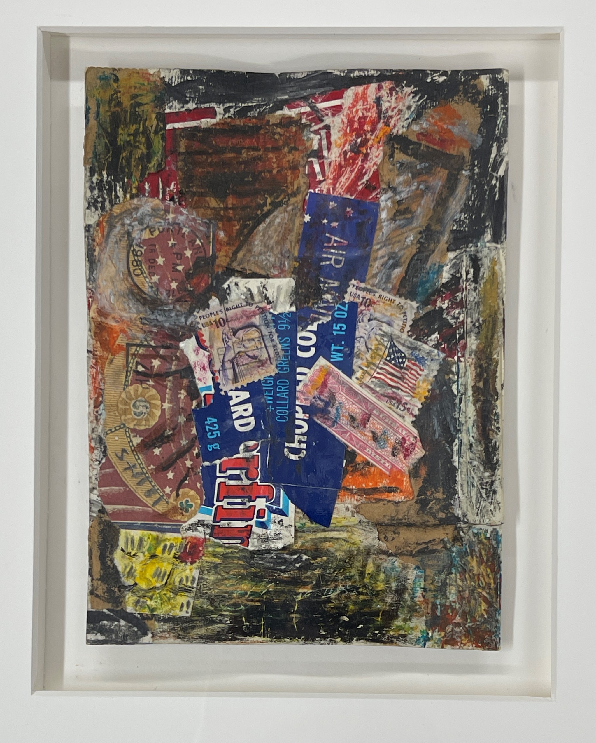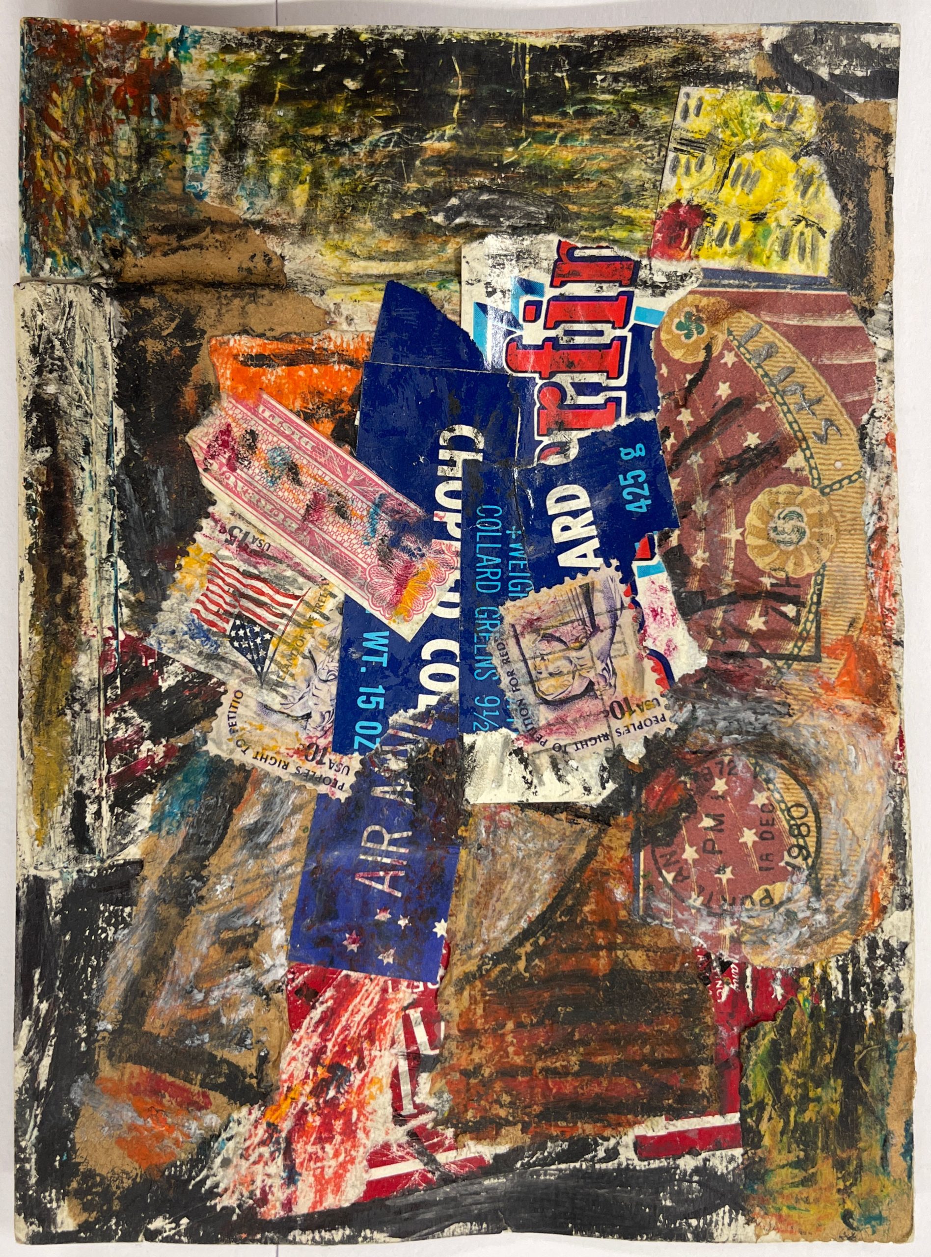 Found Objects [U.S. Postage Stamps], Crayon, And Paint On Paper