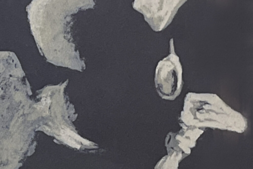 Silkscreen (serigraph) in multiple colors on dark brown background, printed on fine artist’s paper.