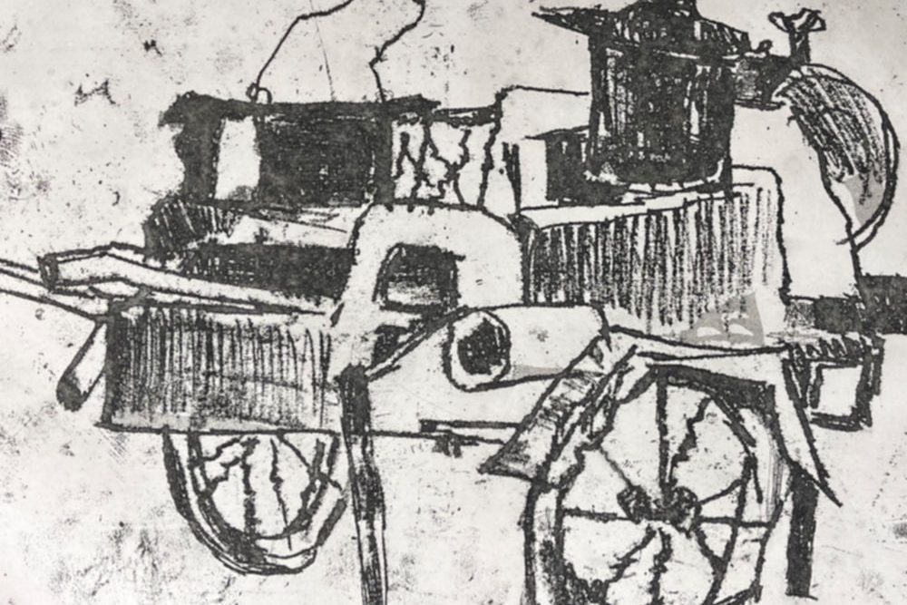 Joseph Solman was fascinated with city life, giving rise to his famous subway paintings. In the 1960s he became fascinated with the tar carts that were seen across the city. A burner kept the tar molten and available for roof sealing, macadam road repair, and numerous other purposes.
