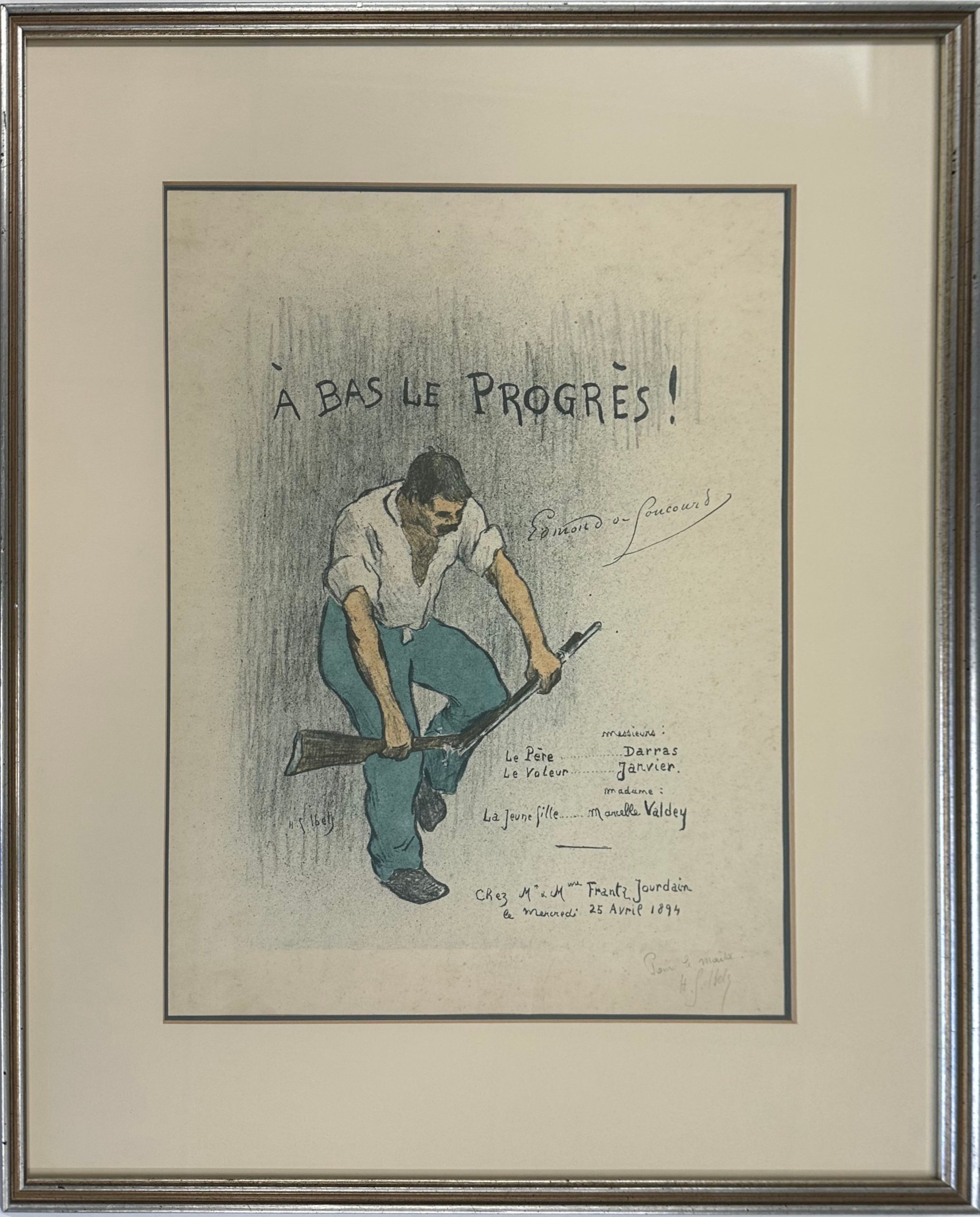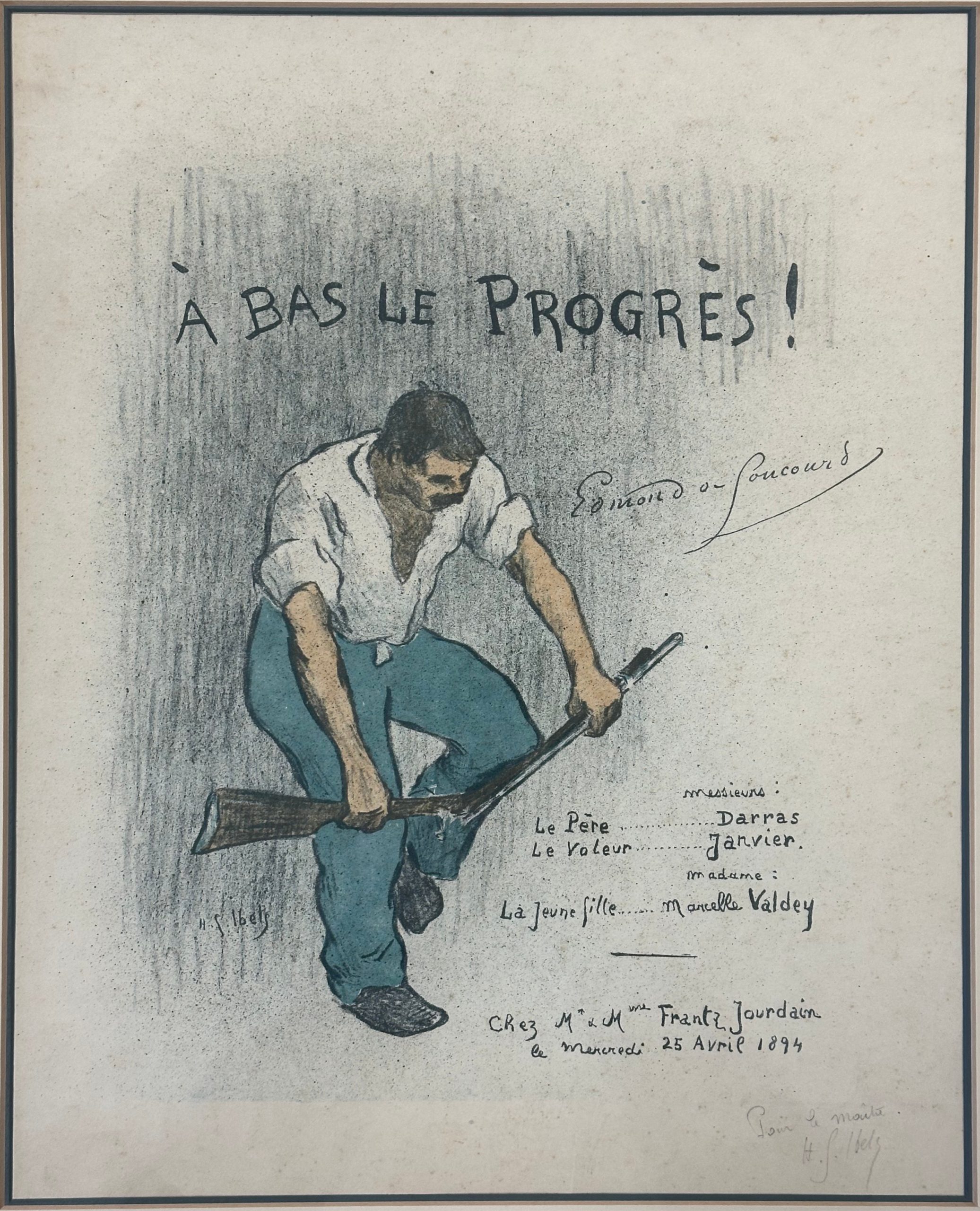 Ibels created this lithograph for use as a theater program for “A Bas le Progrès” by Edmond de Goncourt, a satirical work written and first presented in 1893. It was no mistake that Ibels was drafted to prepare this cover; he was a passionate theater lover and passionate in his attacks on bourgeois values.