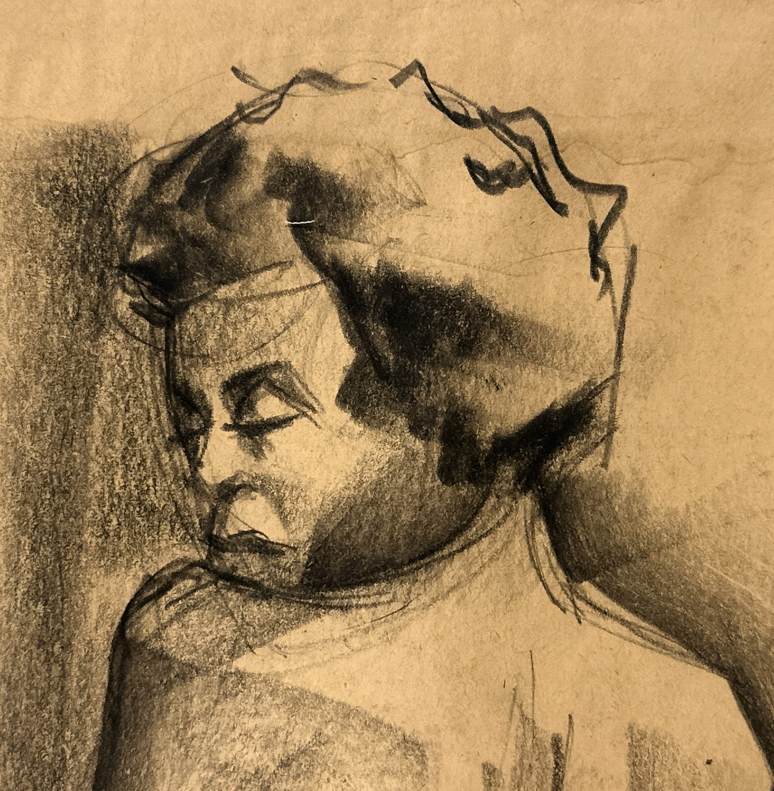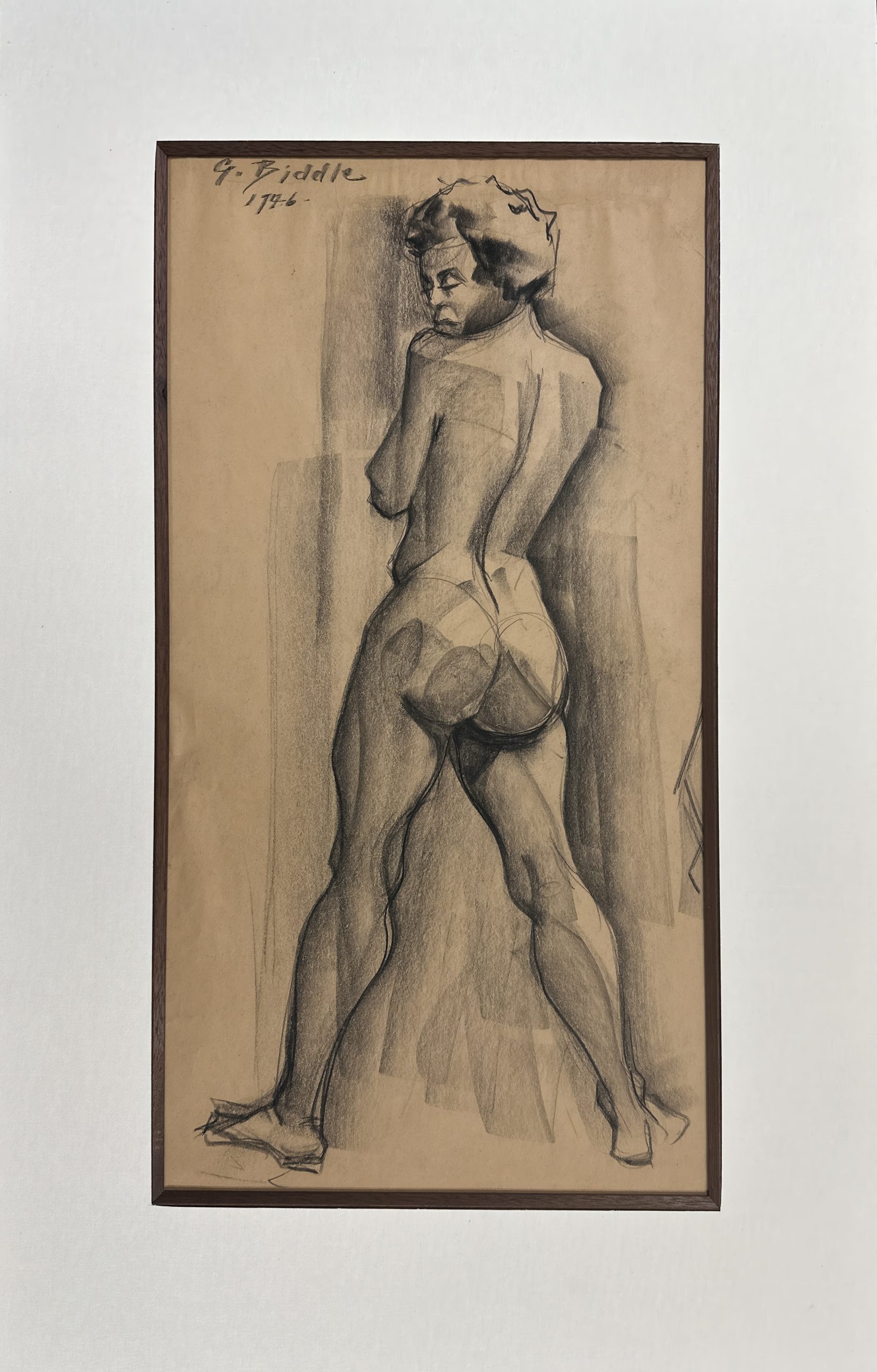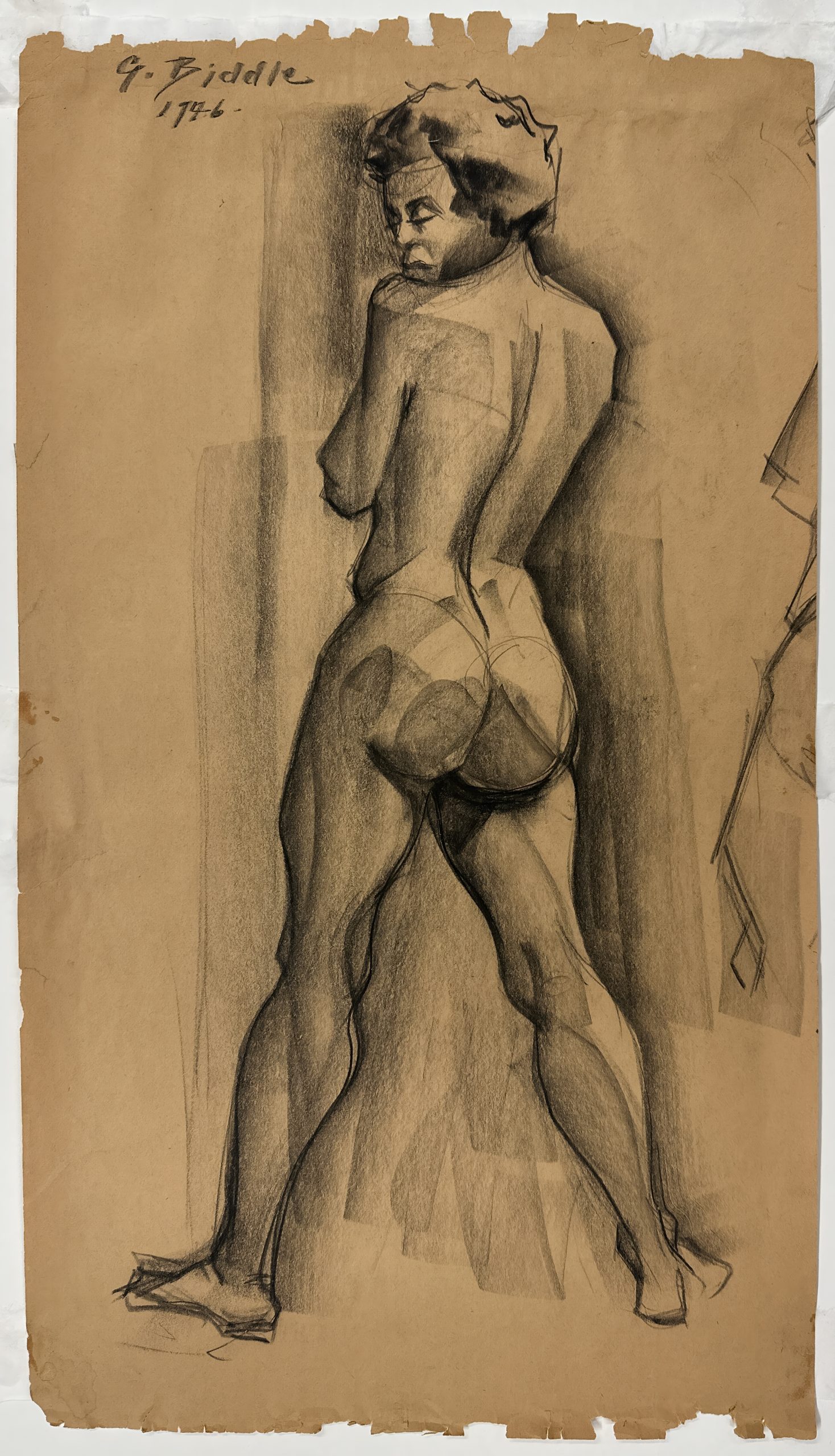An academic drawing of a female nude, executed in charcoal on brown paper. The work is a superb demonstration not only of Sterne’s extraordinary facility and skill but also of the academic’s approach to drawing—and an enchanting picture beyond all that.