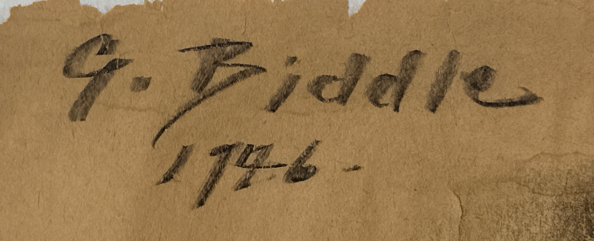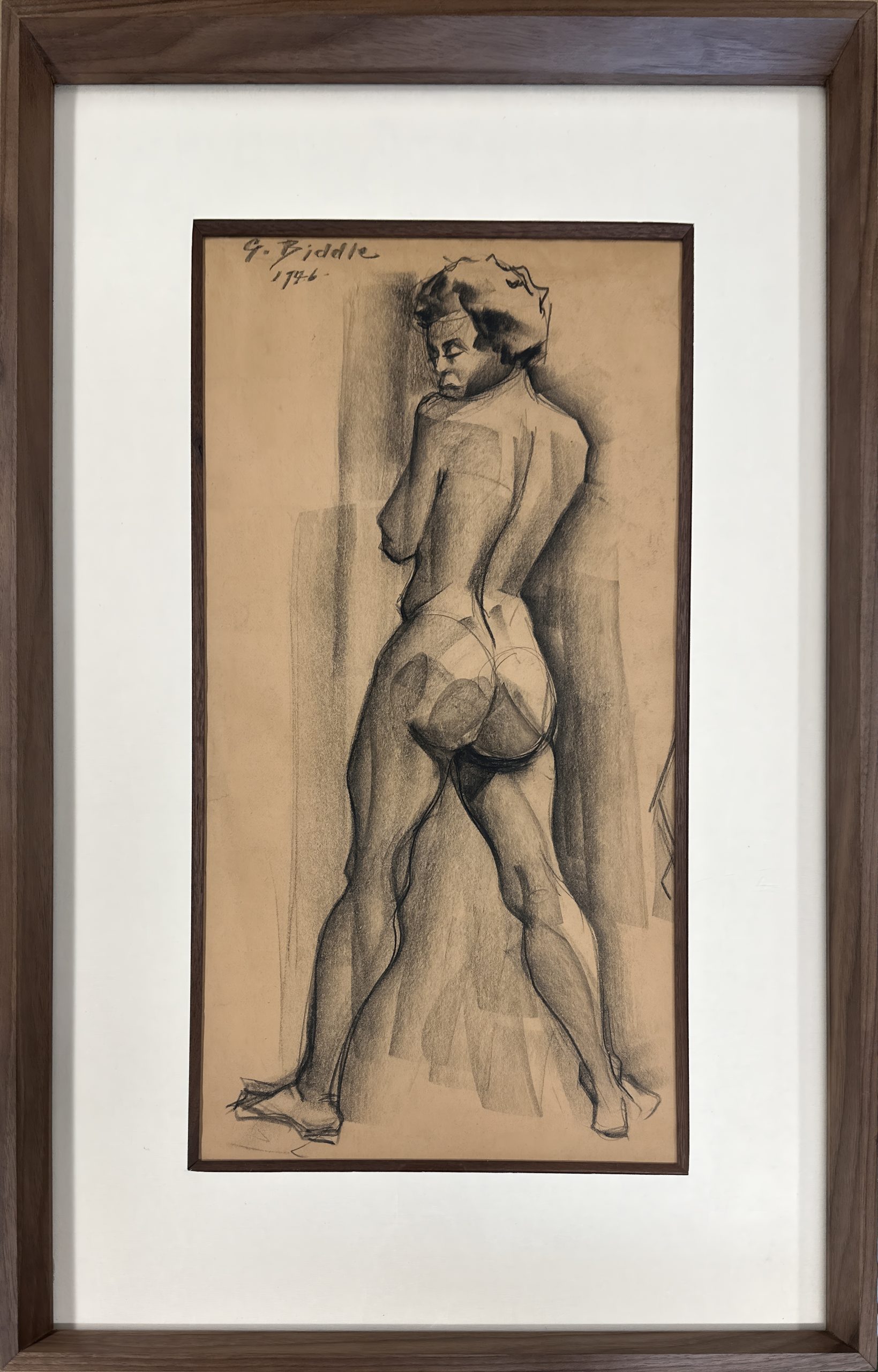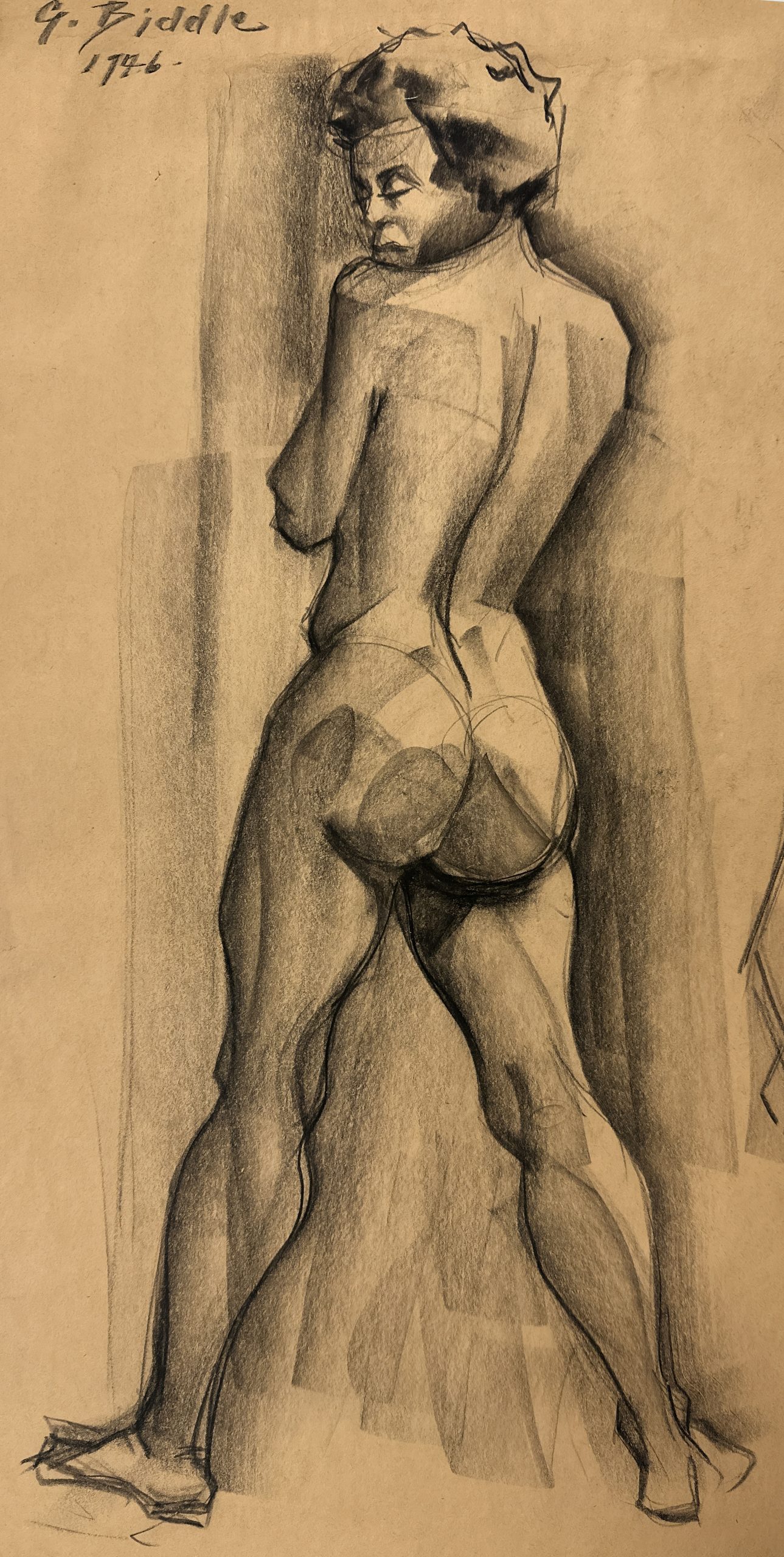 An academic drawing of a female nude, executed in charcoal on brown paper. The work is a superb demonstration not only of Sterne’s extraordinary facility and skill but also of the academic’s approach to drawing—and an enchanting picture beyond all that.
