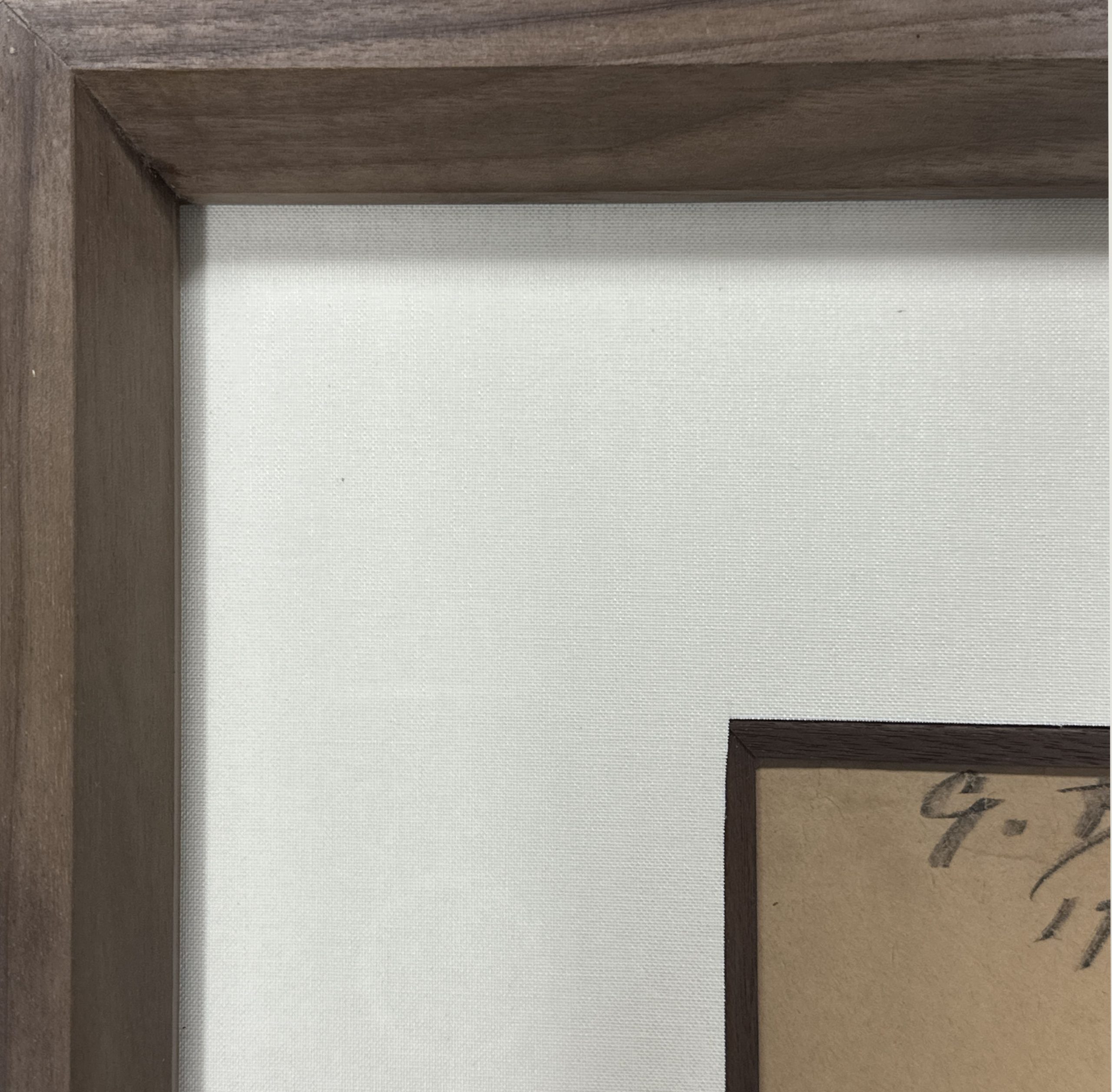 Custom framed in a solid Walnut frame with a silk-covered mat and walnut fillet behind 99% UV-blocking Plexiglas.