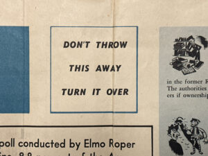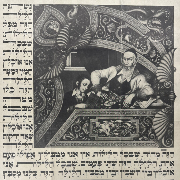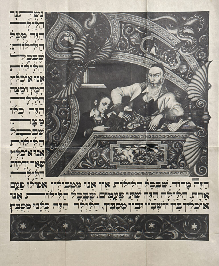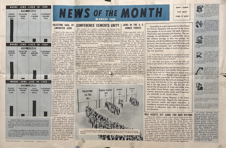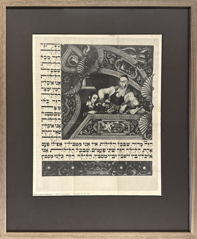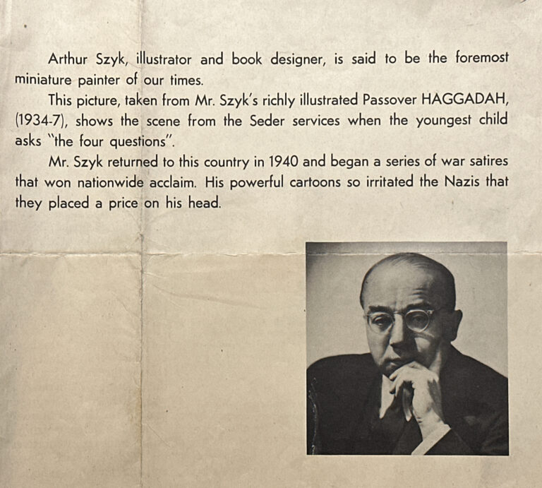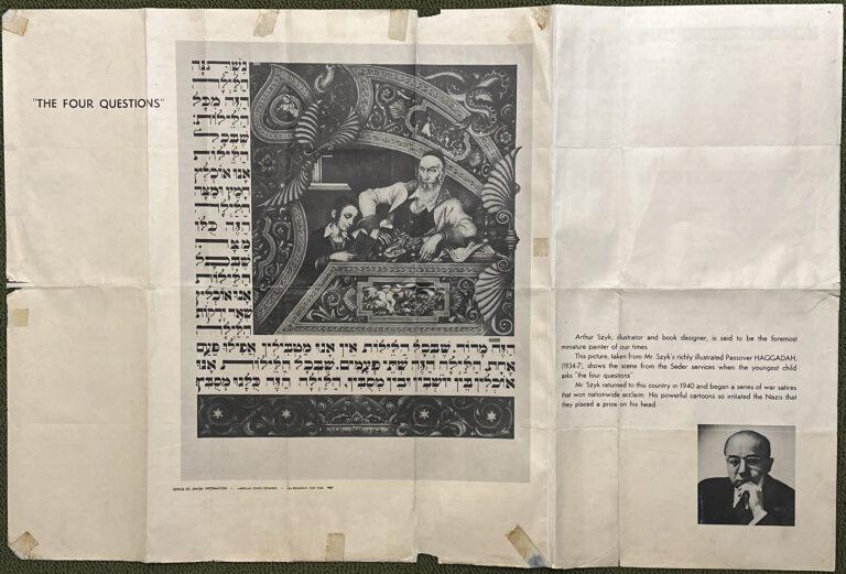 Less than a year later, in May 1946 in advance of the first Passover following the end of the war, the American Jewish Congress reproduced the Four Questions from the Szyk Haggadah on the back of their News of the Month newsletter. It was meant to be a keepsake, prominently marked on the front, “DON’T THROW THIS AWAY TURN IT OVER”.