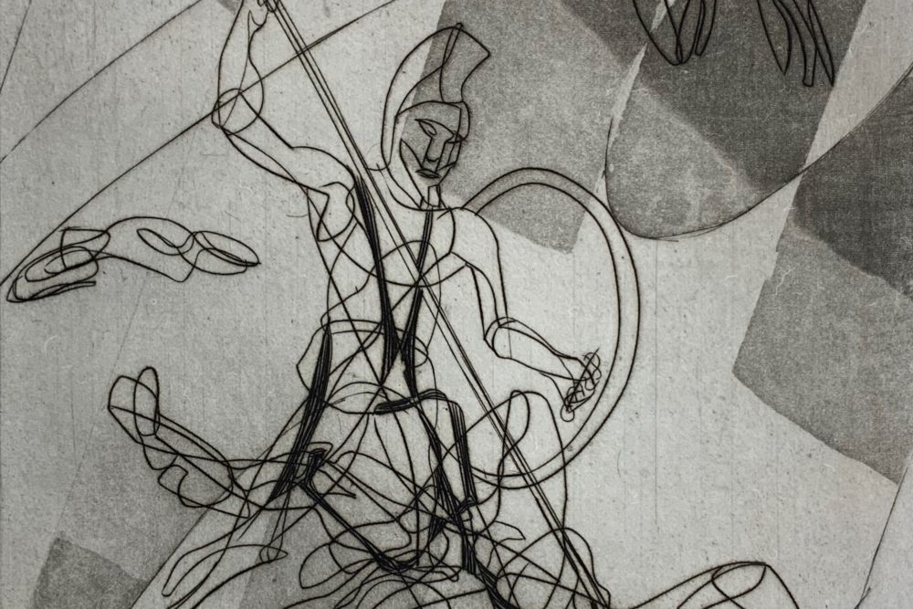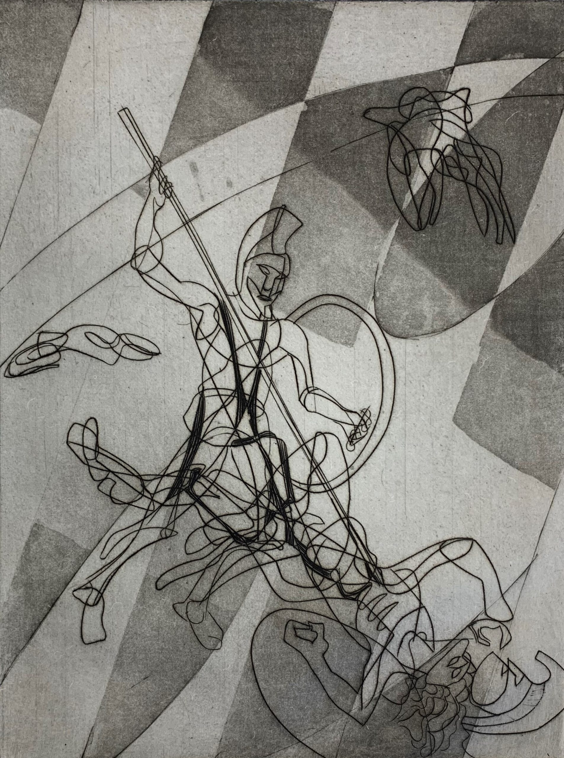 Stanley William Hayter illustrated the book-length poem Death of Hektor by Irish poet Brian Coffey. This poem is a dramatic reinterpretation of Homer’s epic tale from The Iliad. Rather than embrace the traditional view of Achilles as the embodiment of honor, glory, and fame, Coffey and Hayter portray the Greek hero-warrior as a violent and vengeful soldier—his mindless and brutal actions during and after the murder of the Trojan prince Hektor belying his tragic hero status. In this, they challenge the glorification of the culture of war—violence, destruction, and death—elevating the importance of a morally-conscious Hektor, while stressing Homer’s deep insight into the human condition.