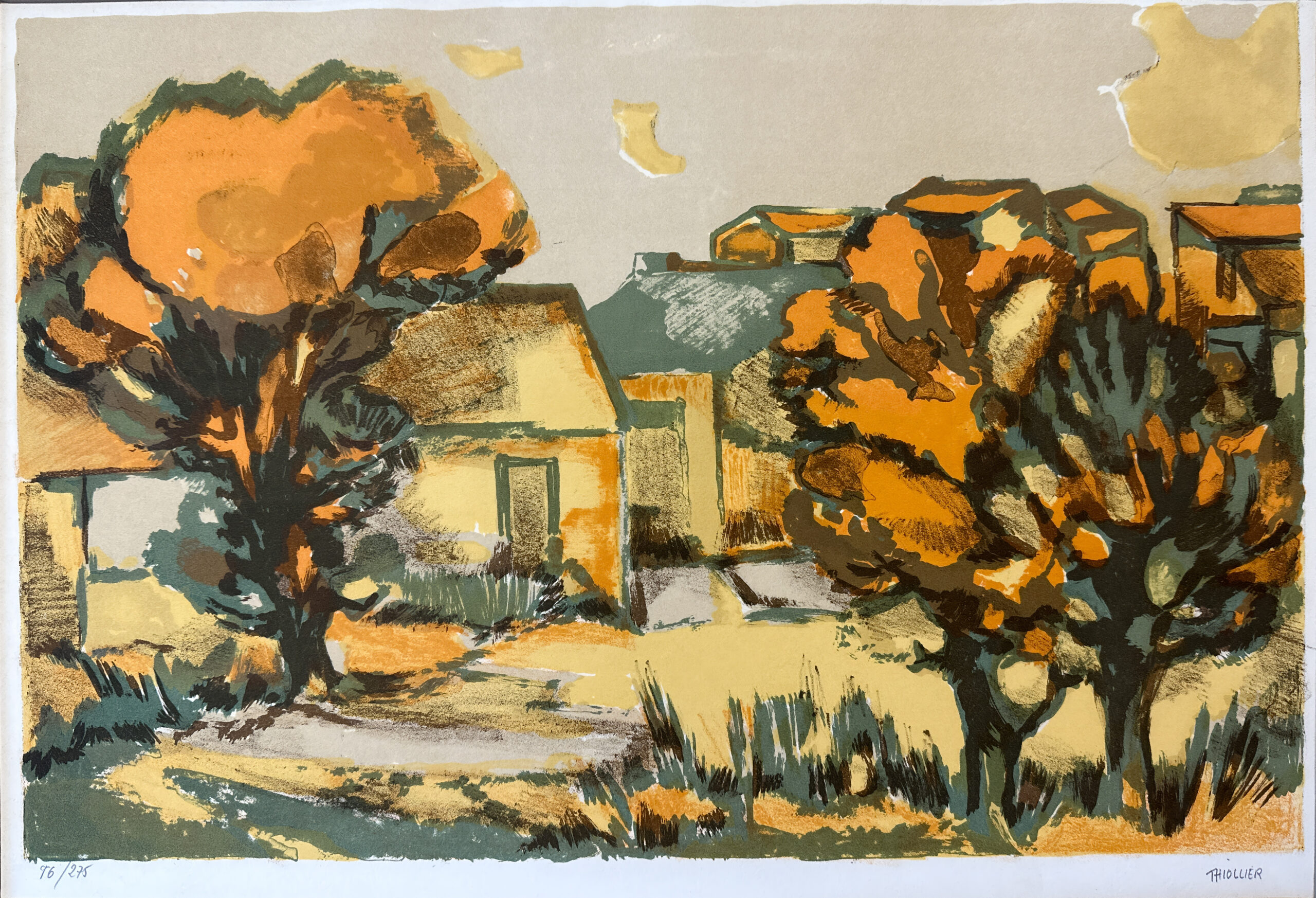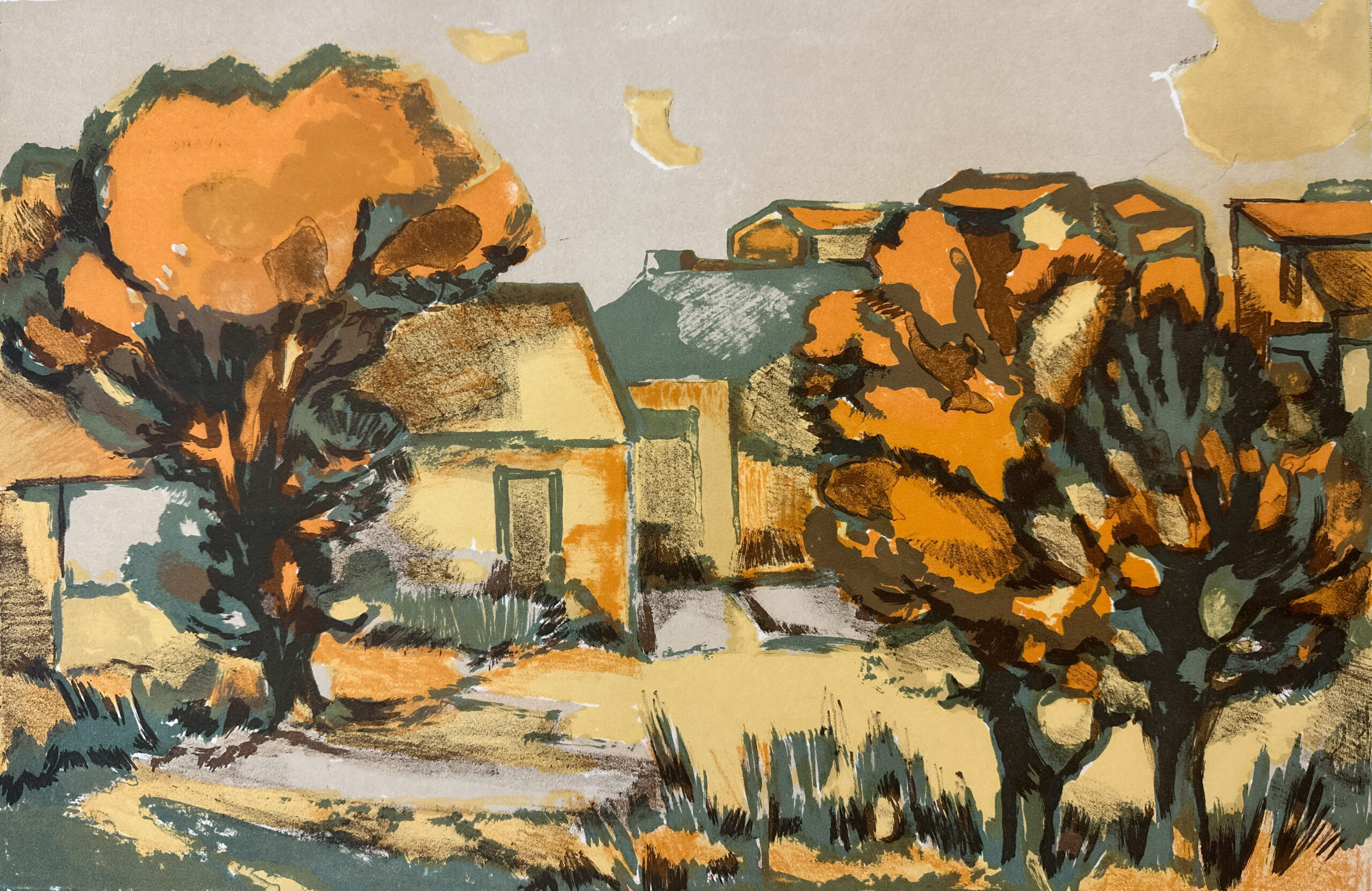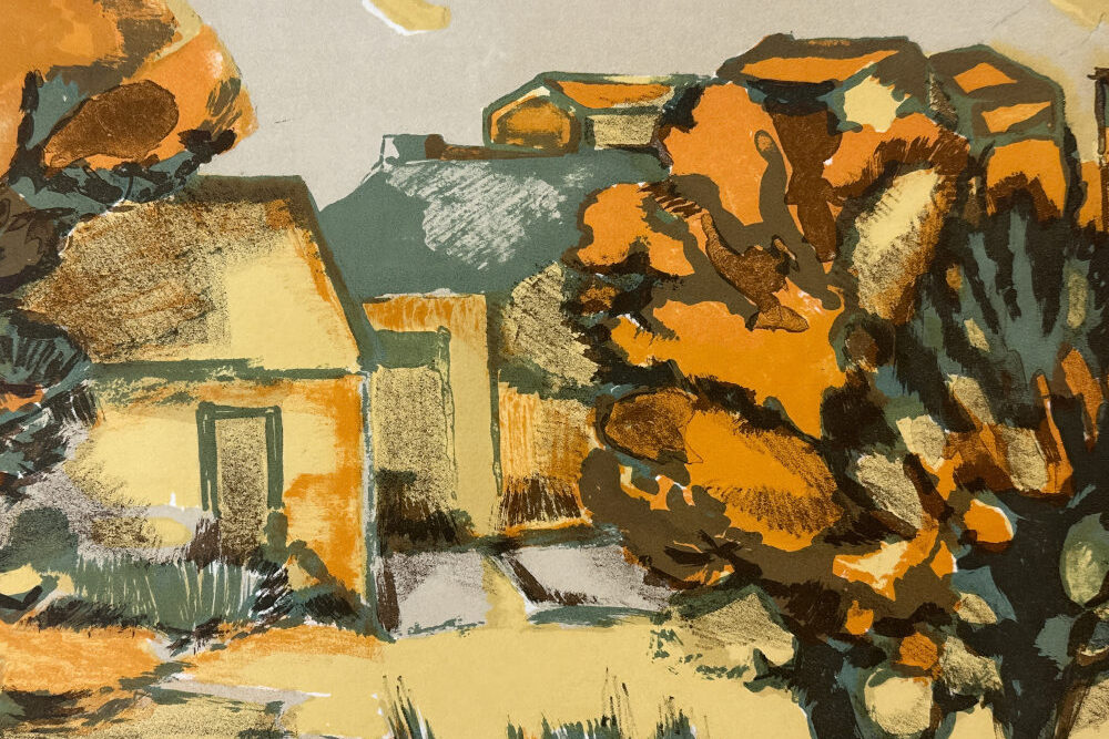 A superb example of Éliane Thiollier’s work, featuring the reds and ochres that characterize Thiollier’s palette in the work she produced after leaving Paris for the French countryside. A lovely scene of homes in a small village.