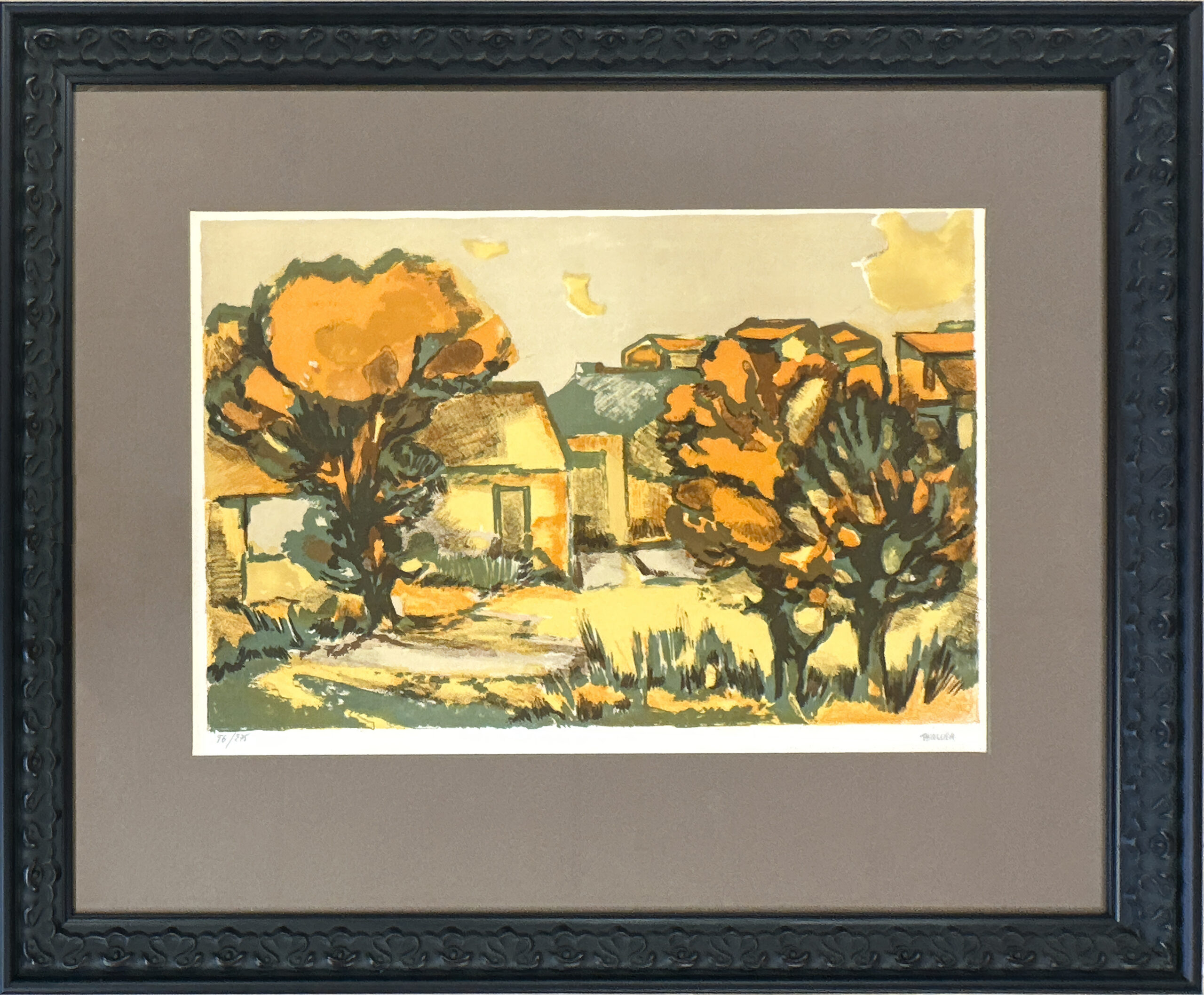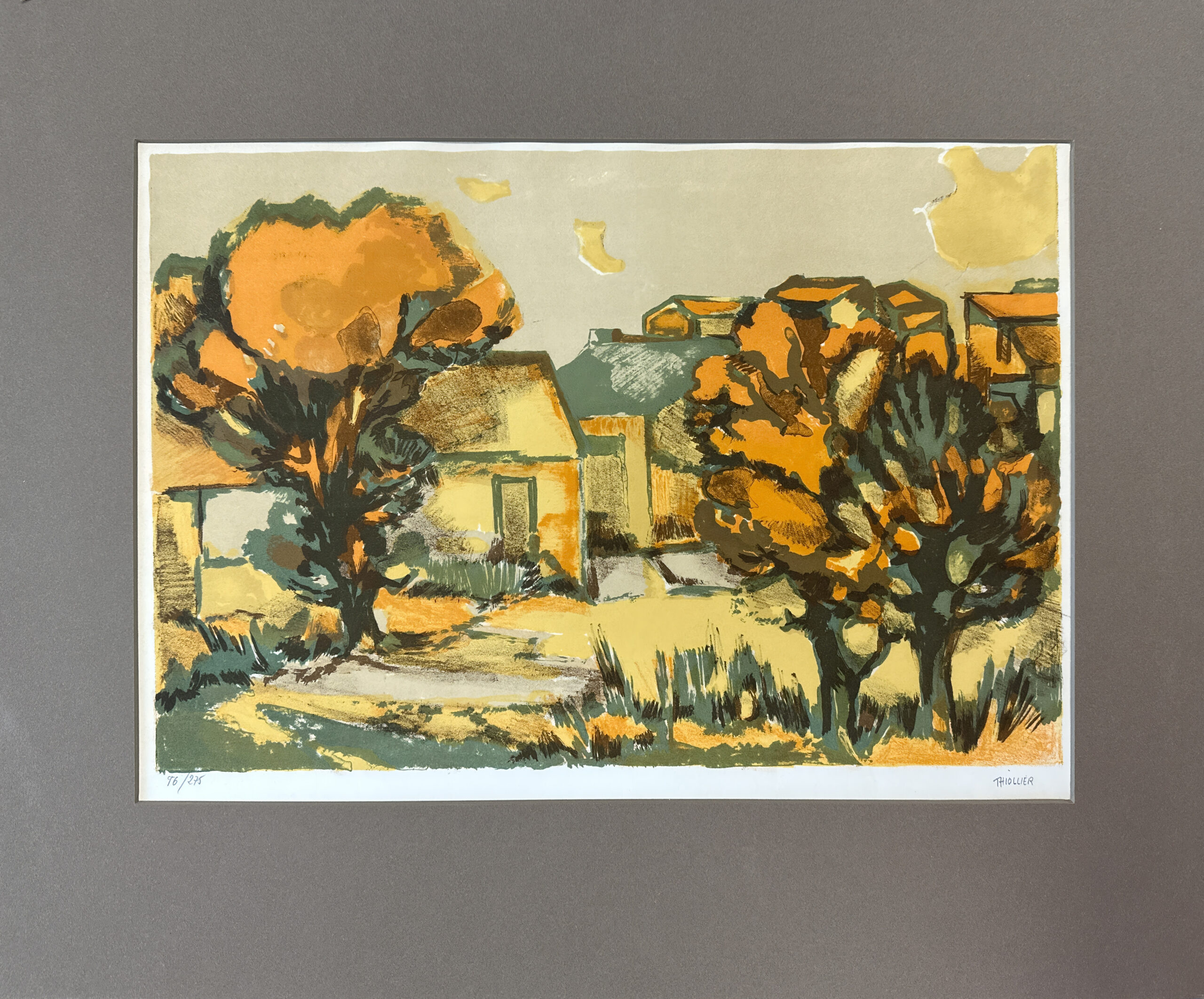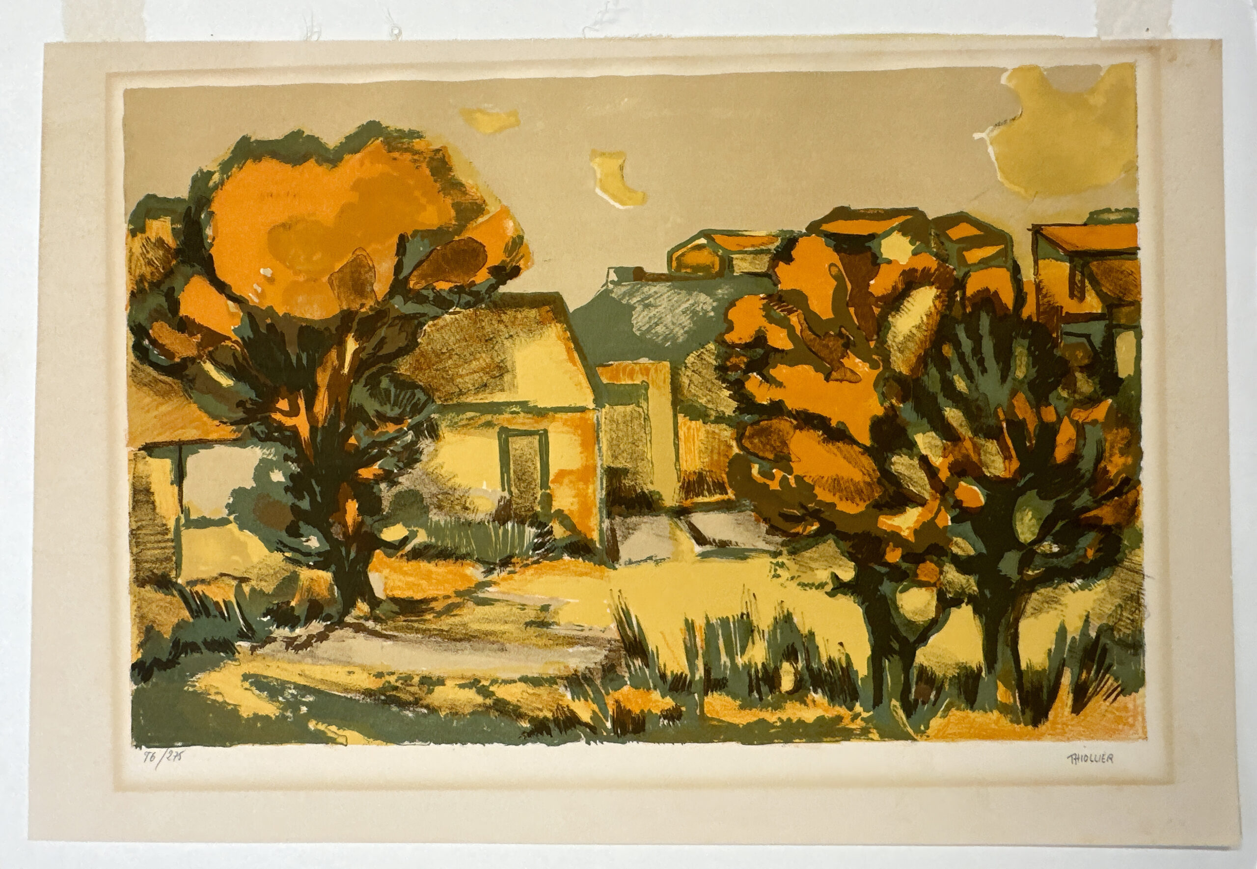 A superb example of Éliane Thiollier’s work, featuring the reds and ochres that characterize Thiollier’s palette in the work she produced after leaving Paris for the French countryside. A lovely scene of homes in a small village.