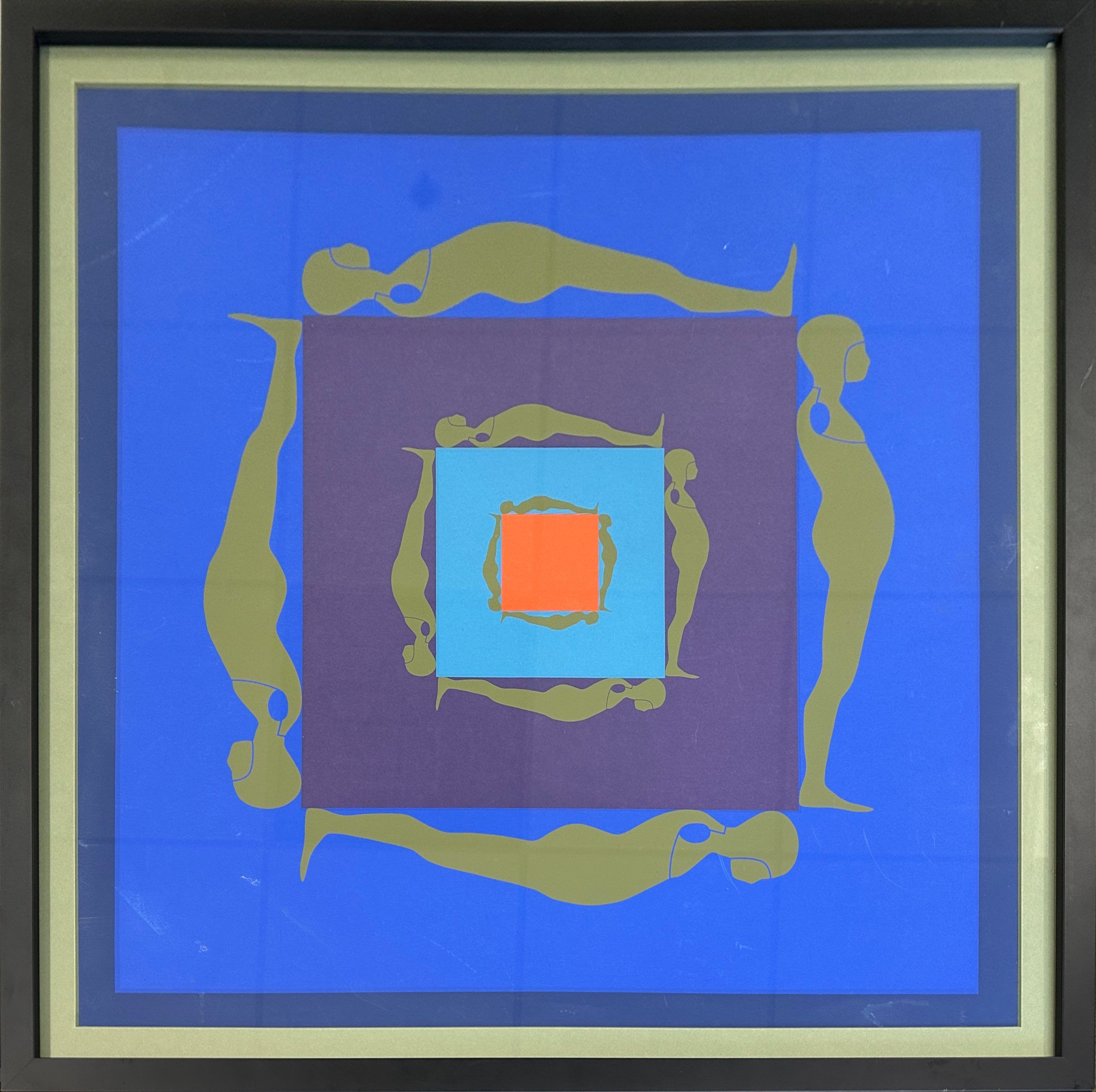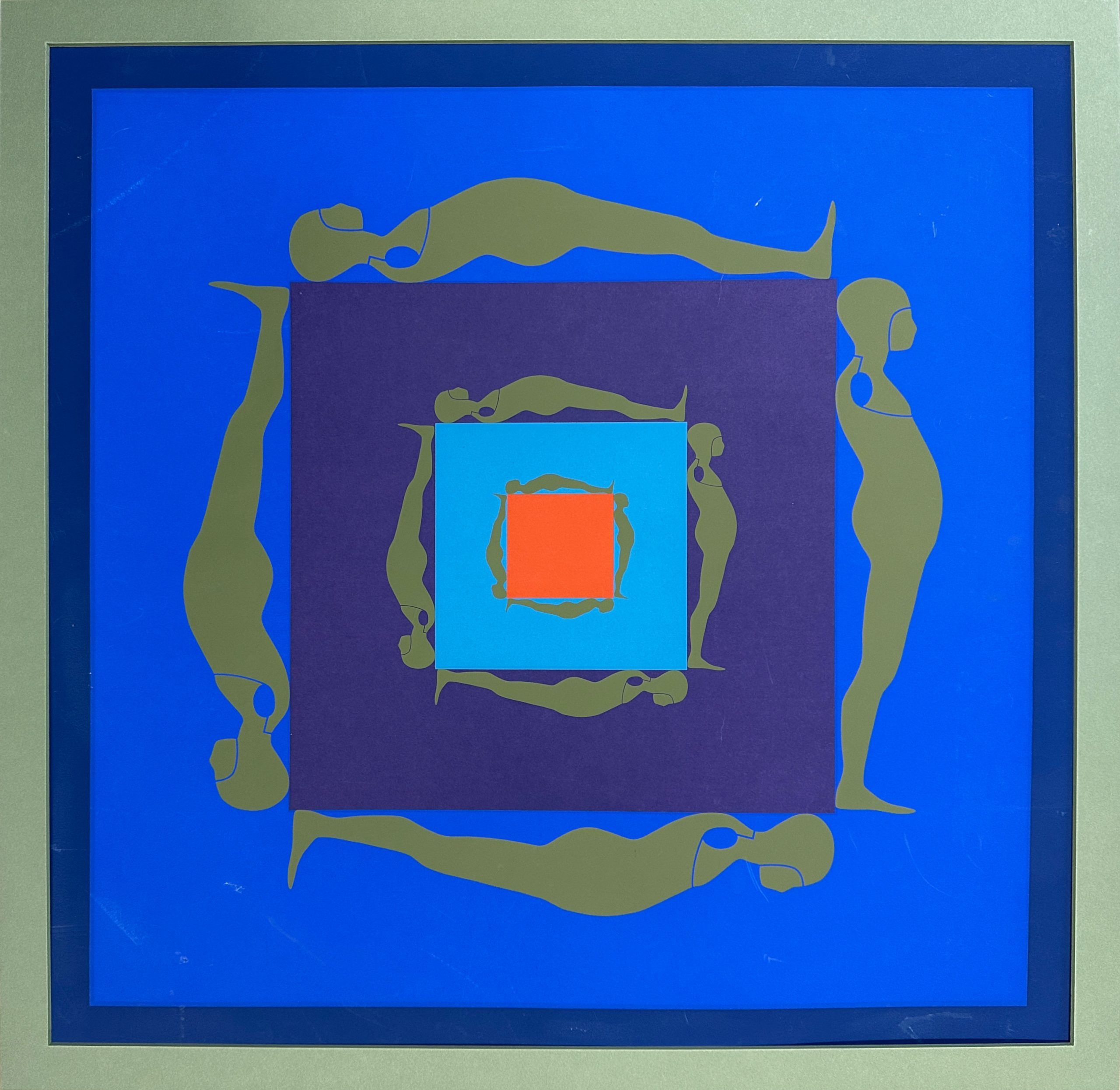 An opportunity to acquire an archetypal Ernest Trova “Falling Man” at a very accessible price. Time and handling have impacted the work but it remains a striking and powerful work even still. Handsomely framed behind 99% UV-blocking art glass.