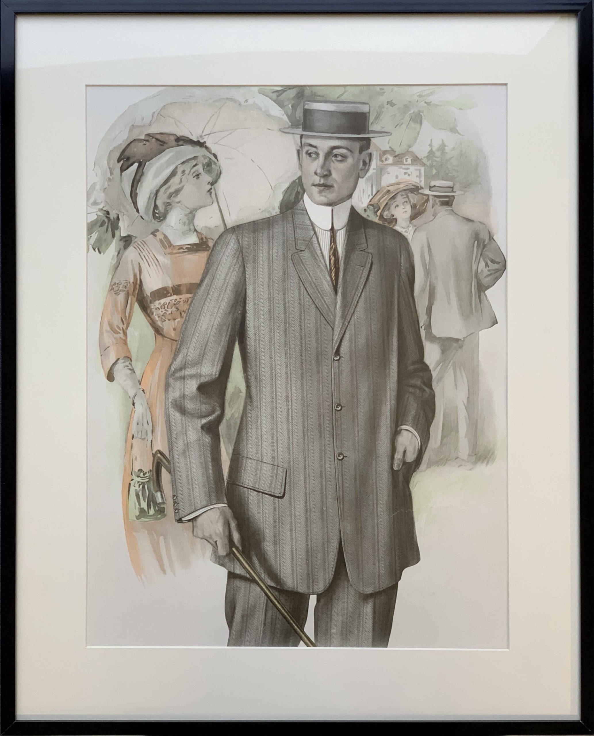 This fine lithograph was included in a beautifully-made portfolio published by the American Art Custom Tailors company. Showing fashions for men from the start of the Twentieth Century, the pictures are romantic depictions of another time. Looked at differently, the pictures have an element of camp. The men in this and the other pictures in the portfolio largely ignore the women in the background; they have eyes only for each other.