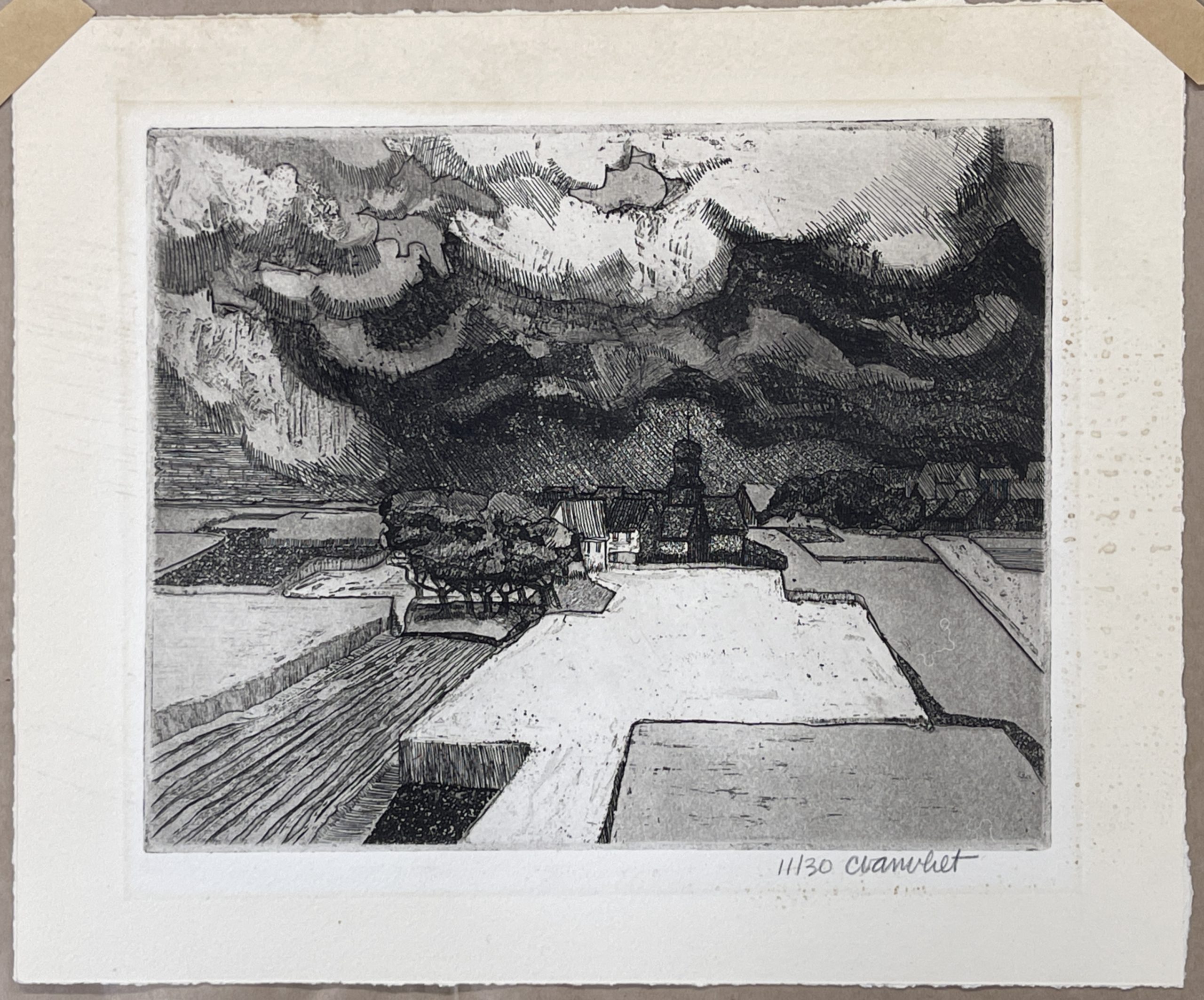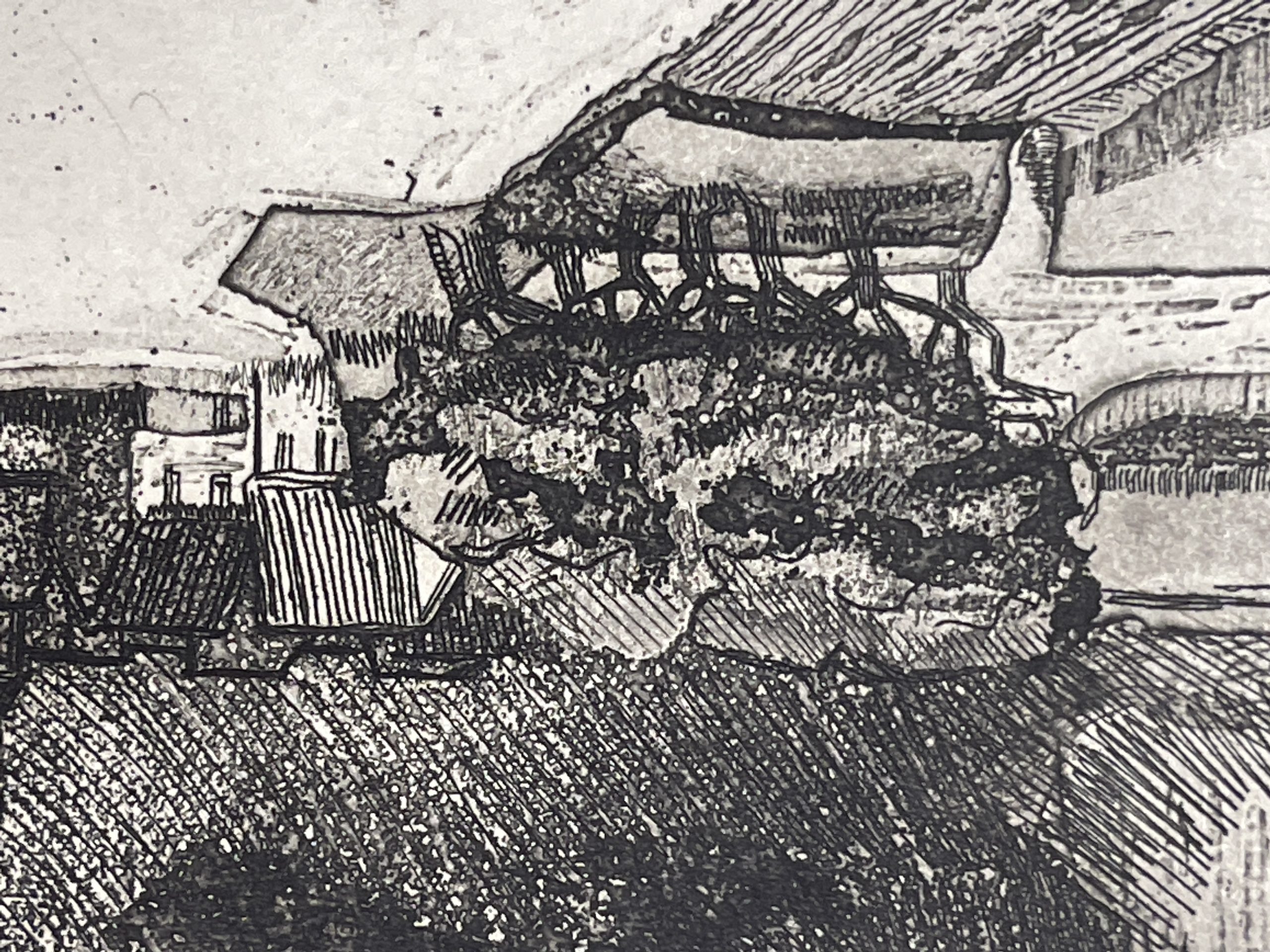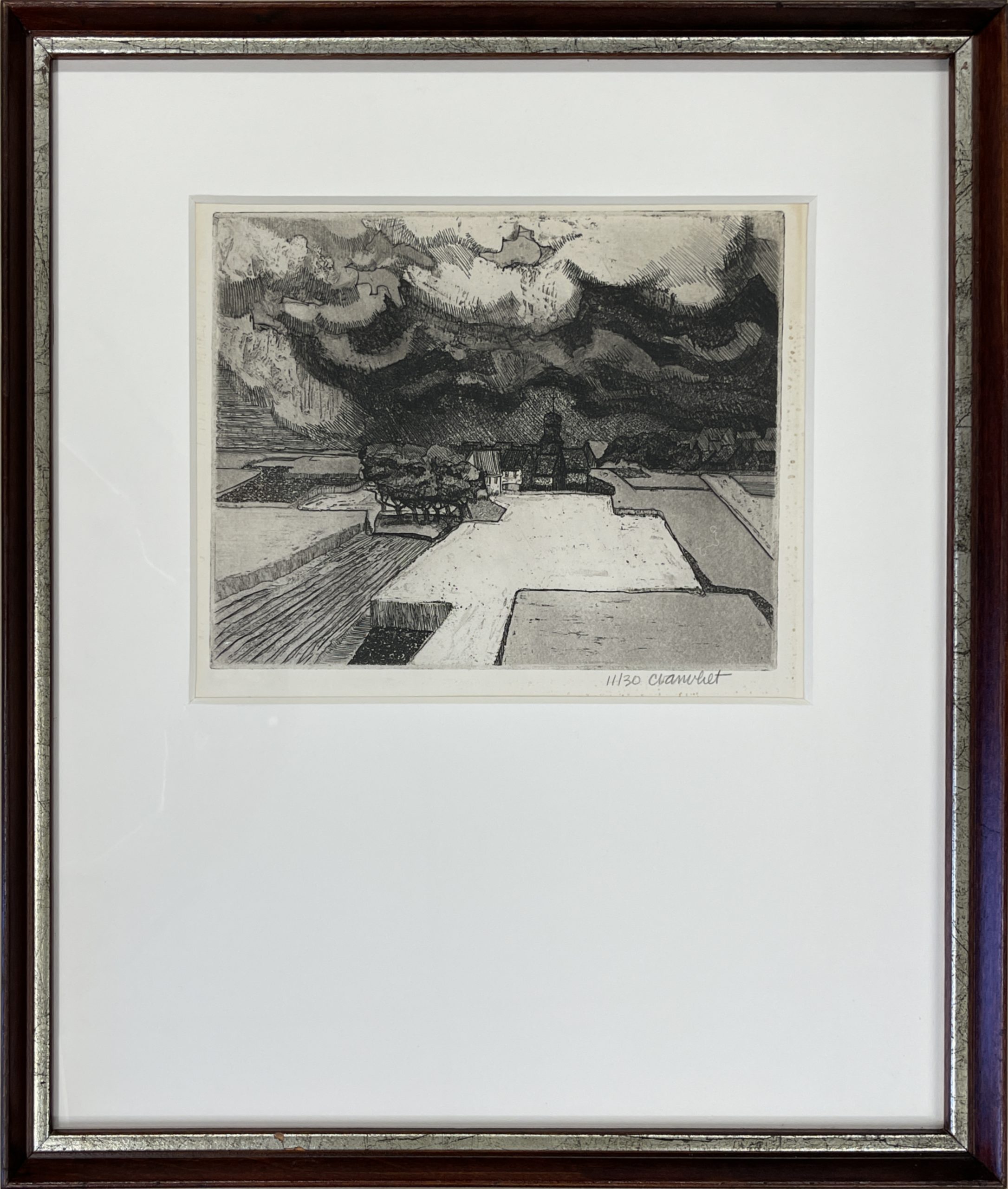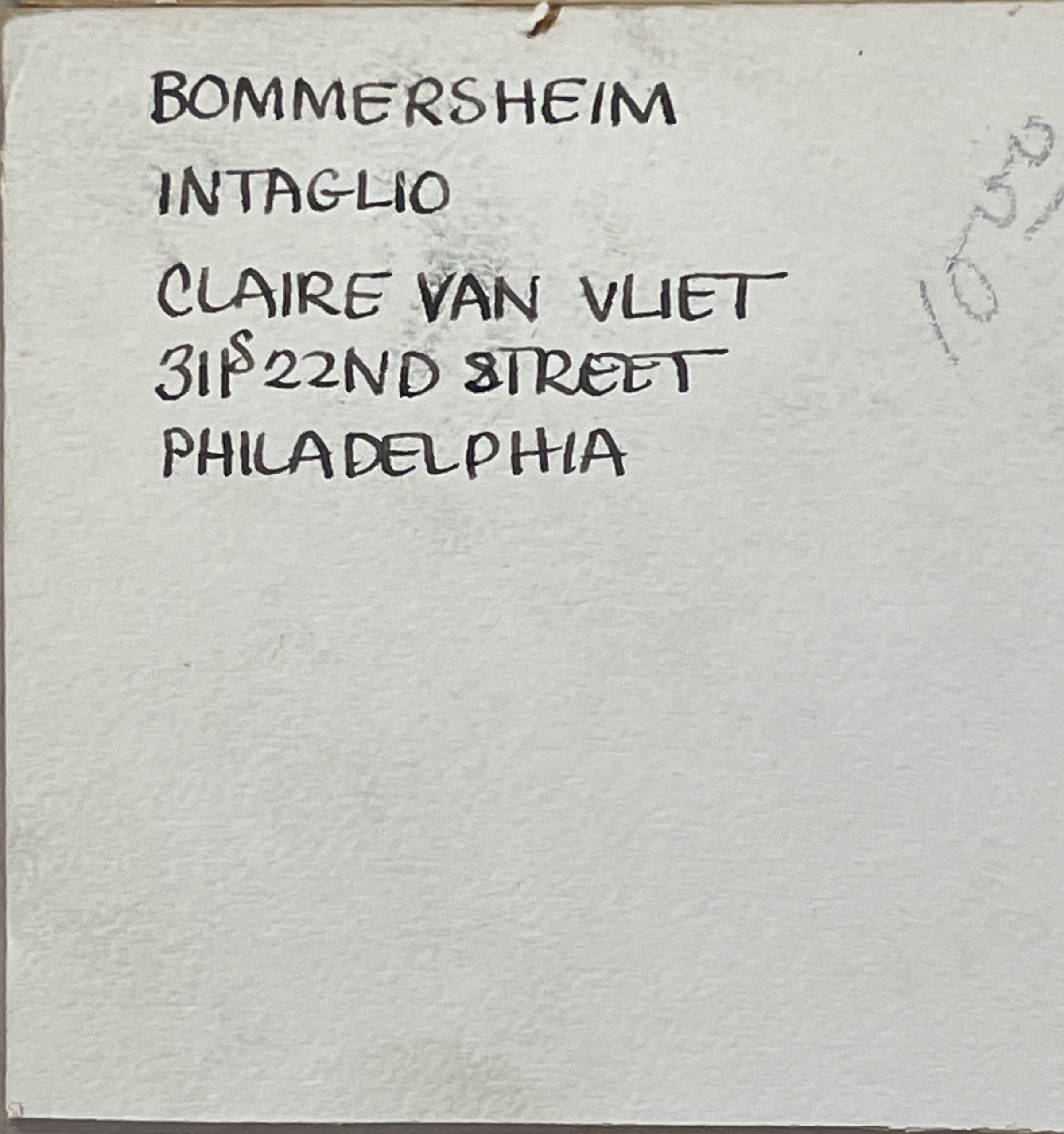 An intanglio print of the sleepy town of Bommerschein, custom framed in a vintage silvered wood frame, covered with an 8-ply mat, and behind 99% UV-blocking art glass, using strictly conservation-grade materials. This rare early work bears the former frame label showing her Philadelphia address when she apprenticed with John H. Anderson at Pickering Press.