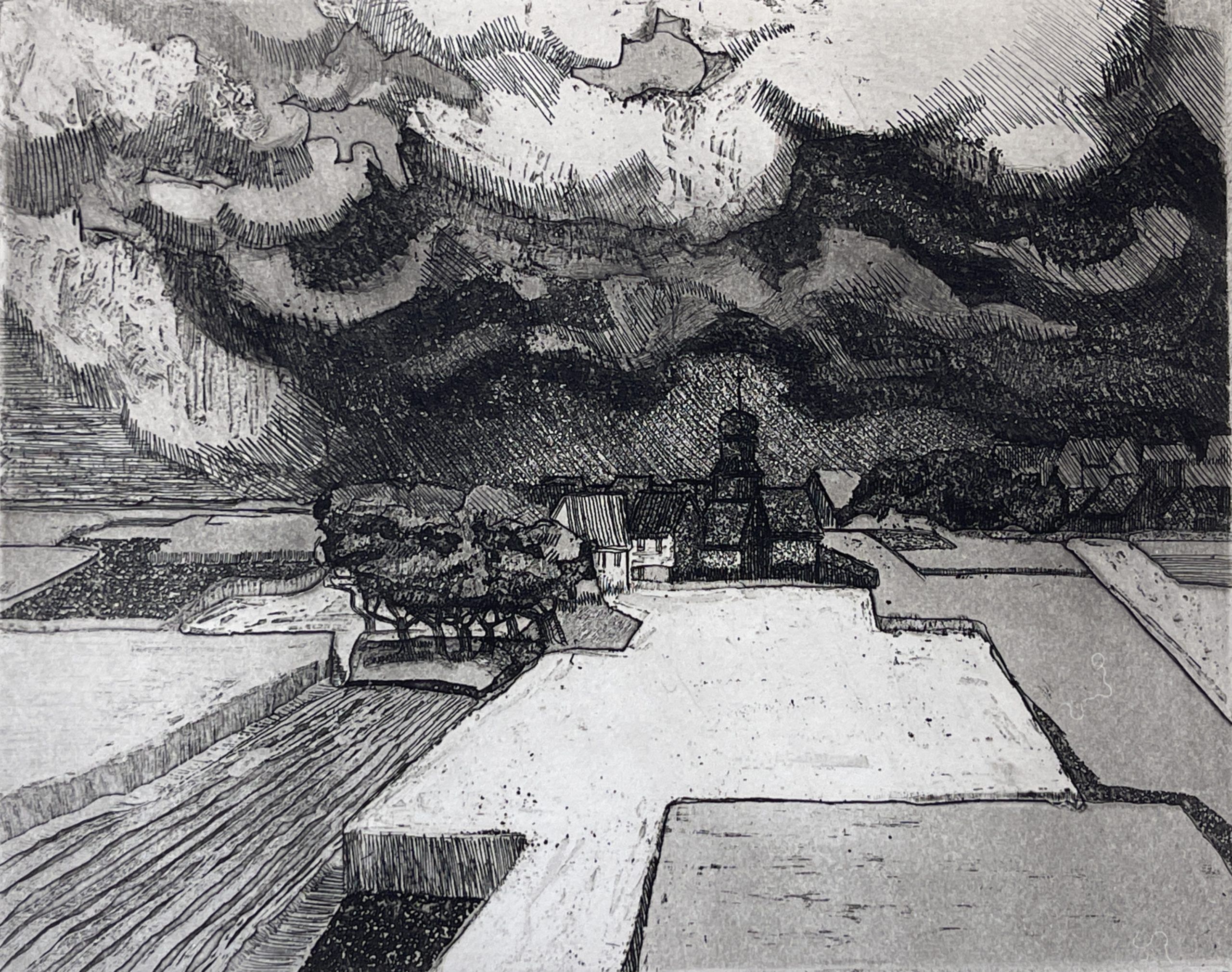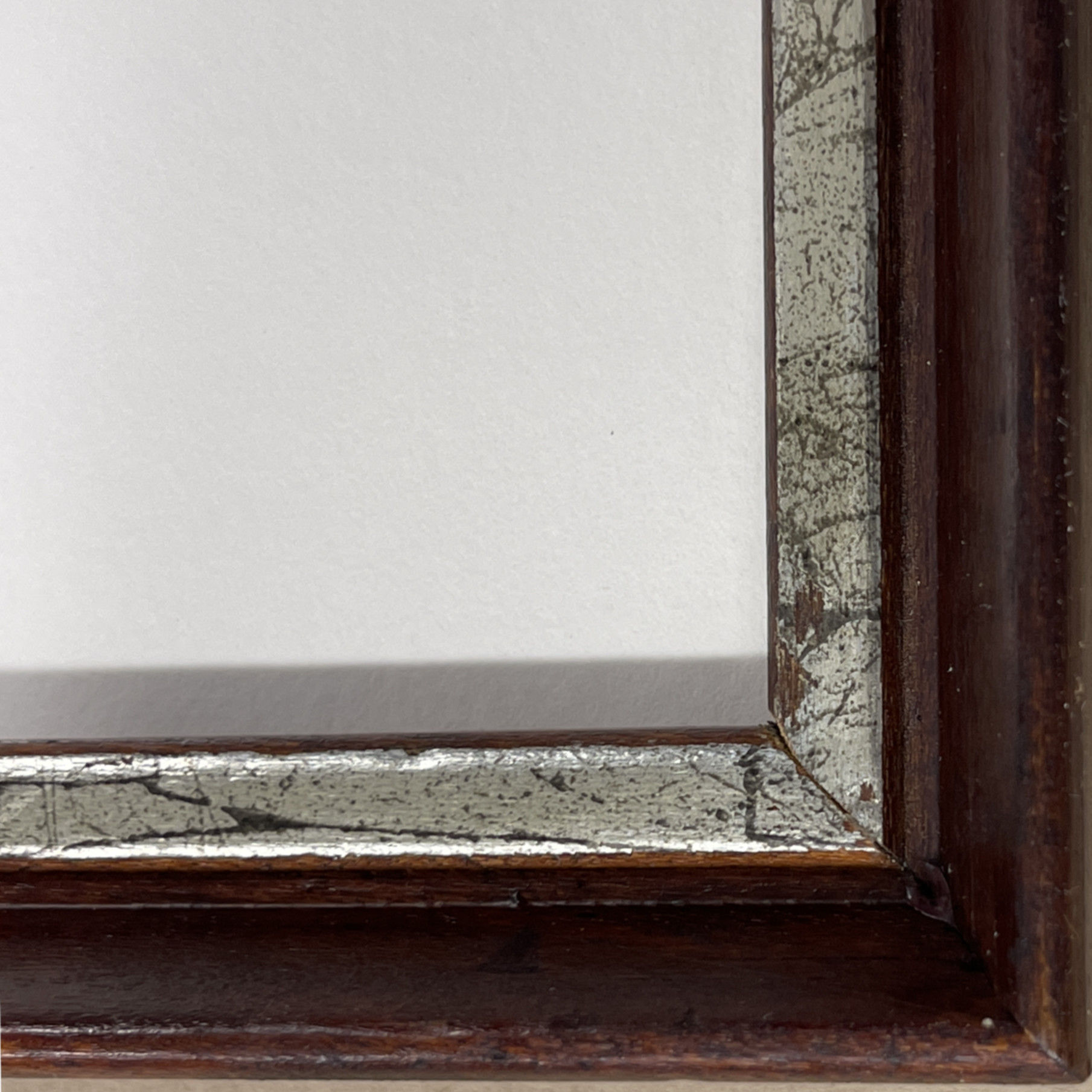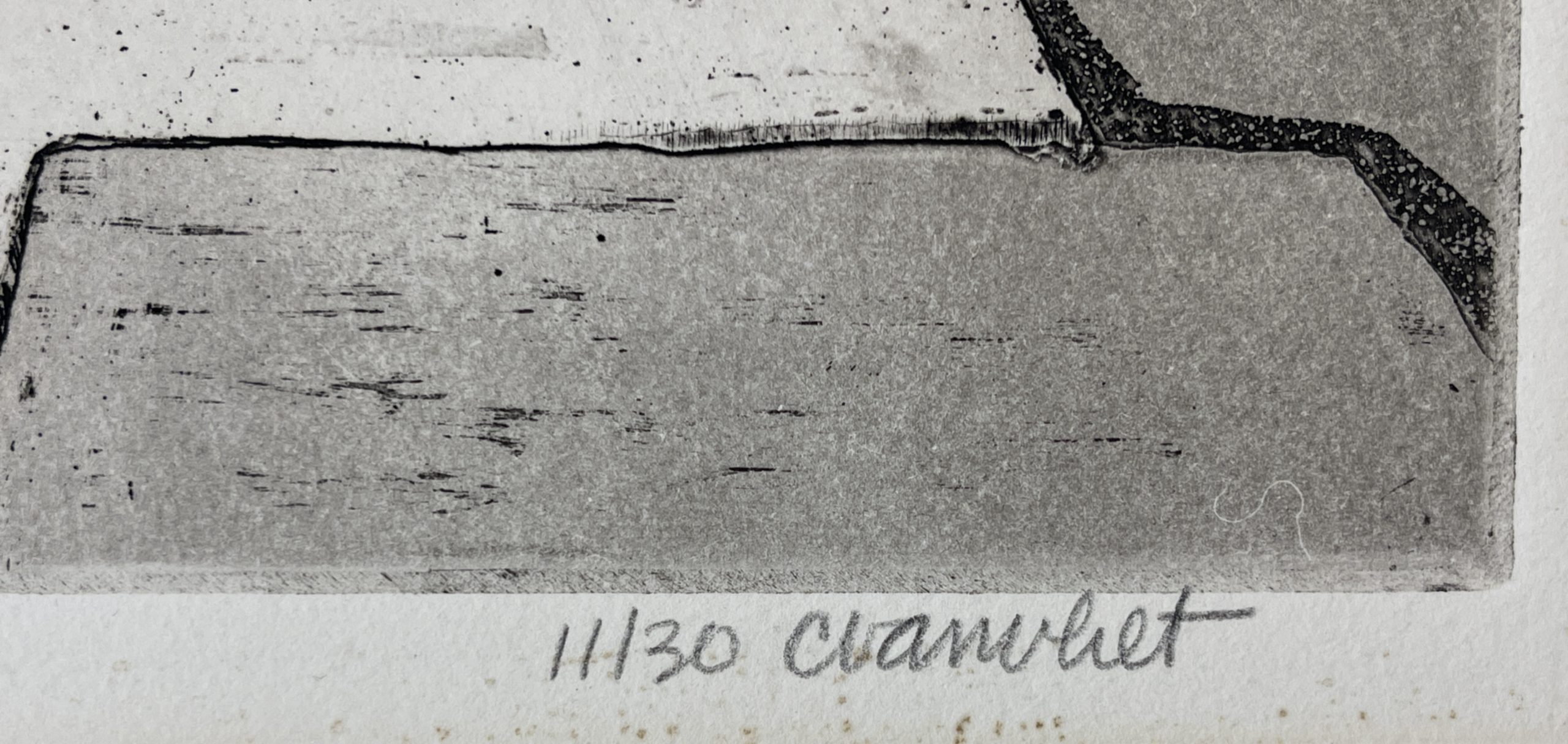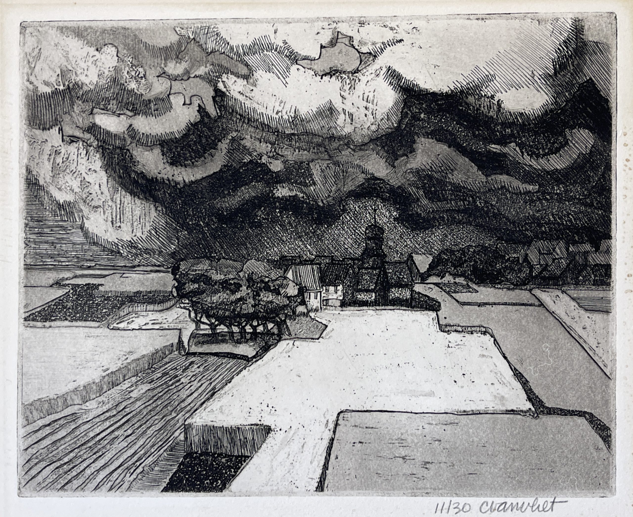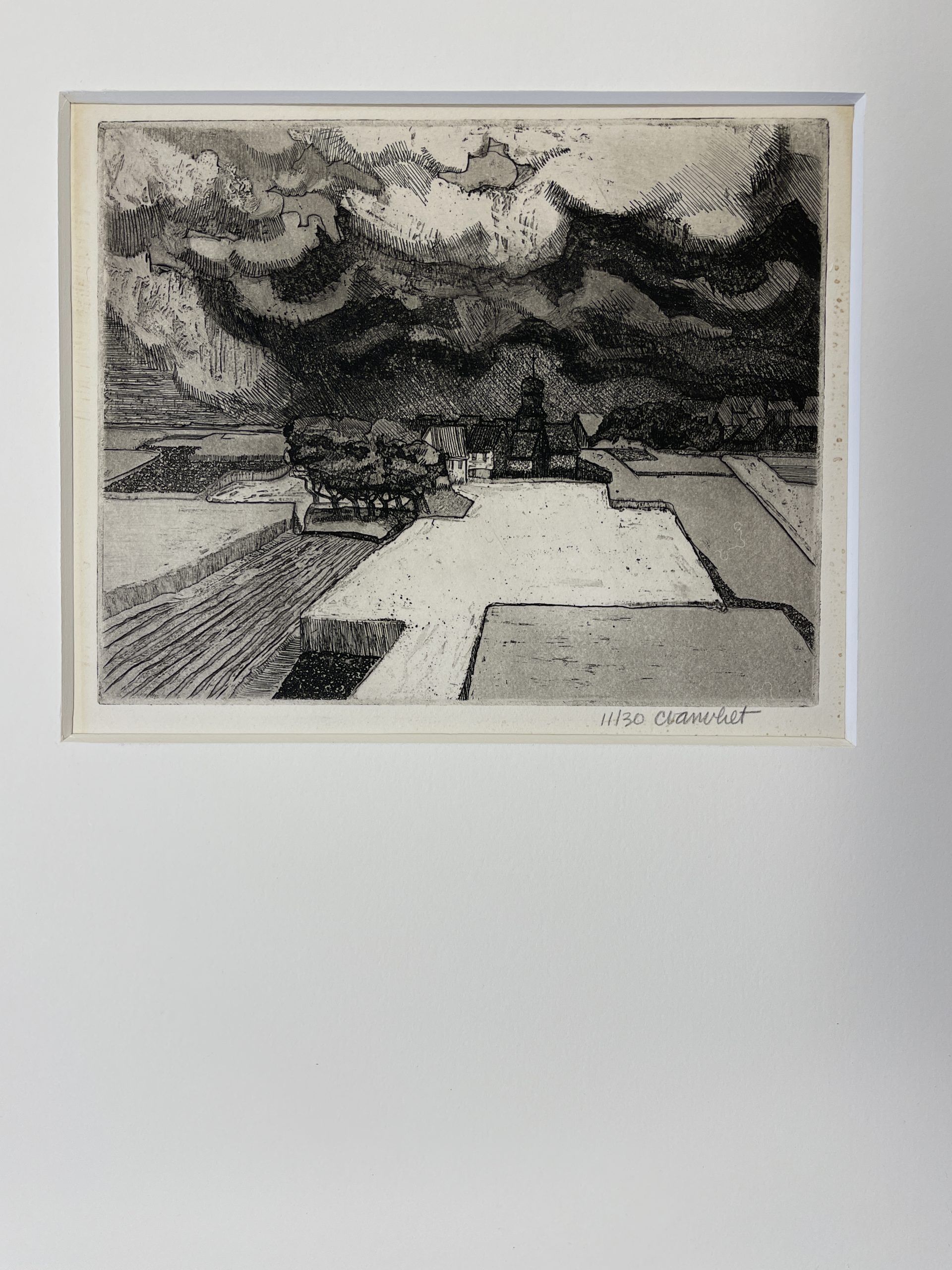 An intanglio print of the sleepy town of Bommerschein, custom framed in a vintage silvered wood frame, covered with an 8-ply mat, and behind 99% UV-blocking art glass, using strictly conservation-grade materials. This rare early work bears the former frame label showing her Philadelphia address when she apprenticed with John H. Anderson at Pickering Press.