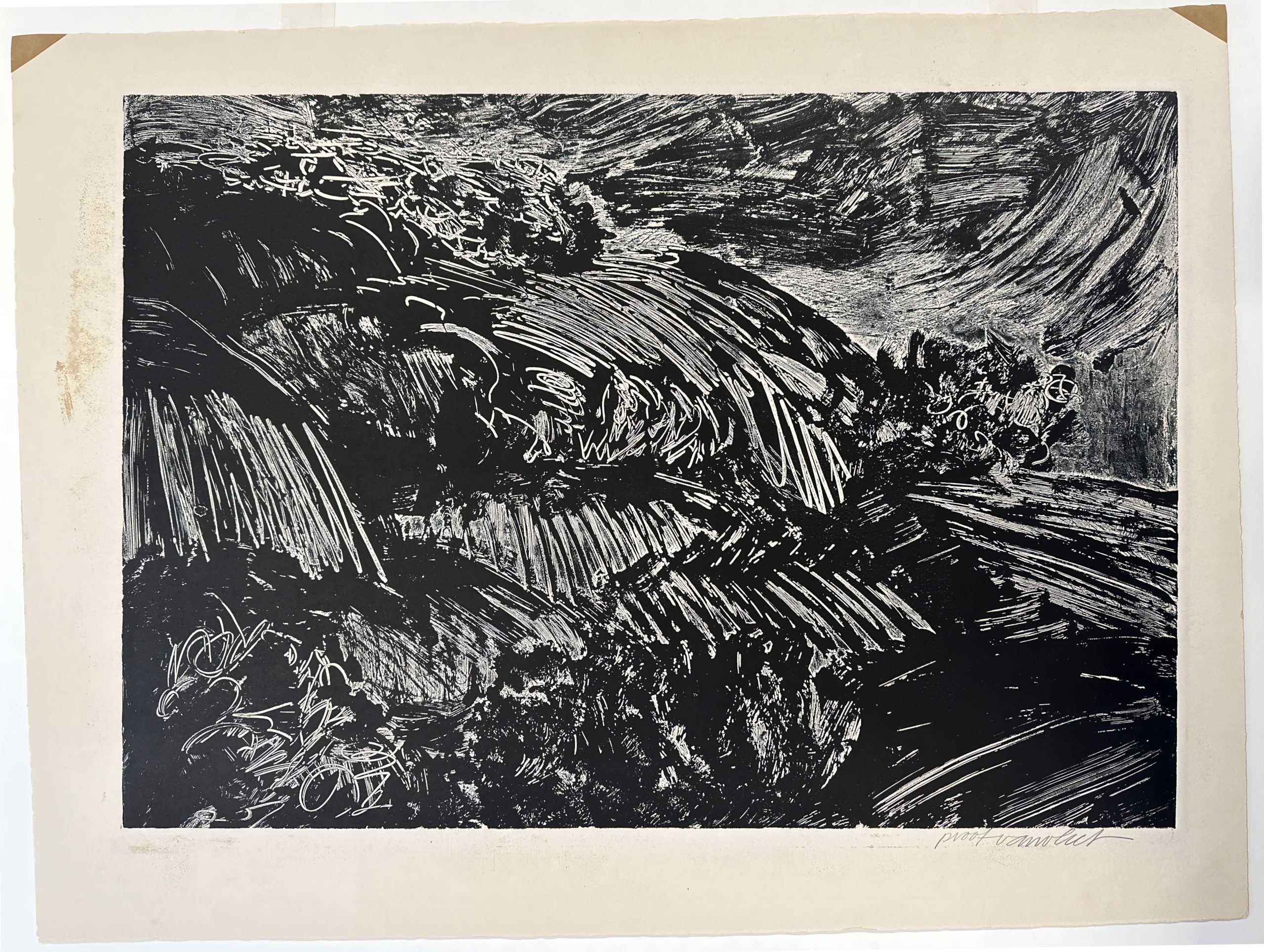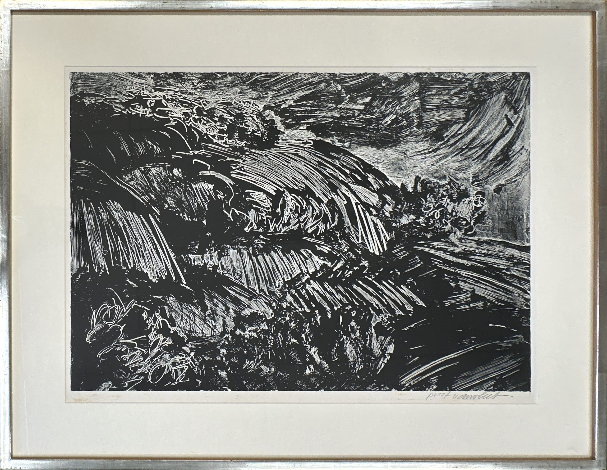 An abstracted picture of the gorgeous heather-covered hills of Hørbylunde, a place often thought of as one of the most beautiful nature areas of Denmark. This is a proof; examples from the edition are held in the permanent collections of the National Gallery of Art (Accession No. 2008.115.4834) and of the Bates College museum. This copy, a proof, was exhibited at the Print Club of Philadelphia’s Annual International Competition. Custom reframed to museum standards in its original finished-corners wooden frame behind 99% UV-blocking art glass.