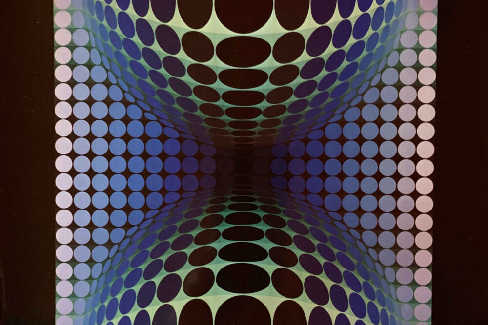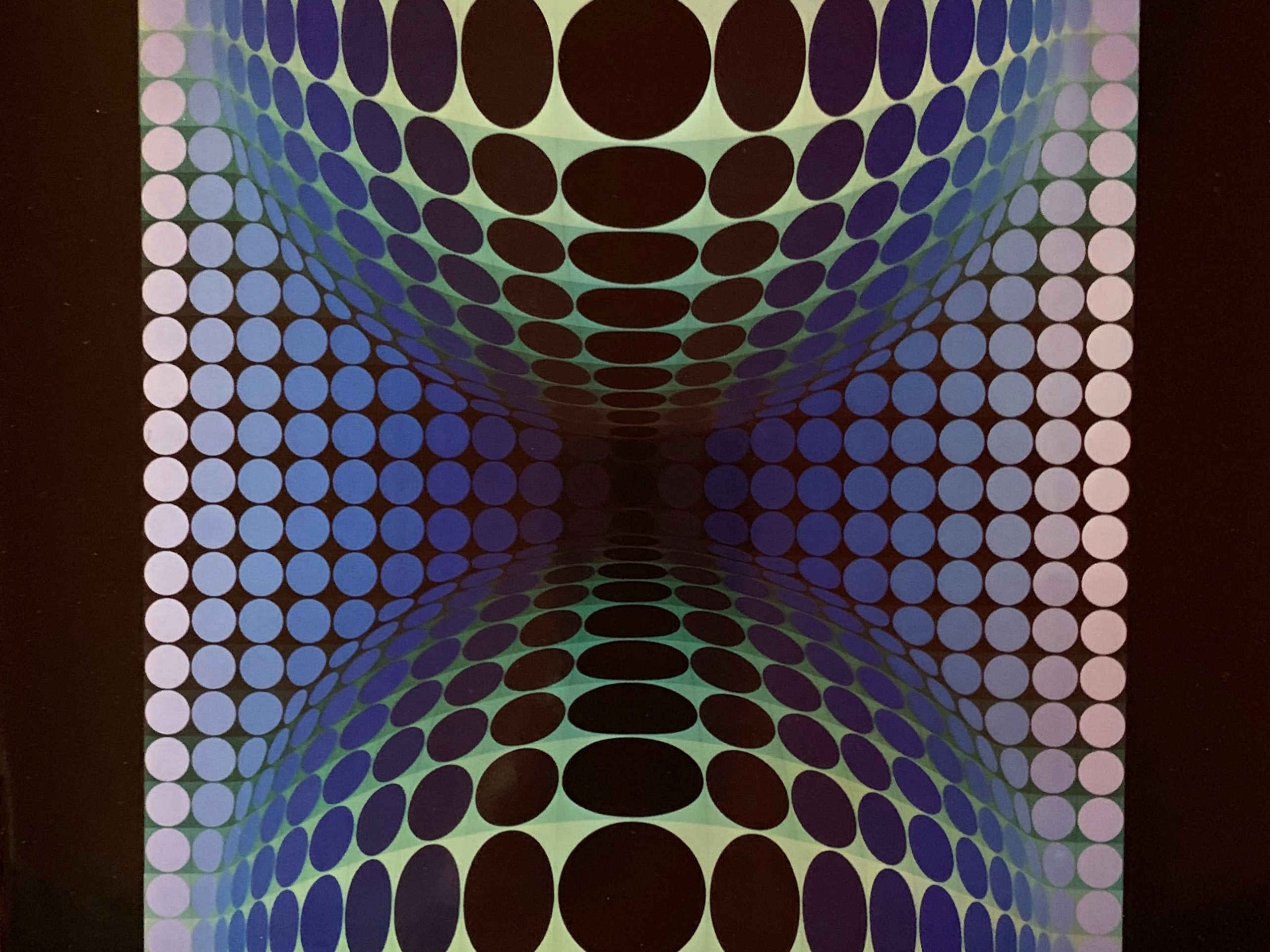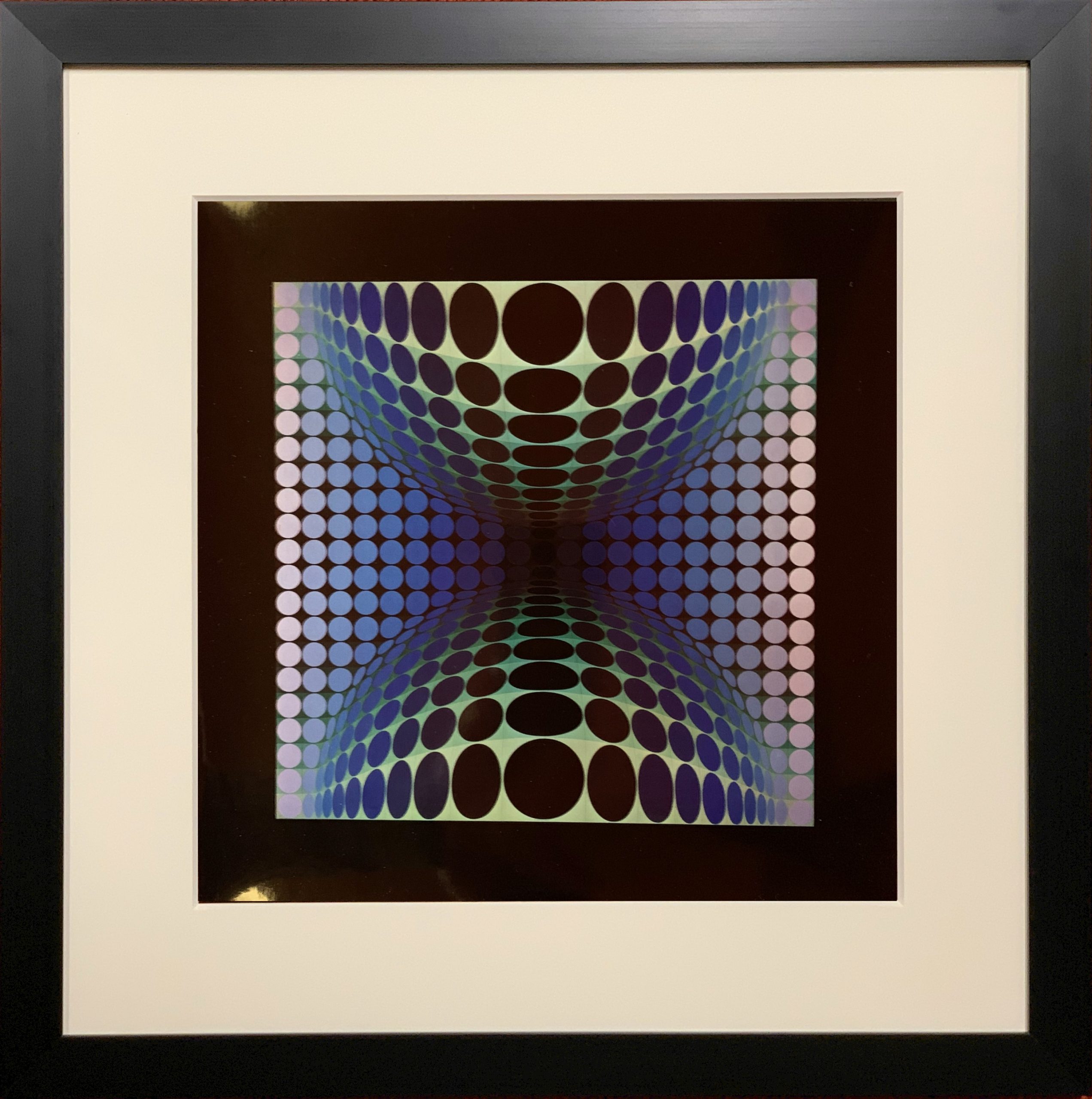 This small work by Victor Vasarely is a really terrific work of op-art! From the Homage a l’Hexagon portfolio. Great colors and striking in its black frame.