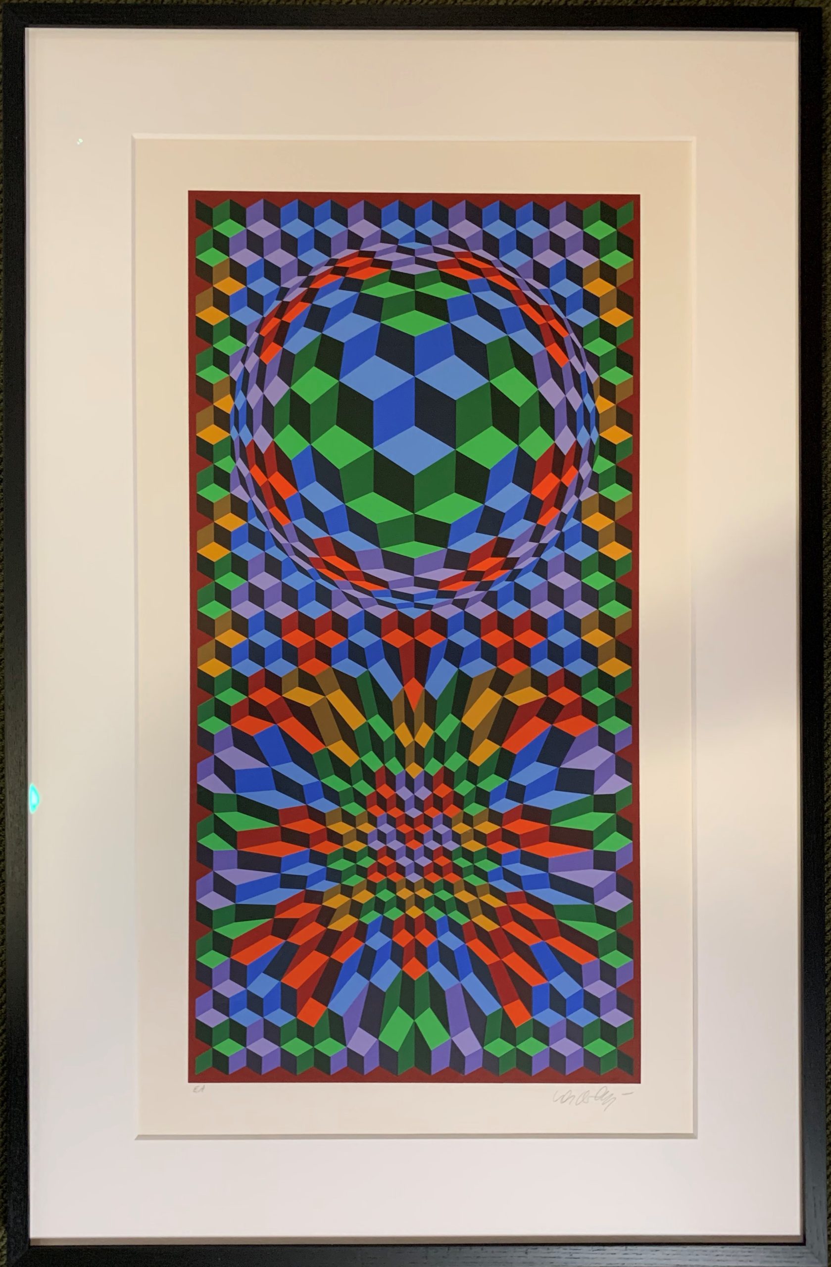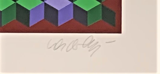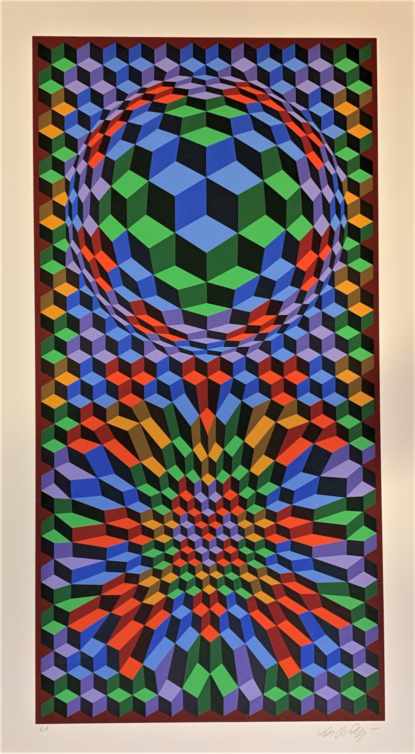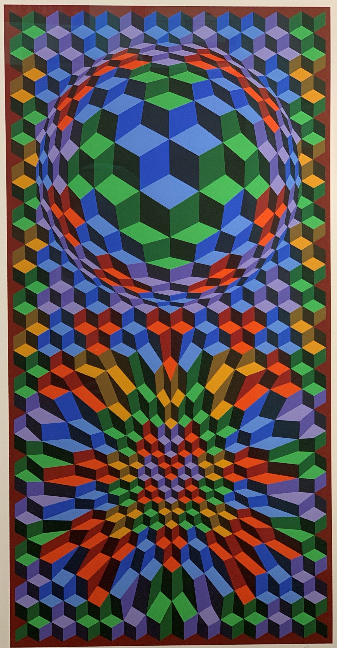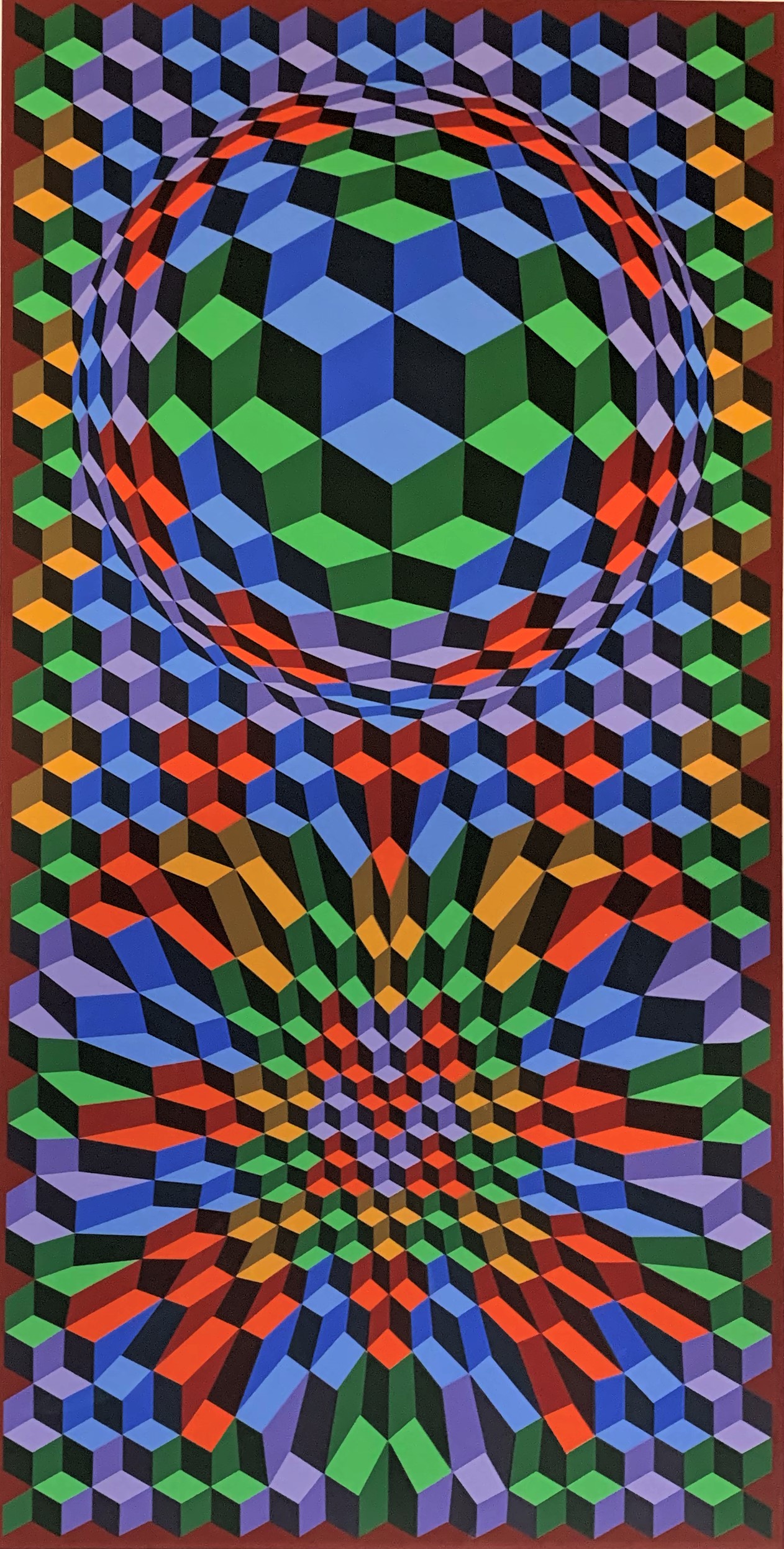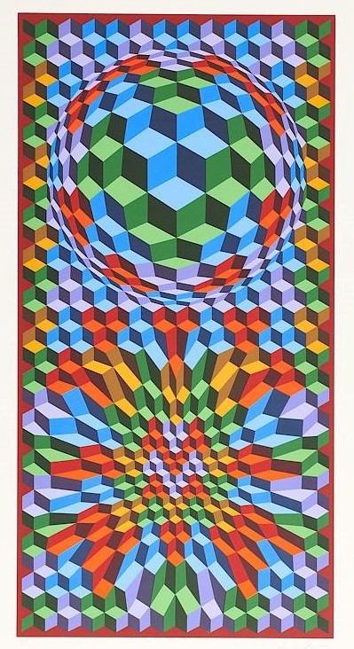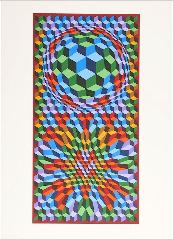 Vasarely was the father of “Op Art”—making images that we could easily create today with computers but that in the middle parts of the Twentieth Century required a magical combination of mathematical and creative genius to create. This work highlights Vasarely’s facility with color and with shapes and movement. It is an exemplar of op art, even the more so for its beautiful application of paints, which are right, smooth, and remarkably crisp.