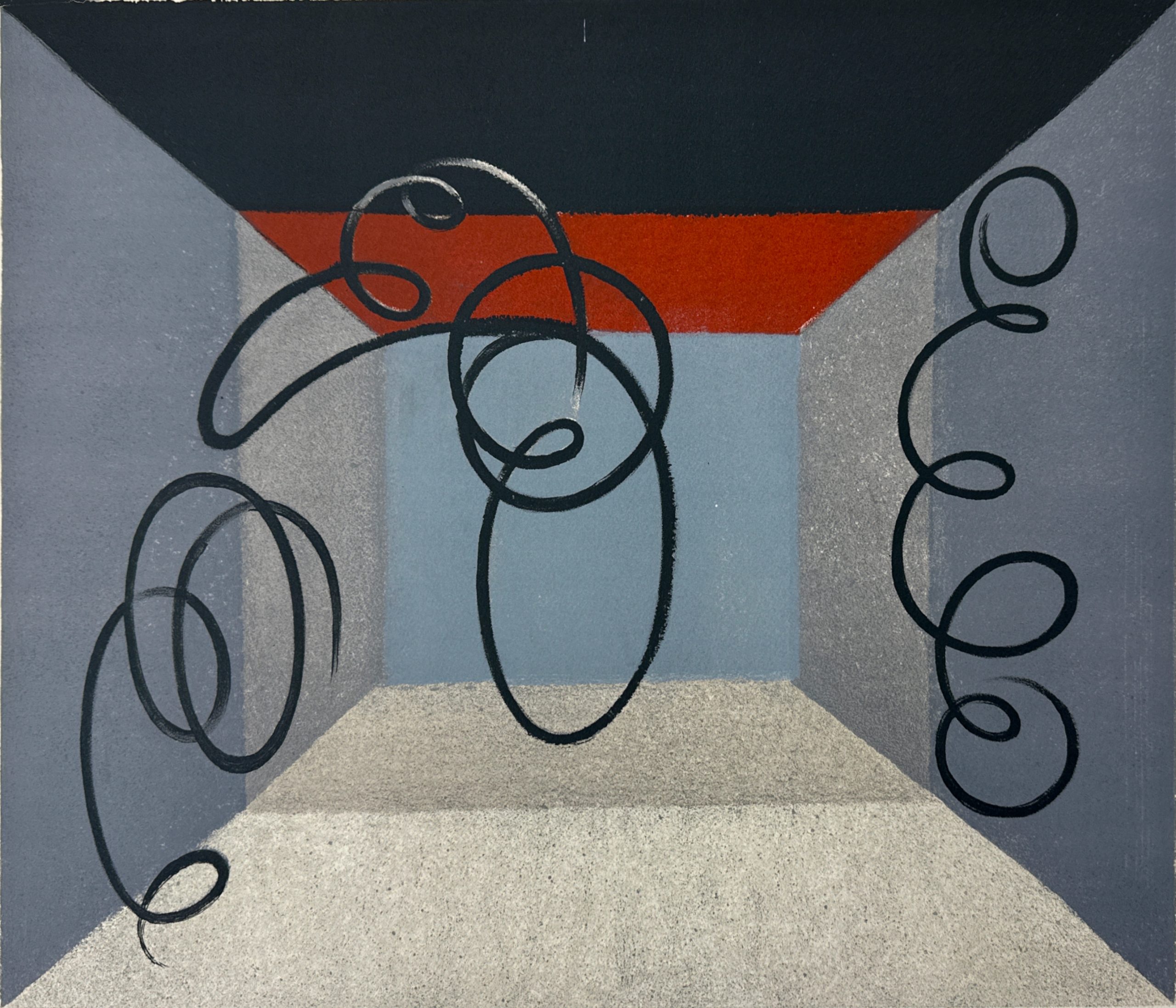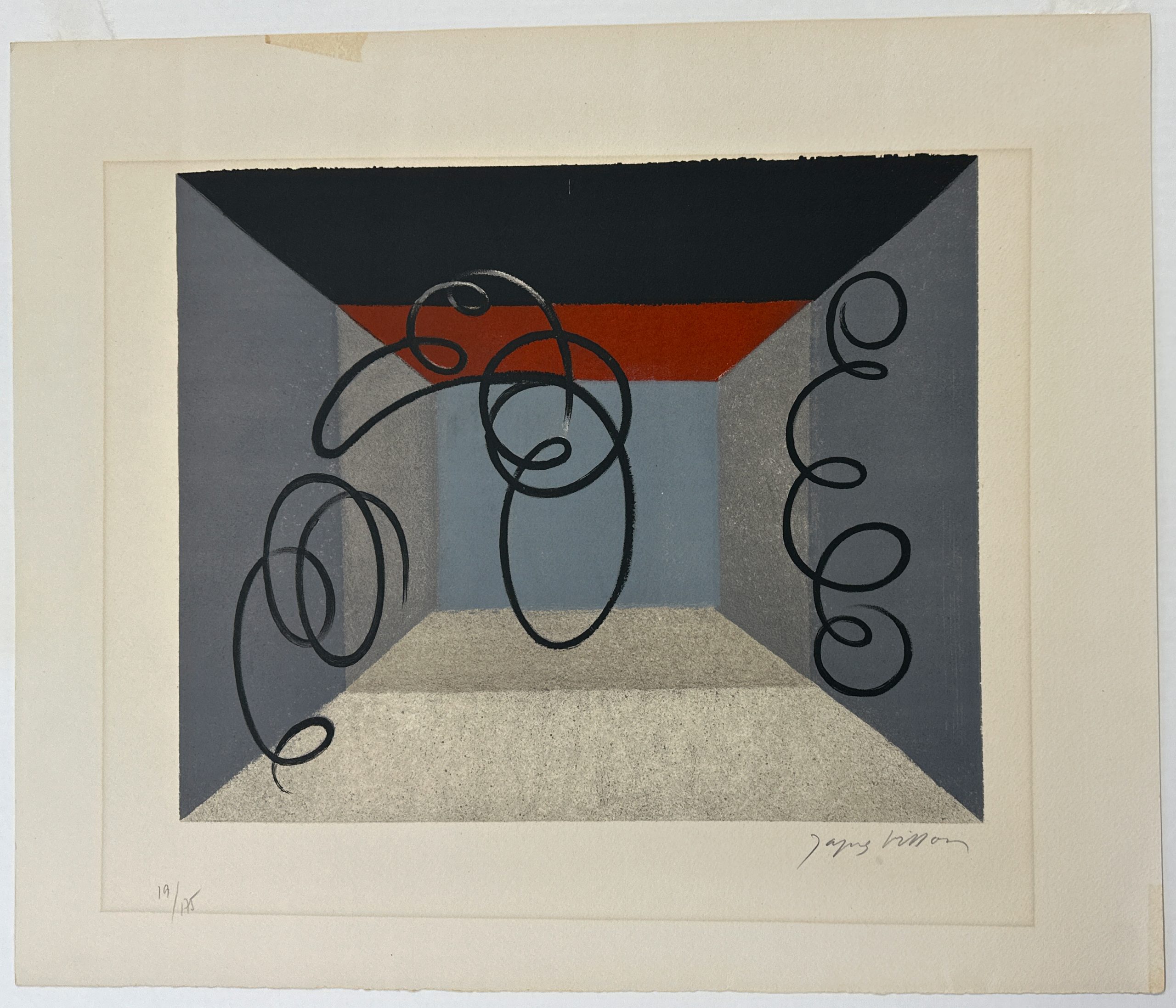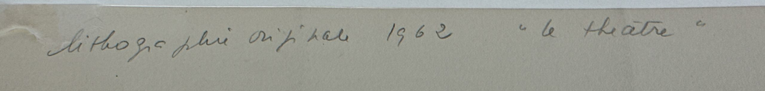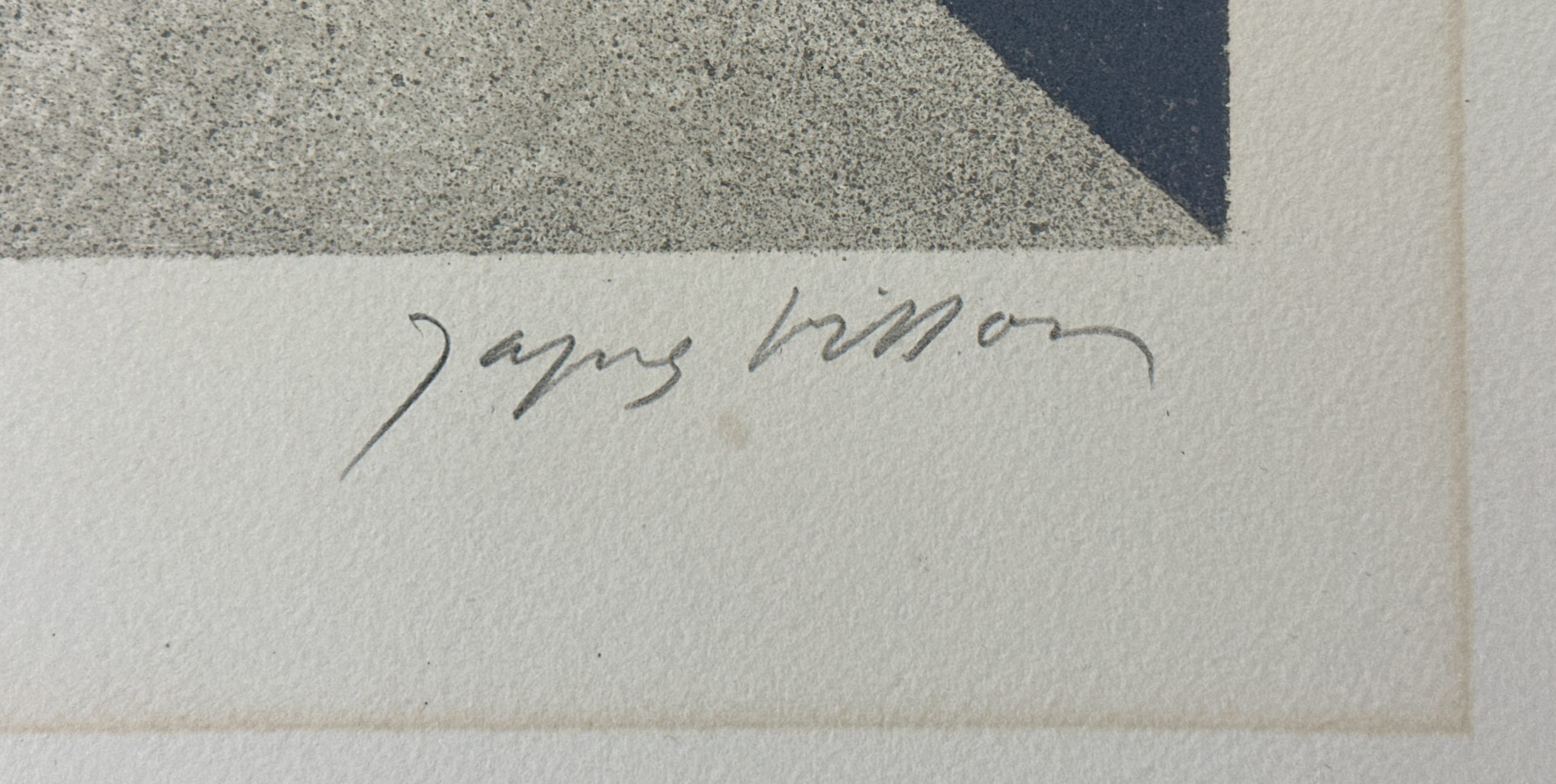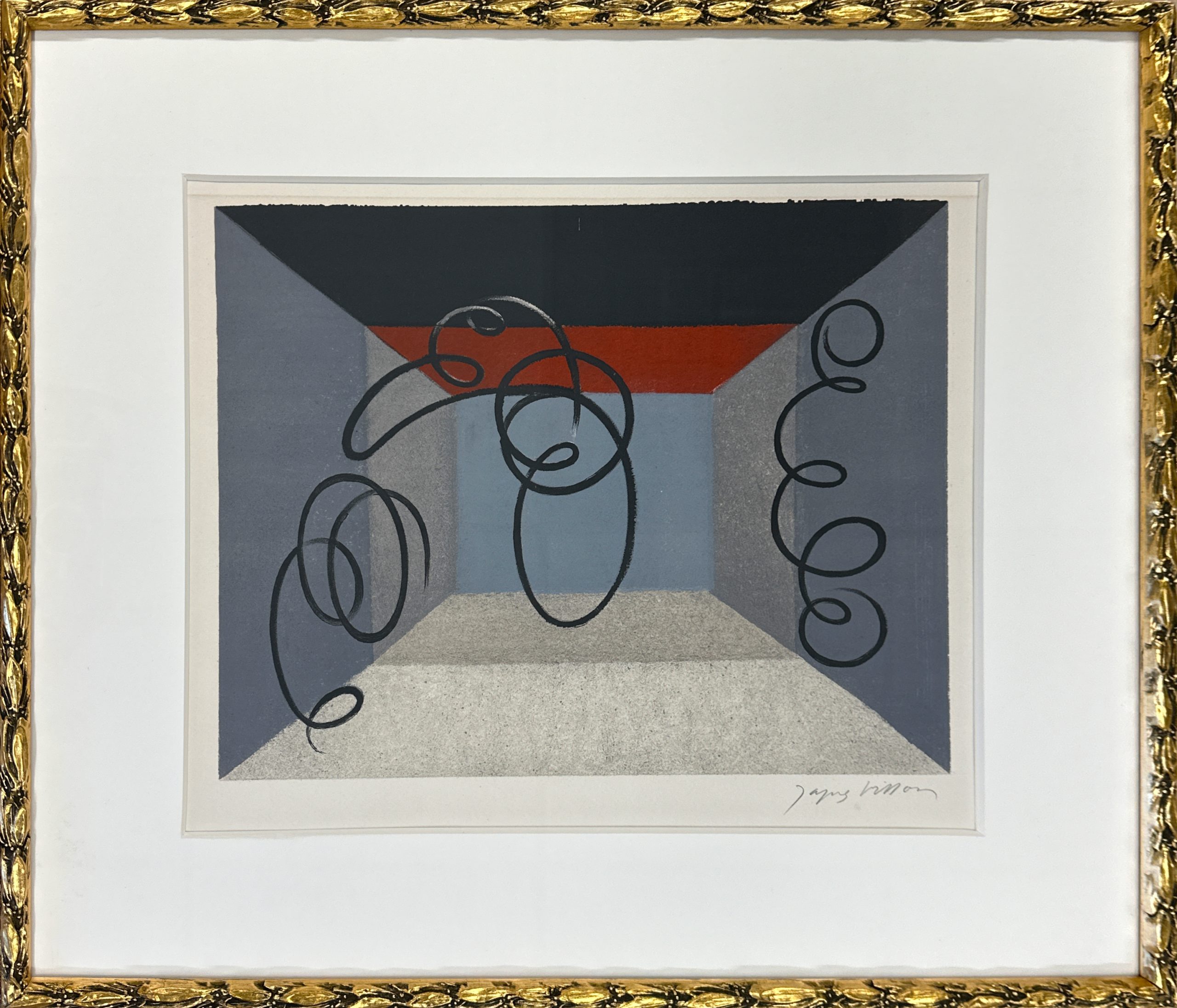 A semi-abstracted portrayal of highly-abstracted figures on a stage, rendered primarily in cool and dark colors. This example is from the “Huit Lithographies” portfolio by Lionello Venturi and Jacques Villon, published in an edition of 175. It is not from the separate printing which was made in an edition of 225.